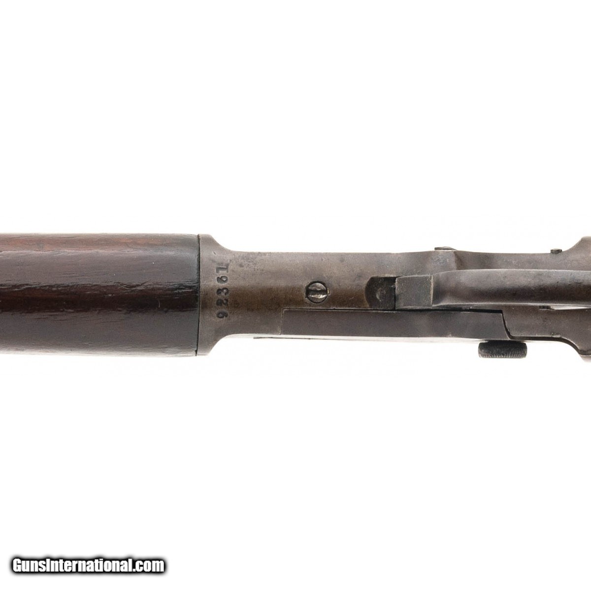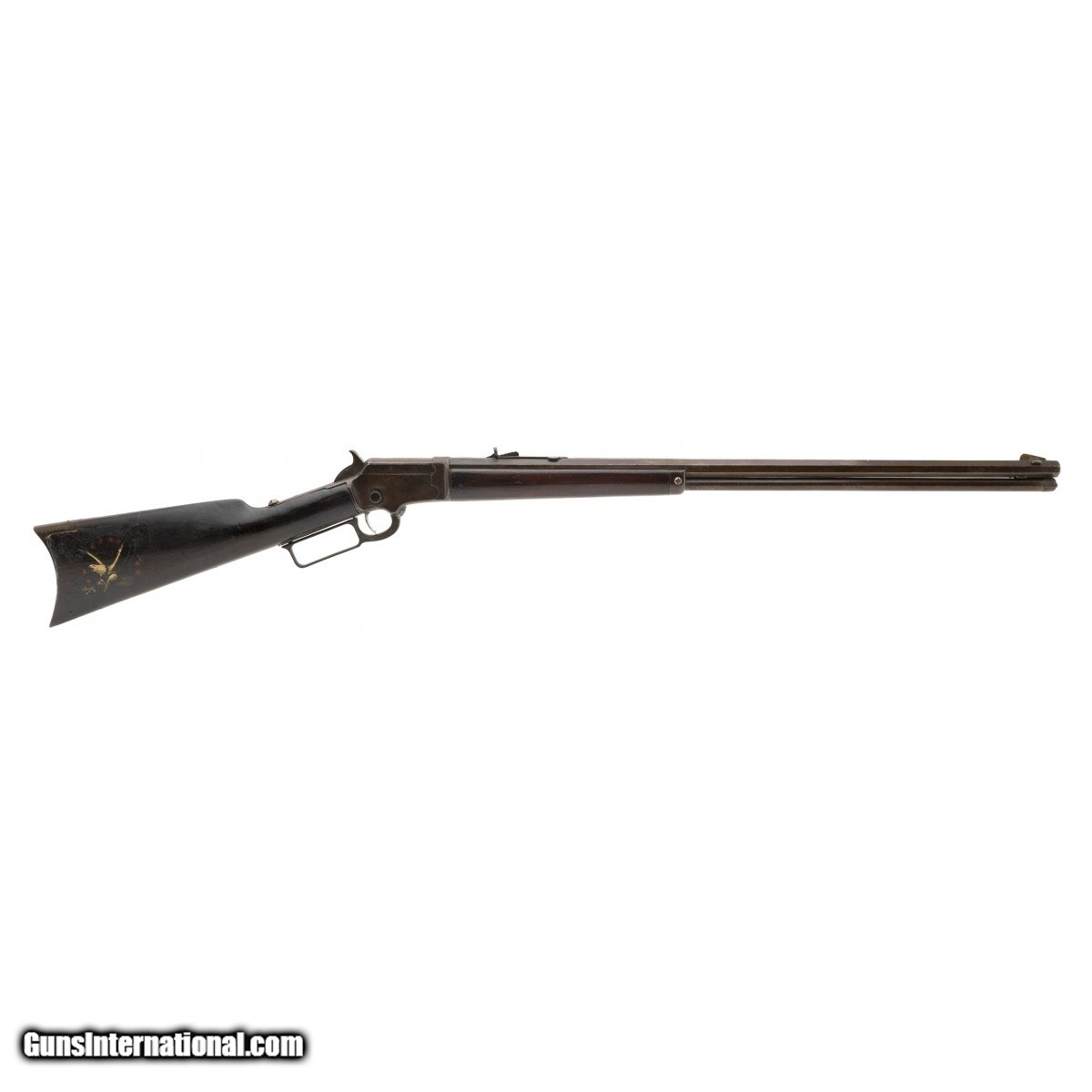 Description: " SN:92361. Second variation manufactured in 1894. Top of receiver is marked ""Marlin Safety"". Barrel is 24"". Bore has strong rifling with a couple minor pits. Tang has a replacement screw. Stock has a decal of an American Eagle in flight. Metal has a brown patina. All markings are visible. Fair overall condition. SOLD |