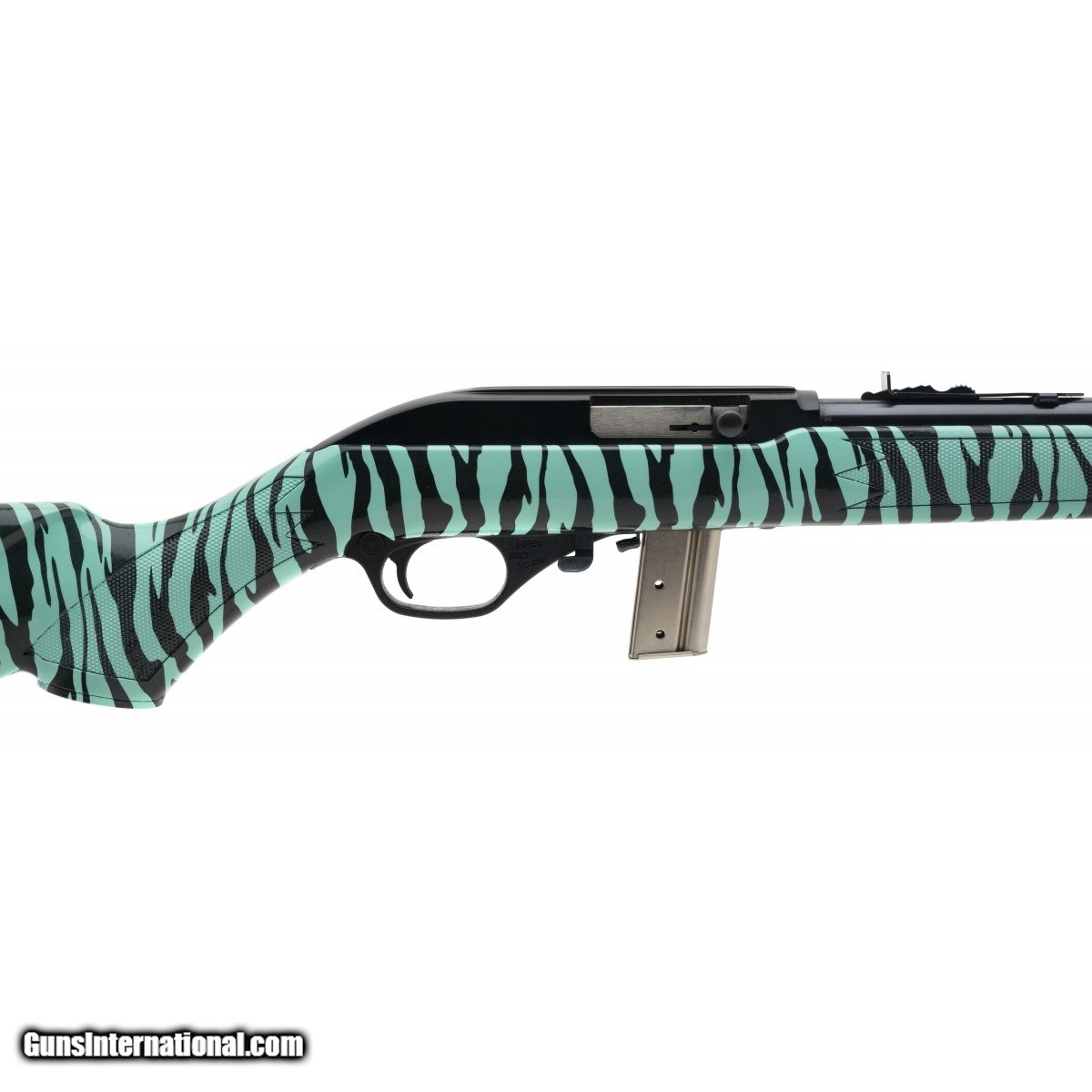 Description: " SN:MM18843Q. Modern production, .22Long rifle with a 18"" barrel. Bore is in excellent condition, Semi-auto rifle with tiffany blue stock and zebra print. Overall condition is very good. (Consignment) SOLD |