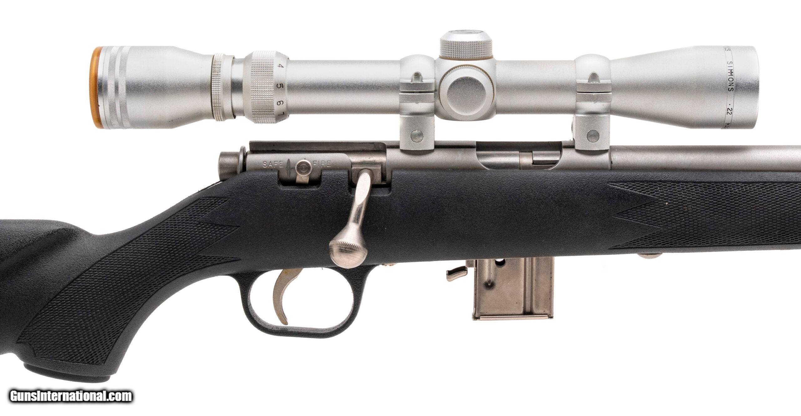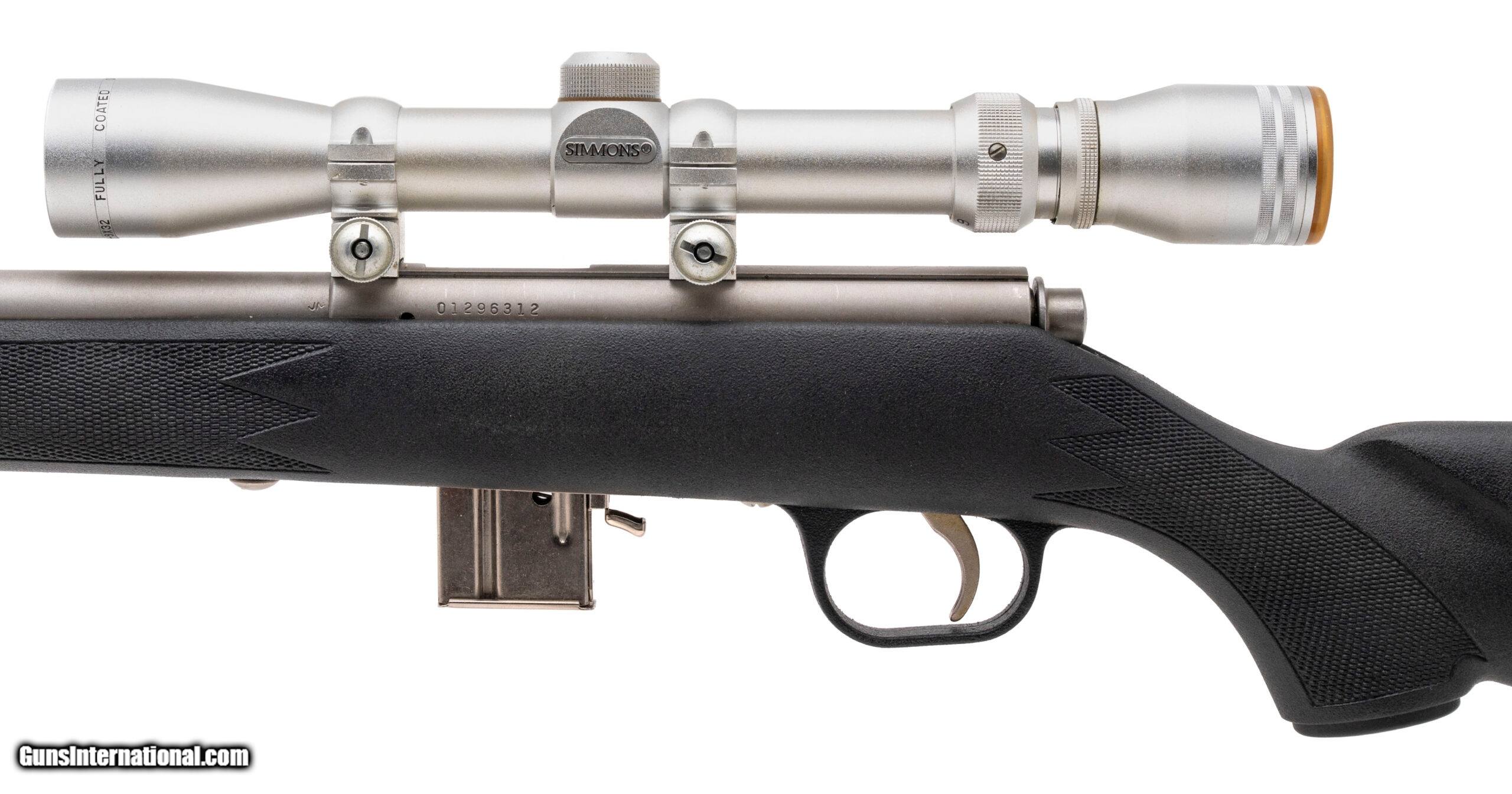 Description: "SN: 01296312. Modern production, .22 WMR with a 22"" micro-groove barrel. Bore is excellent. Bolt-action rimfire rifle with a Simmons Model 1037 3-9x32 scope, satin stainless steel finish, and checkered synthetic stock. Finish shows minor handling marks throughout. Overall condition is very good. Price: $449.95 Contact Seller |
