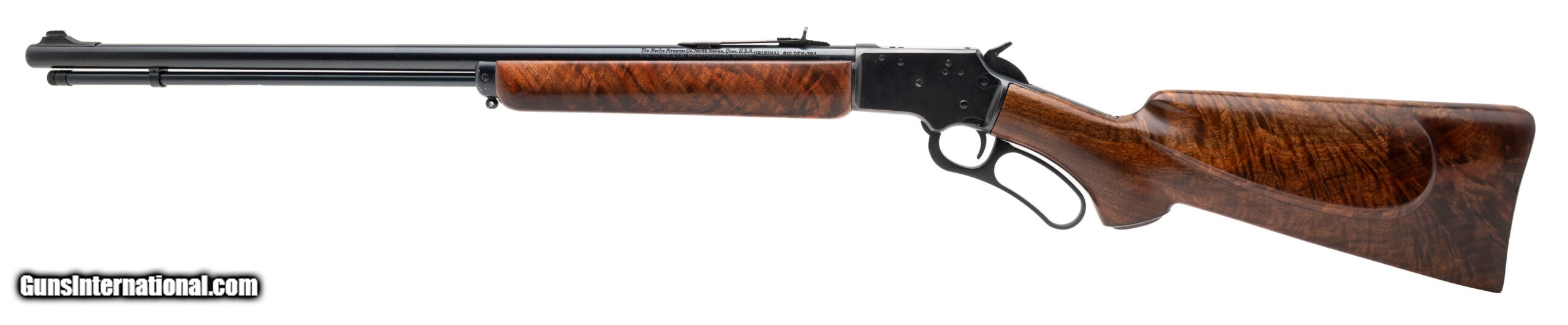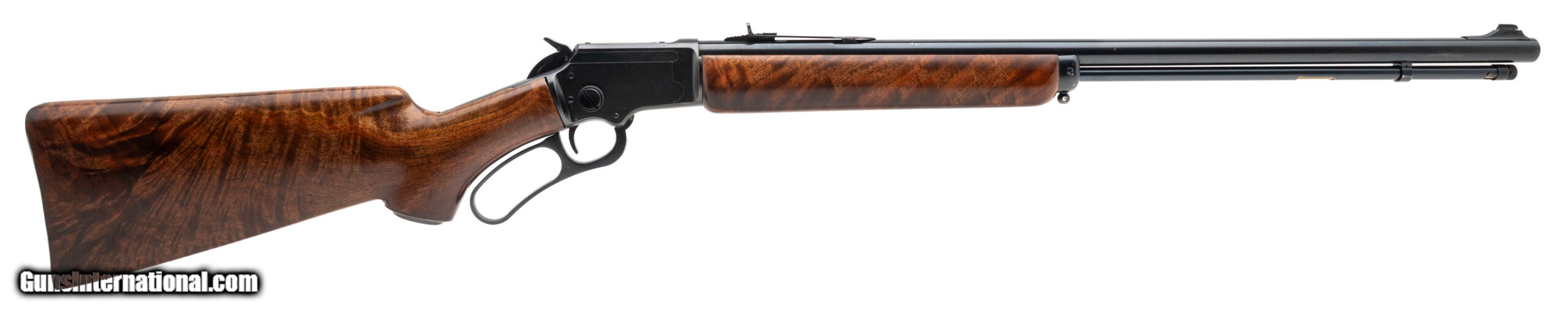 Description: "SN: 20308069. Made in 1980, .22 caliber with a 24"" barrel. JM stamped blued lever action rimfire rifle. Has a custom deluxe grade walnut stock with cheekpiece and checkered steel buttplate. A beautiful piece, in excellent condition. SOLD |