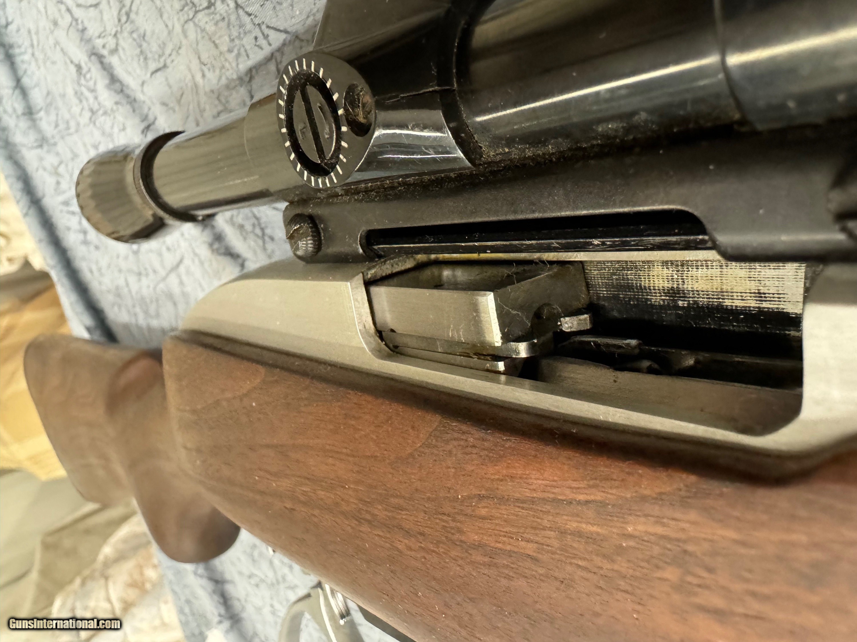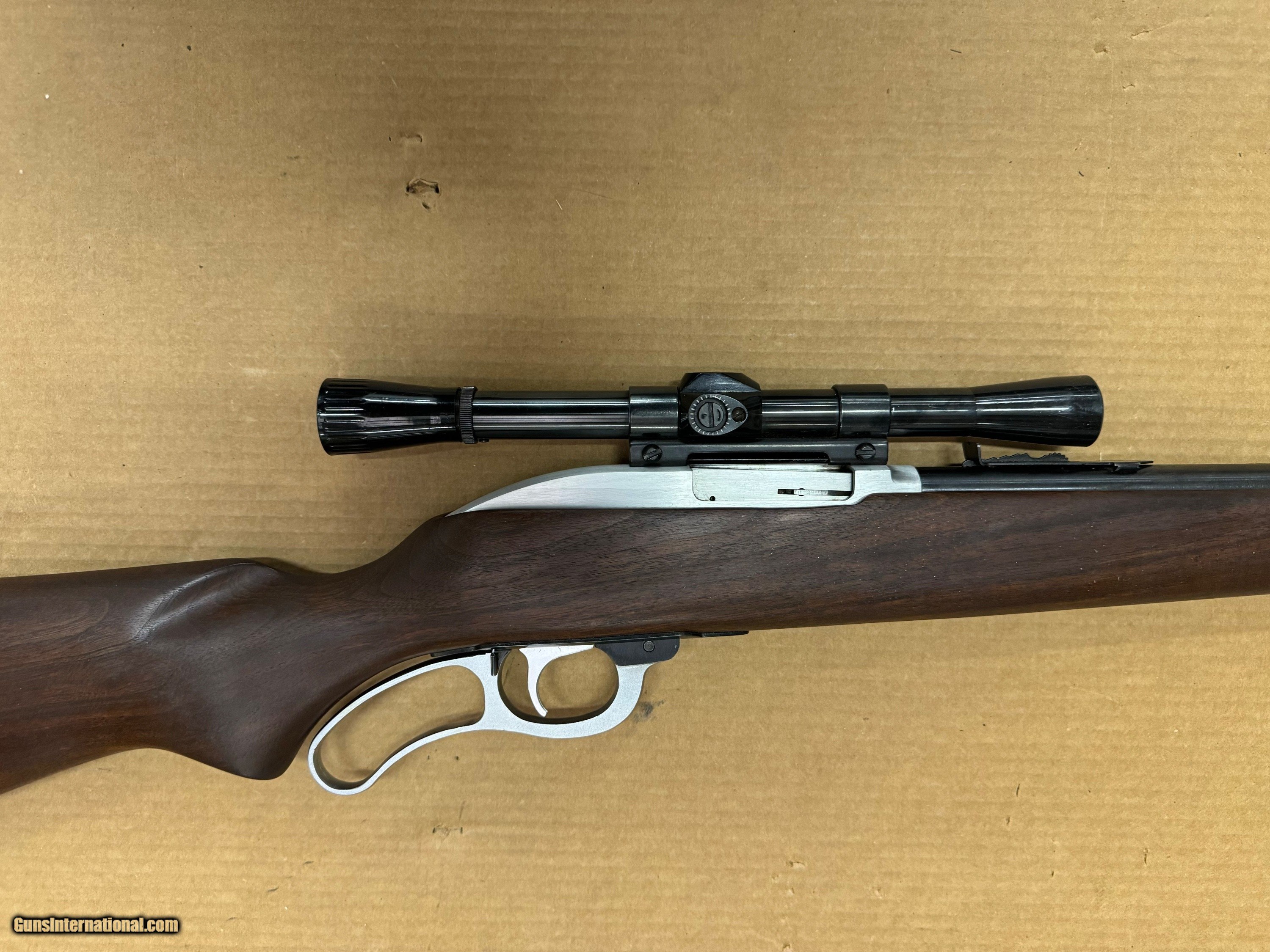 Description: This is a Marlin 57, 22 lr caliber. No serial number. It has a Weaver 22 Tip-Off scope mount and Weaver C4 scope which is not very good by modern standards, but is useable and fits the time of the rifle. I bought it in an online - it showed a lot of photos, but none of the defects. There is wear and bluing loss on the barrel and magazine tube at the tube support and poorly touched up. I never tried to improve this area- it is easily visible. The black finish on the receiver was chipped in places. Since the receiver is allloy, I decided to remove what was left of the original finish and leave it with a satin aluminum look. The lever and trigger are plated (nickel ?). It was that way when I bought it. The stock was a little beat up so I refinished it-good but not great. There is some very light pitting near the end of the barrel and magazine tube. See the photos for all these things. I fired it eight rounds a few days ago and it worked perfectly. This one of the short stroke levermatics. It is a good working 22 with a not so pretty mag tube and barrel. Shipping will be $50. SOLD |