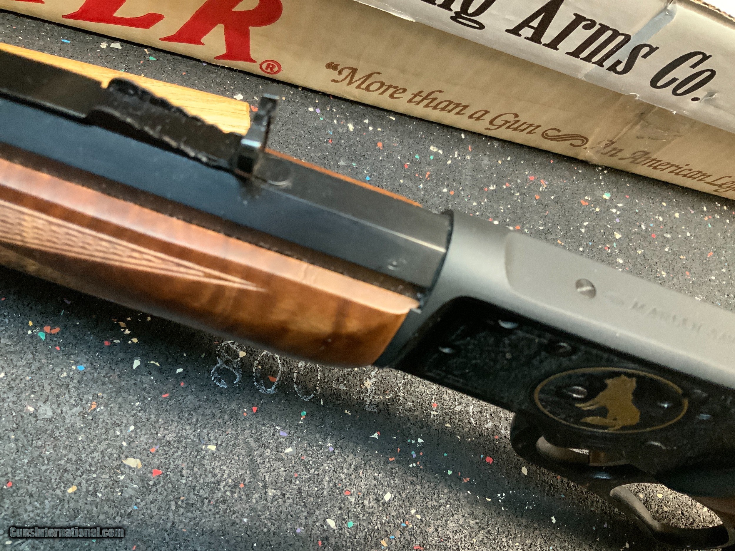 Description: (Sale Pending)Marlin 1897 Century Limited edition of the classic Marlin lever action in 22 S,L, L Rifle. Barrel is half round half octagonal. Wood is gorgeous on this one. Gold enlay of a fox on the left side of the receiver and 100 year century limited gold on the other. Estate Gun that appears unfired. Two small safe dings pictured are the only defects. No box or papers unfortunately, just a beautiful classic 22 rifle. Pictures show what you get. Please add $50 for shipping and insurance to your FFL. If your FFL dealer will not except from a private party please add $20 to the cost of shipping to cover my FFL dealer transfer fee. SOLD Curio/Relic: Yes Rifle Caliber: .22 Long Rifle Manufacturer: Marlin Model: 1897 Barrel Length: 24” Condition: Excellent Metal Condition: Excellent Wood Condition: Very Nice Bore Condition: Excellent Action: Lever Manufacture Date: 1997 Engraving: Yes |