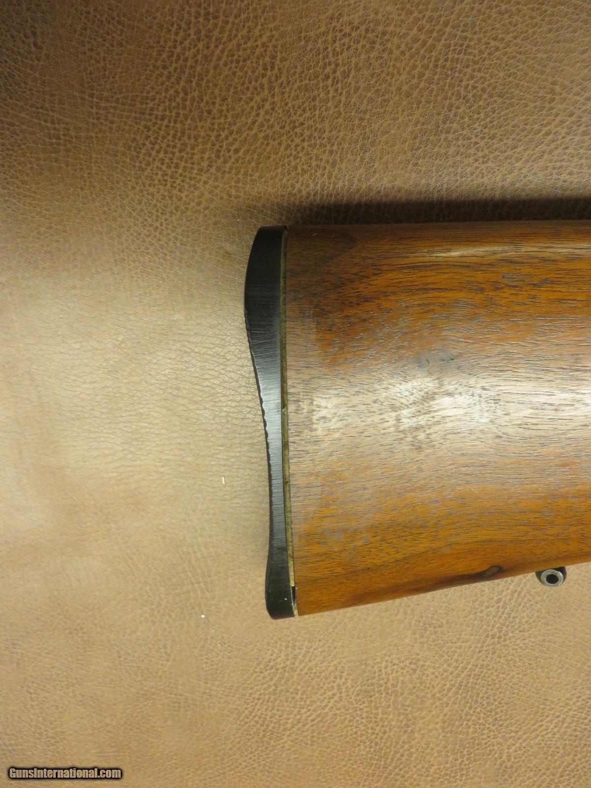 Description: .22 S.L.L.R. has 20 inch barrel with original sights missing the front hood. T prefix serial number from 1960. Gold trigger and original scope mounting base. Non checkered walnut with sling swivel studs and original butt plate. The white line spacer of butt plate has deteriorated. Blue is 95% and the wood is near 95%. SOLD |