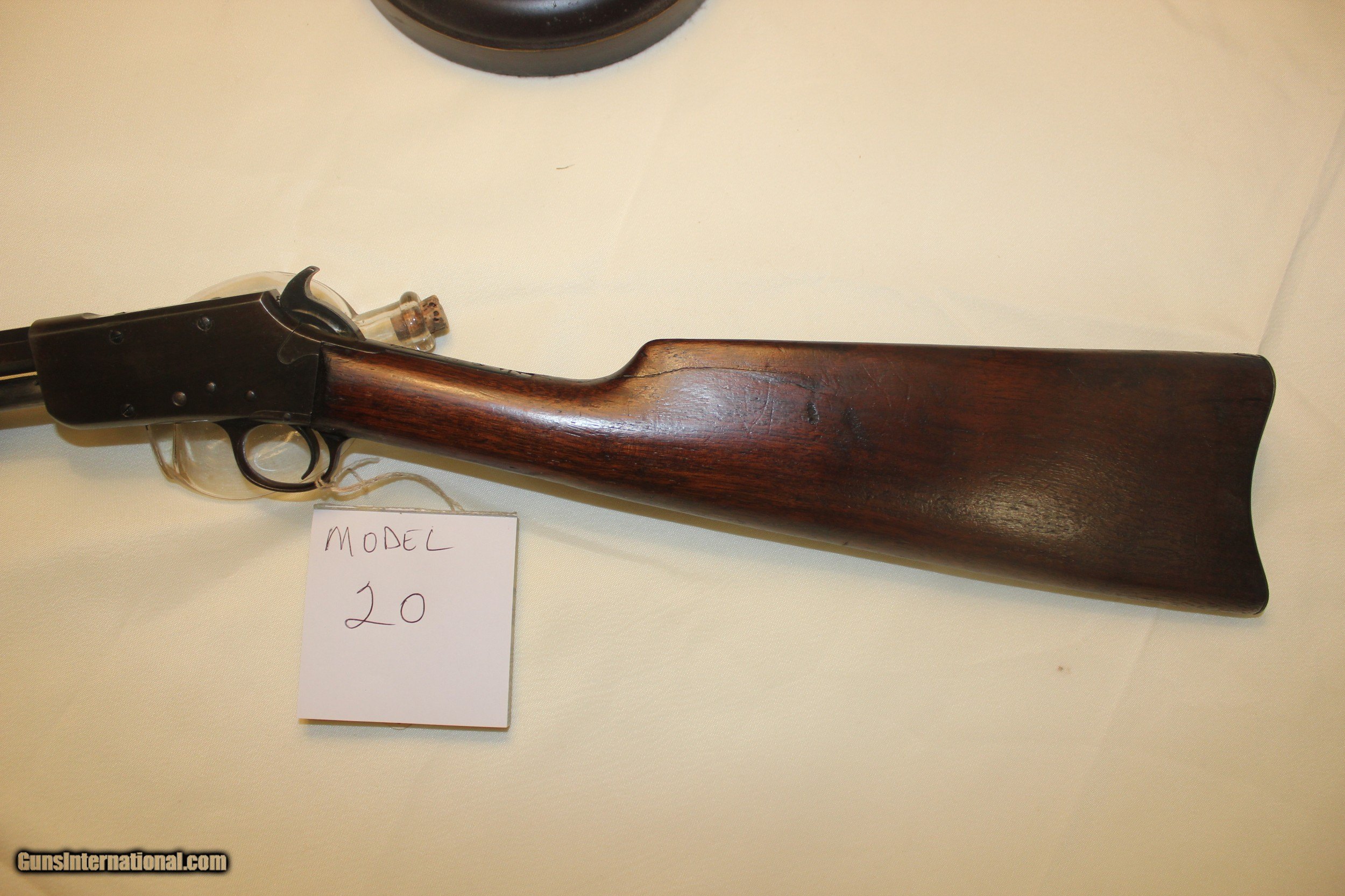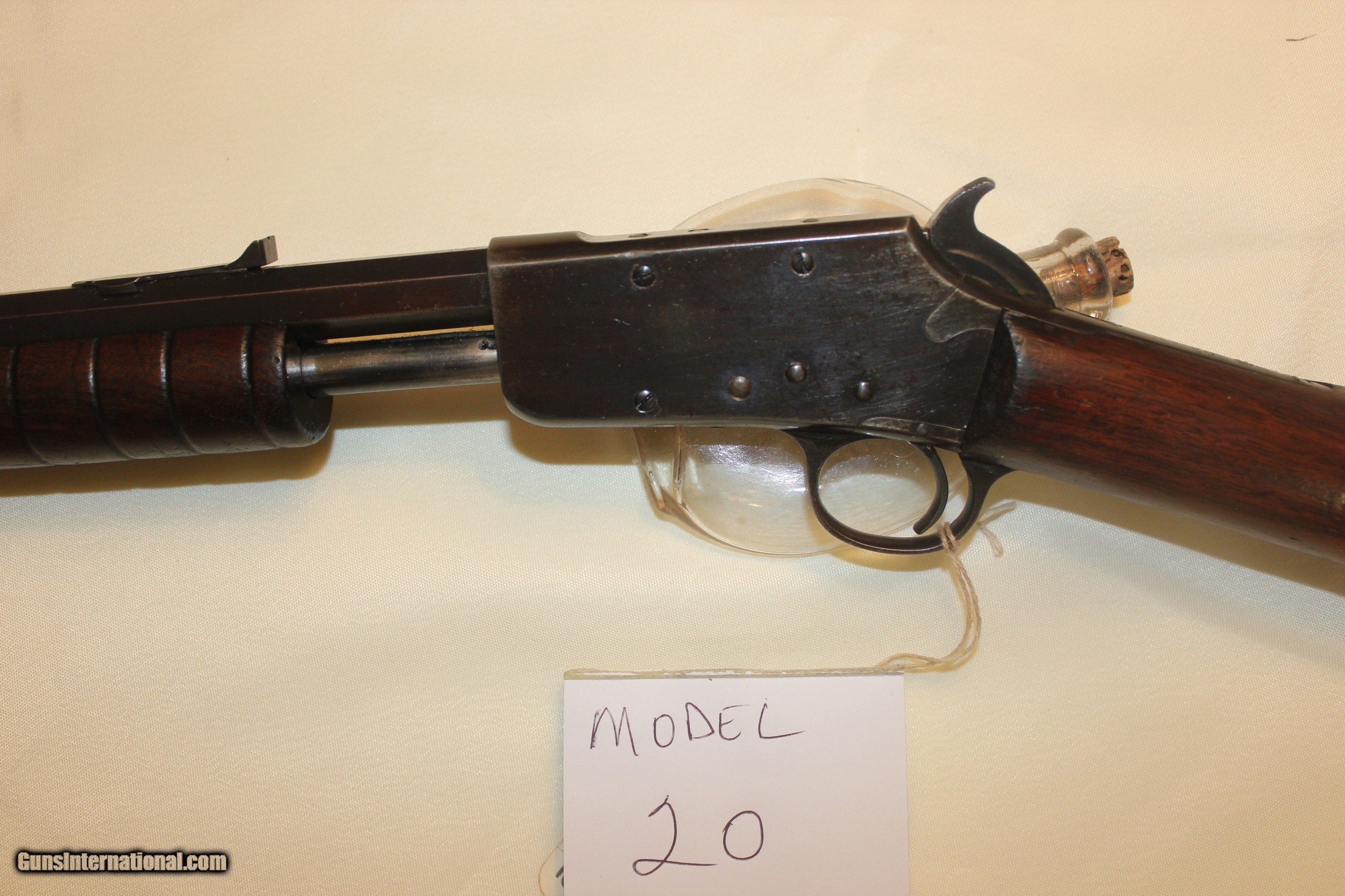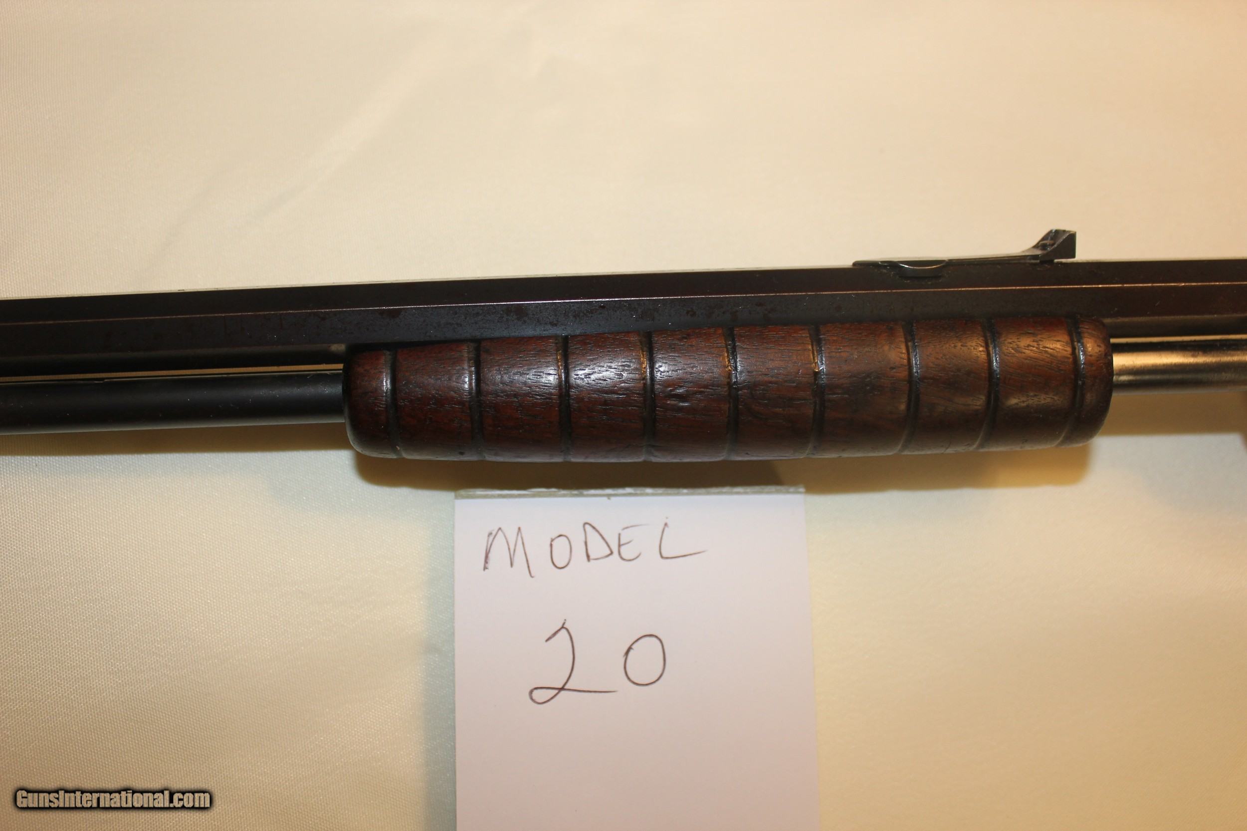 Description: Marlin Model 20 slide action .22. Mfg 1907 - 1911. 23 in. barrel. This gun is functioning properly and an excellent shooter. The bore is in excellent condition. There were a couple cracks in the stock but they have been completely repaired and the stock is tight as a drum. (there's no pin in the stock - and no pin needed) The gun is all original as far as I can tell. There's little to no bluing left on the metal - but overall I would say the metal is in very good condition. This is NOT a gun that was over-shot/abused but any means. These slide actions are getting tough to find and understandably so.....they're very well built and about as much fun to shoot as anything. All fair and reasonable offers considered. C&R eligible. Shipping is $35. SOLD Curio/Relic: Yes Rifle Caliber: .22 Long Manufacturer: Marlin Model: 20 Bore Condition: exc |
