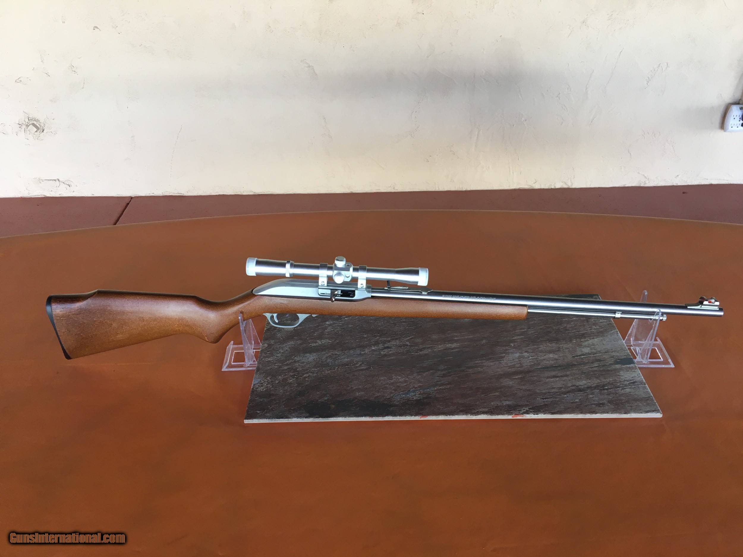 Description: Marlin Model 60 SB - Semi -Auto .22 LR Rifle - Smooth Monte Carlo pistol grip style Birch stock . 22 in. long Stainless Steel barrel with open SS rear sights and a orange front blade sight with open hood. Bore is clean and bright with distinct micro - grooves. SS tubular magazine with 14 LR capacity. Aluminum receiver is grooved for scope. 40.5 in. overall length. Wgt. 5.5 lbs. Includes a new Strong 4x20 scope with mtgs. and end caps. Butt plate in very good condition. Stock and forend has a few minor handling marks. The overall condition is very good . Very clean rifle does not appear to have had much use. The Stainless Steel model is basically a lifetime rifle that require minimal maintenance. Manufactured from 1993 to date. SALE PENDING AWAITING FINDS . All of our rifles have been cleaned and lubricated. We can ship to your FFL dealer at a flat rate of $50.00 S&I to lower 48 states. SOLD Rifle Caliber: .22 Long Rifle Manufacturer: Marlin Model: 60 SB Serial Number: 03192500 Barrel Length: 22 in. Condition: Very Good Metal Condition: Very Good Wood Condition: Very Good Bore Condition: Excellent Butt Pad: Very Good Weight: 5.5 lbs. Sights: Open / Blade |