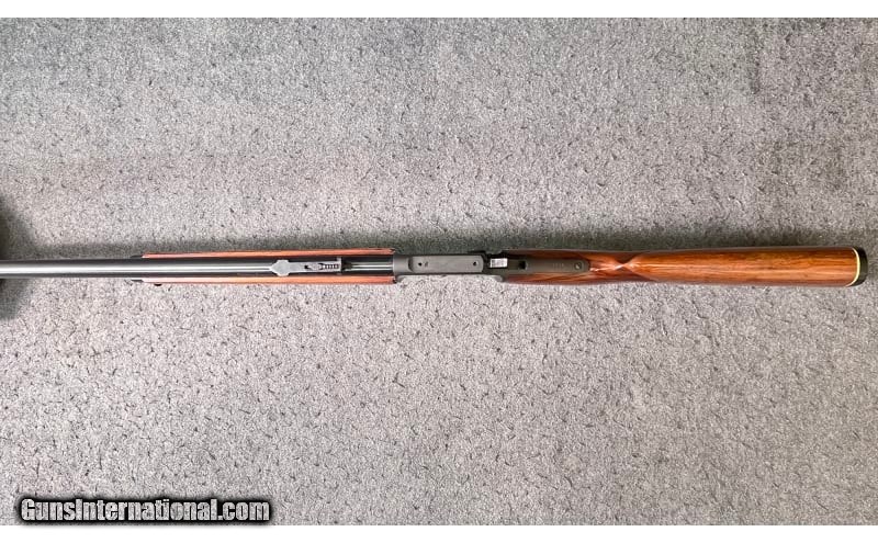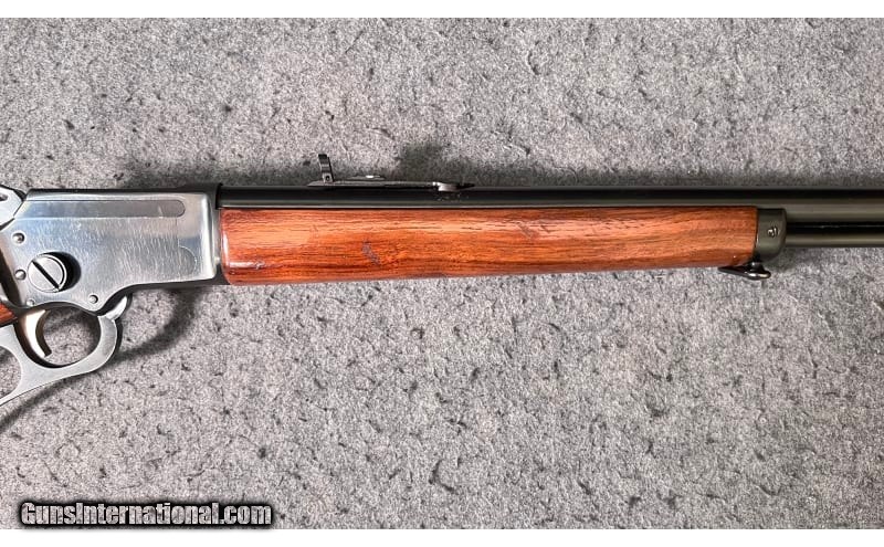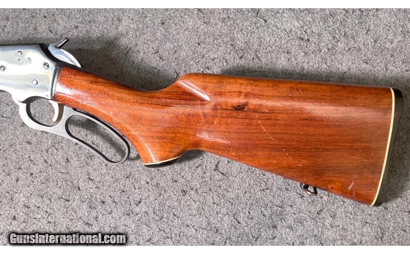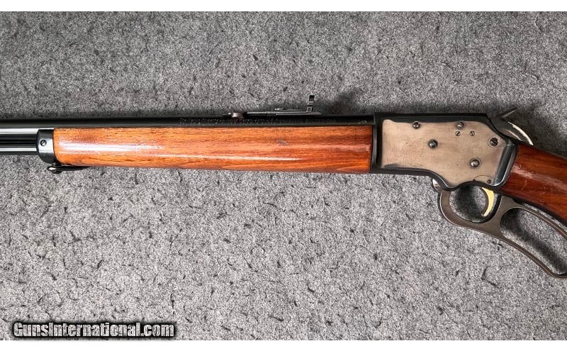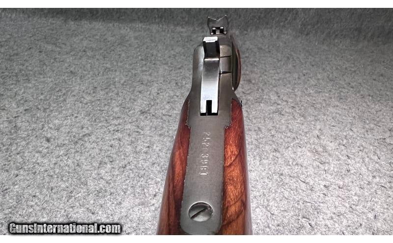 Description: This 1975 rimfire lever-action rifle is a Marlin Original Golden-39A chambered for .22 S, L, or LR. It features a "JM" stamp on the barrel showing it was manufactured by the original Marlin team. The 39A is still considered one of the finest examples of a lever .22 rifle, and one of the most accurate .22 rifles ever produced. It is also the best-selling lever rimfire in U.S. history. It has a fixed hooded blade front sight, a Butterfly U-notch adjustable rear sight, a serrated gold trigger, sling loops top and bottom, hard black plastic grip cap and butt plate, with ivory colored spacers, a tube-fed magazine. It features Marlin's proprietary Micro-Groove rifling in a 1 in 16 in right-hand twist. The receiver has been drilled and tapped for a scope mount. The overall bluing is in very good condition with only some slight loss near muzzle and with minor blemishes on either side of receiver. The Walnut wood finish is in generally good condition with a small mark on the fore arm, and a couple of scratches and marks on the butt stock. .22 Short/Long/Long Rifle SOLD Metal Condition: Overall bluing is in very good condition with only some slight loss near muzzle and with minor blemishes on either side of receiver Wood Condition: "Wood finish is in generally good condition with a small mark on fore arm, and a couple of scratches and marks on the butt stock Bore Condition: Bore is bright and shiny with Micro-groove rifling intact Barrels: 24" round barrel Triggers: Serrated golden trigger Stock Dimensions: "13½"" LOP, overall length 40"" Fore End: Smooth rounded hardwood fore arm Butt Pad: "Highest quality Walnut butt stock, original Marlin black hard plastic butt plate with ivory colored spacer, black hard plastic pistol grip cap with ivory colored spacer Weight: 6 lb 8 oz Sights: "Fixed hooded blade front sight, Butterfly U-notch adjustable rear sight Item Location: Wichita, KS |