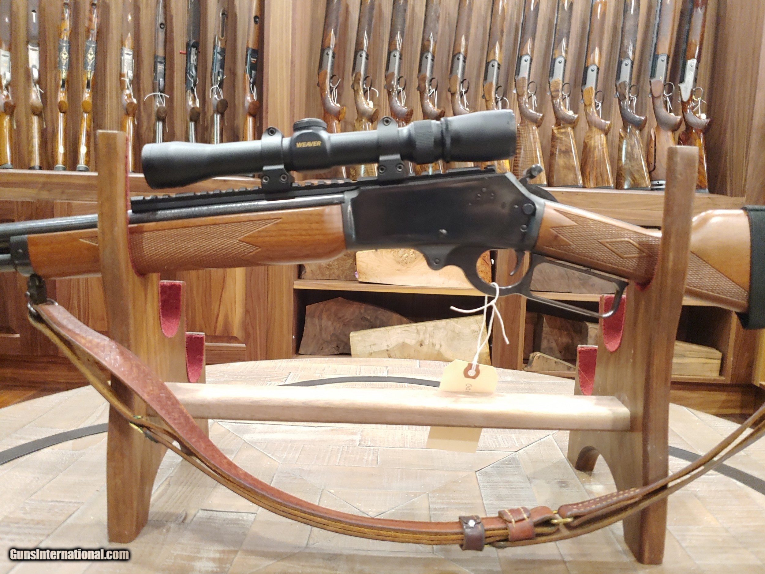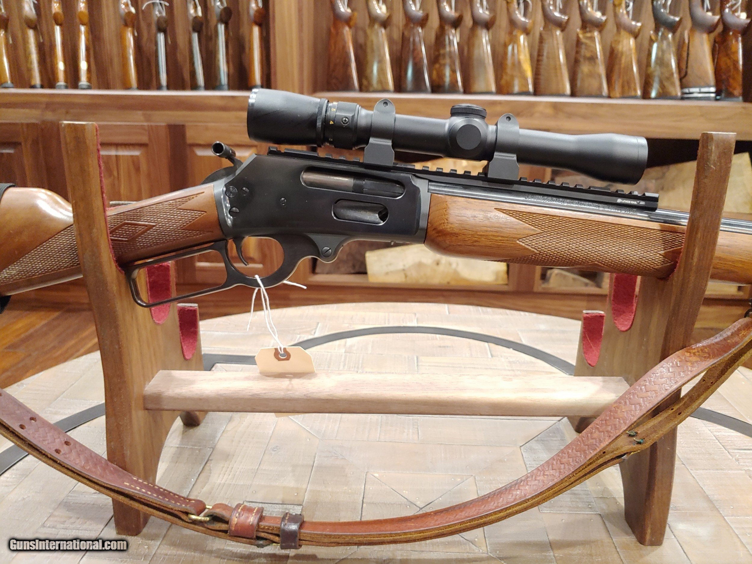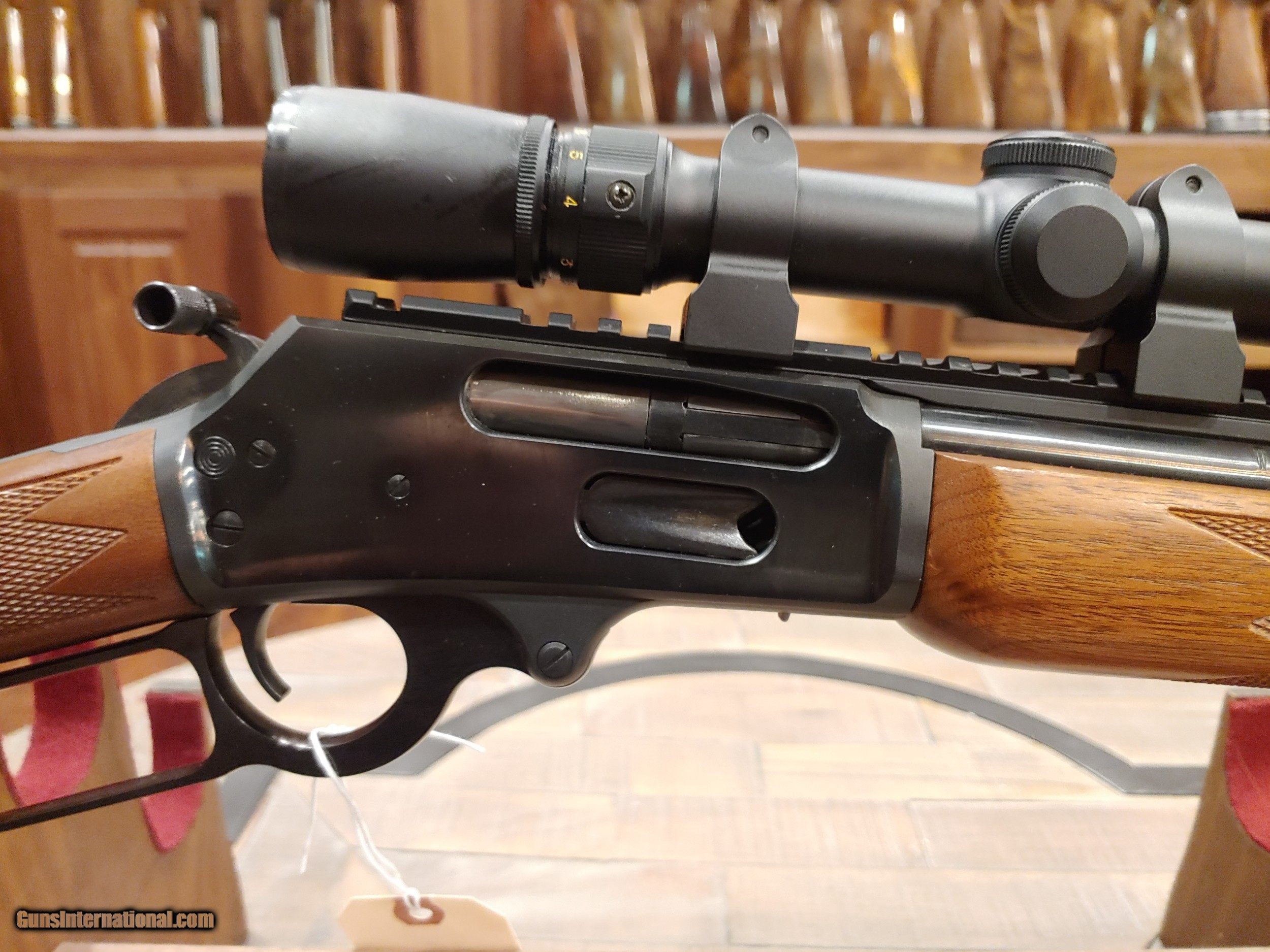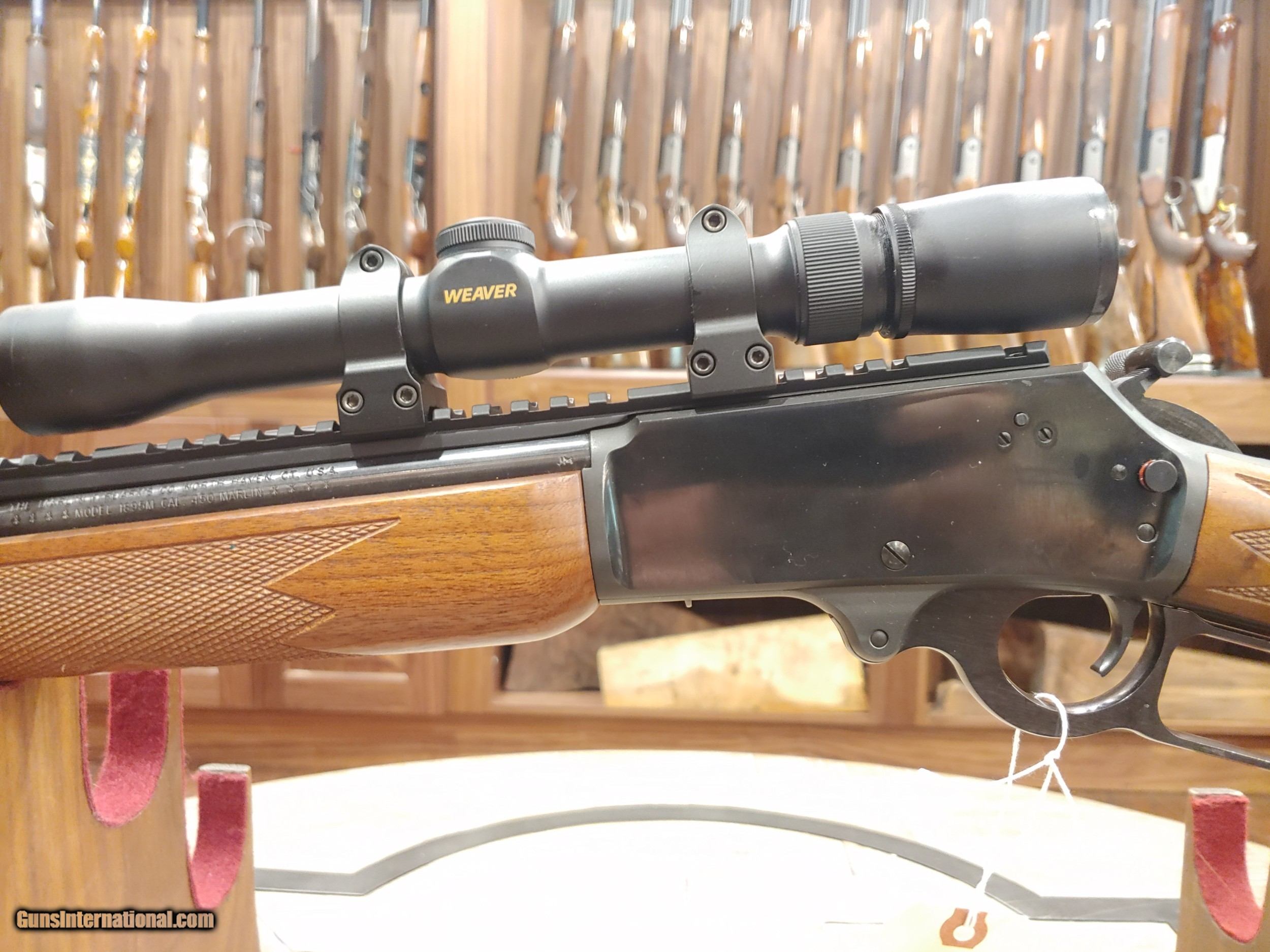 Description: This Marlin M1894 is an 18" lever-action rifle chambered in .450 Marlin rounds. It has an overall length of 36.75" and an LOP of 14". Features a blued barrel finish and a checkered wooden stock & forend. This gun is in great condition and comes with a Weaver RV-7 scope and a leather Lawerence sling.