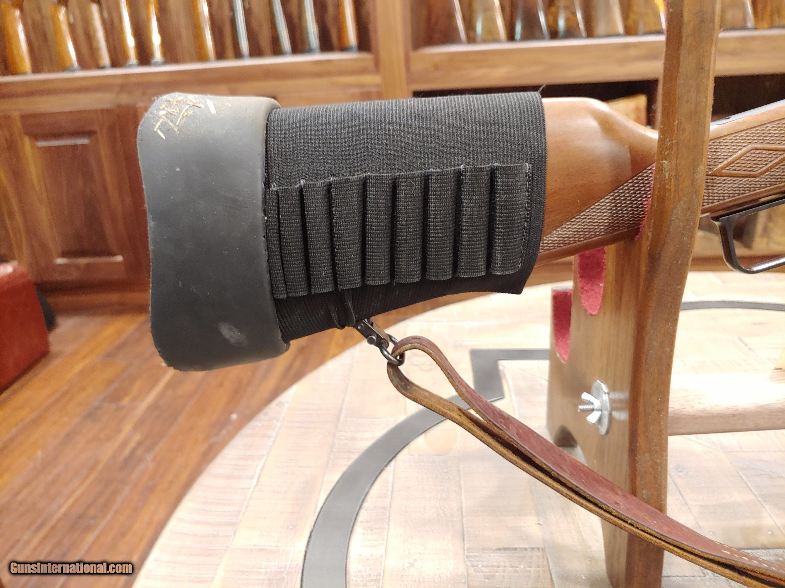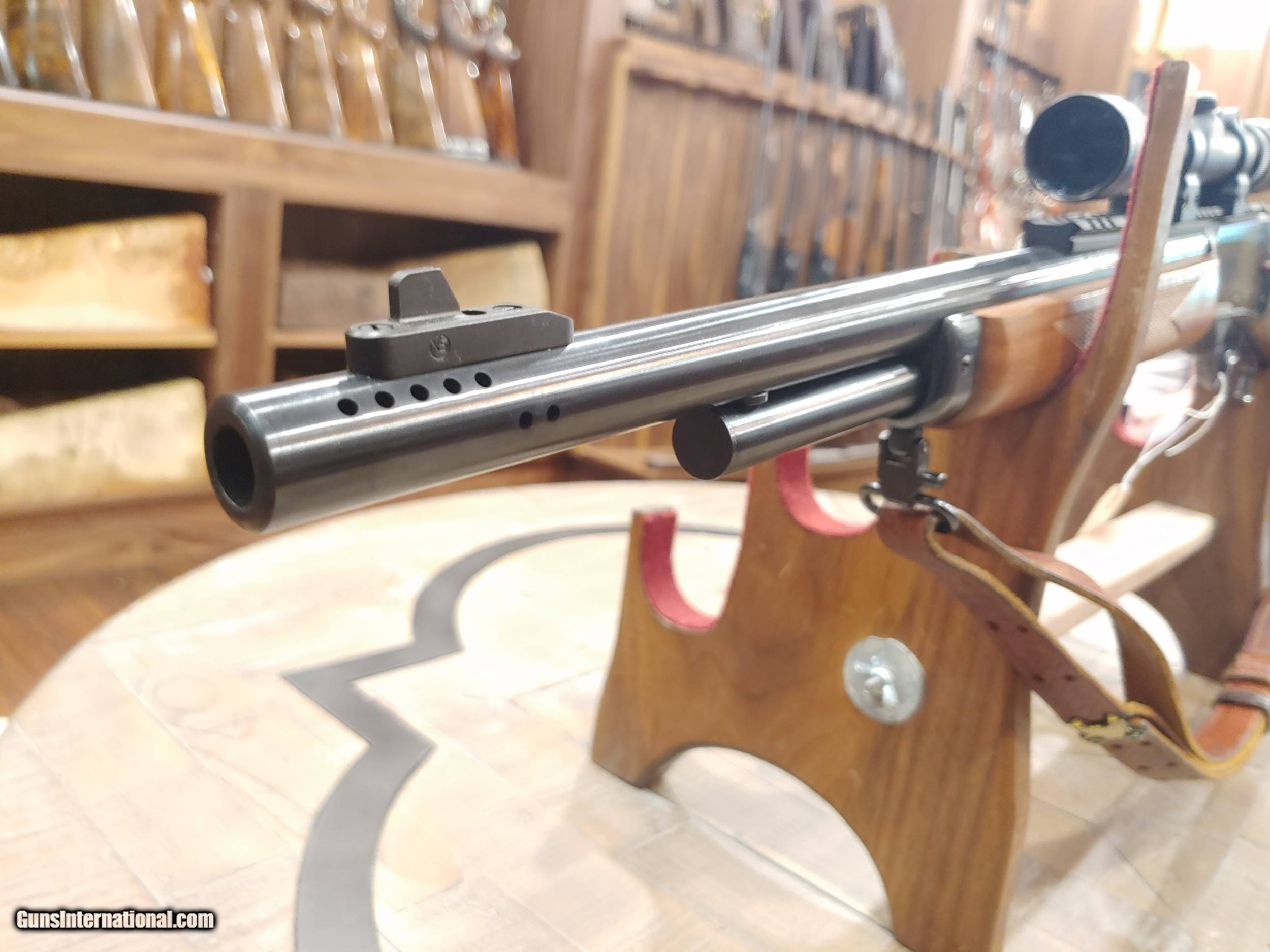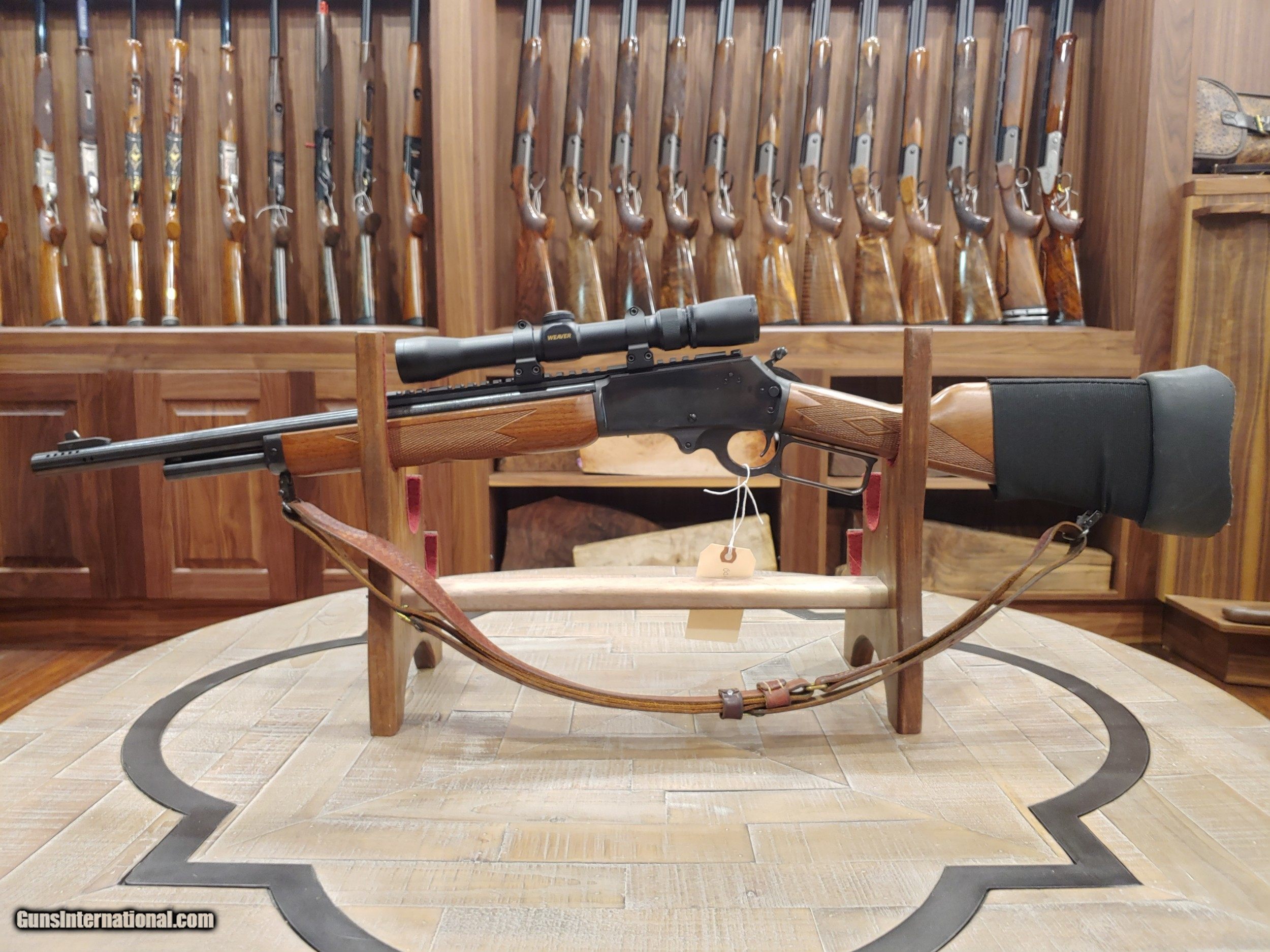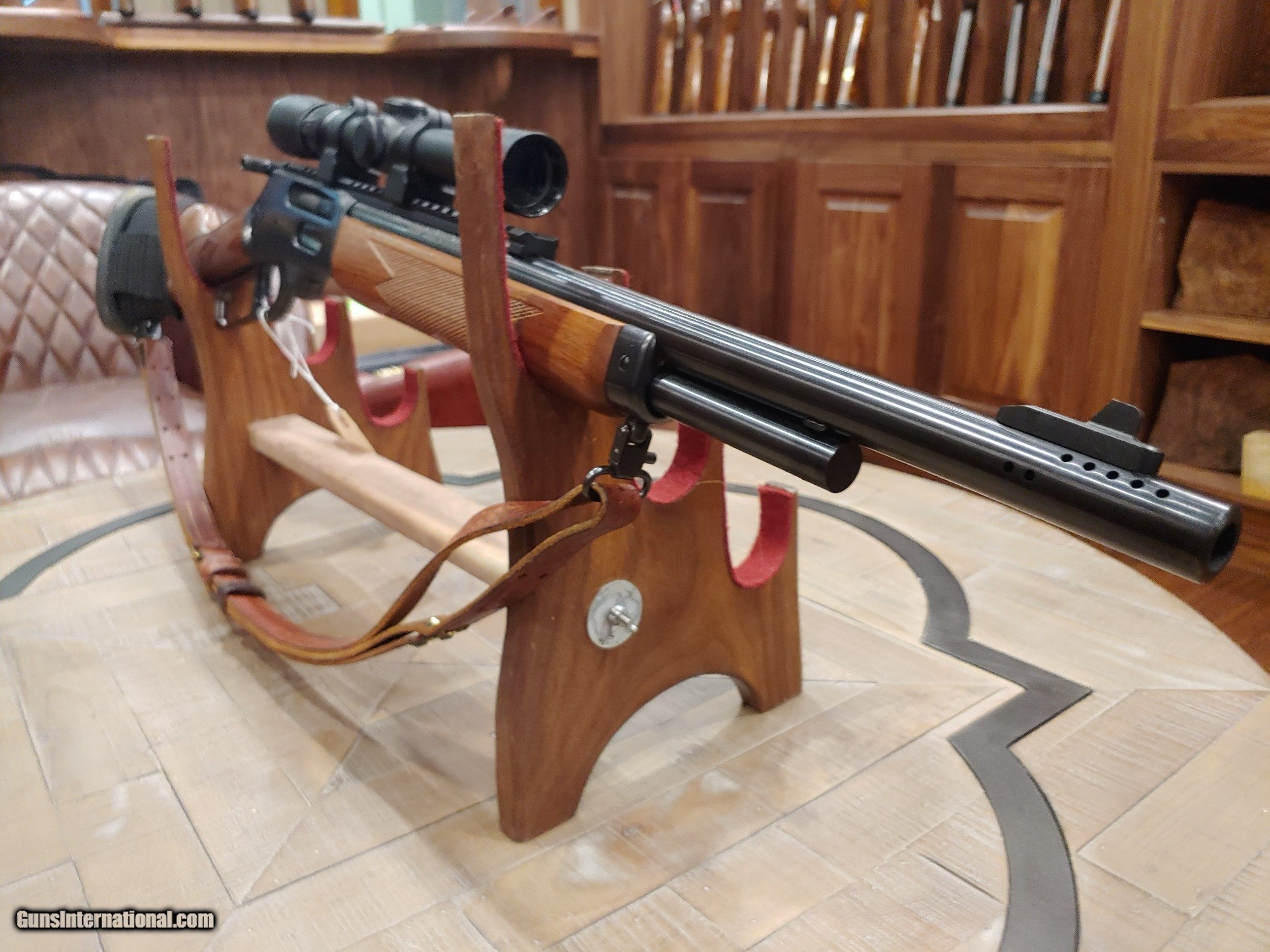 Description: This Marlin M1894 is an 18" lever-action rifle chambered in .450 Marlin rounds. It has an overall length of 36.75" and an LOP of 14". Features a blued barrel finish and a checkered wooden stock & forend. This gun is in great condition and comes with a Weaver RV-7 scope and a leather Lawerence sling.