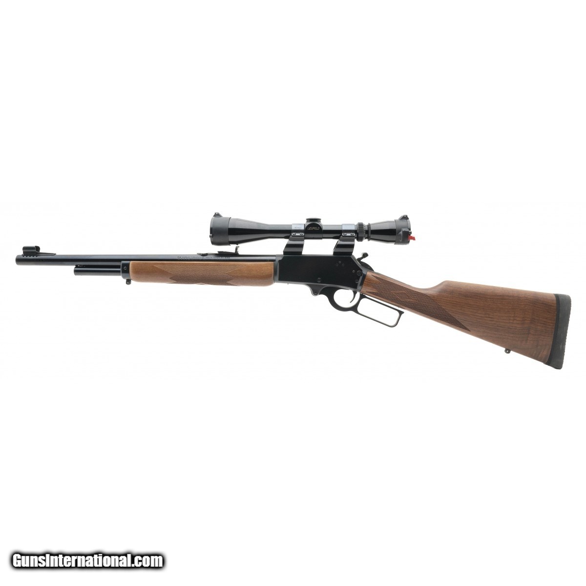 Description: " SN :99006281. Modern production. Chambered in .450 Marlin with a 18.5"" barrel, bore is excellent. Lever action rifle with blued finish, ported barrel, hammer extension, front hood bead sights and checkered wood furniture. Overall excellent condition. Comes with Leupold 3-9x40mm riflescope. (Consignment) SOLD |