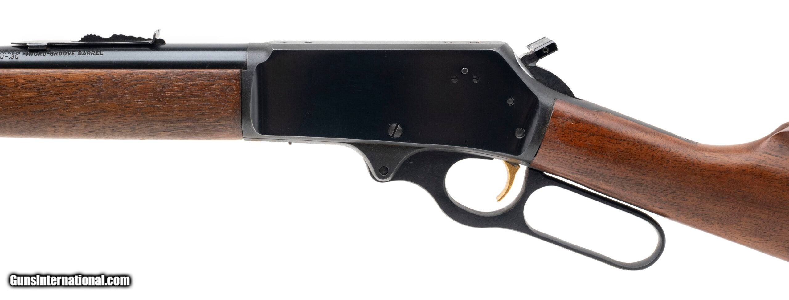 Description: "SN: W24744. Made in 1963, .30-30 WIN. with a 20"" micro-groove barrel. Bore is very good. Early model JM stamped lever-action rifle with a beaded front sight, adjustable semi-buckhorn rear sight, blued finish, and wood forend & stock. Finish & stock show minor marks. Overall condition is very good. SOLD |