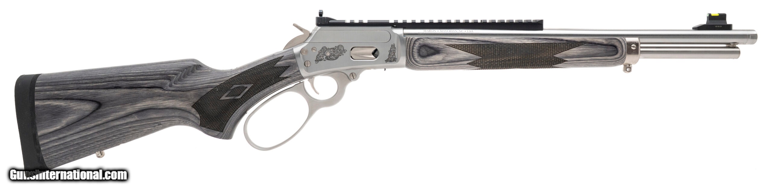 Description: "1 of 300 Made Custom Lever Action Rifle with a 16"" Threaded Barrel. Engraved Stainless Steel Finish, Laminate Wood Stock, Optic Rail, Fiber Optic Front & Ghost Ring Rear Sights, Side Gate, and Cross Bar Safety. Includes Certificate of Authenticity and CNC Coin. NEW. (STOCK PHOTO) SOLD |