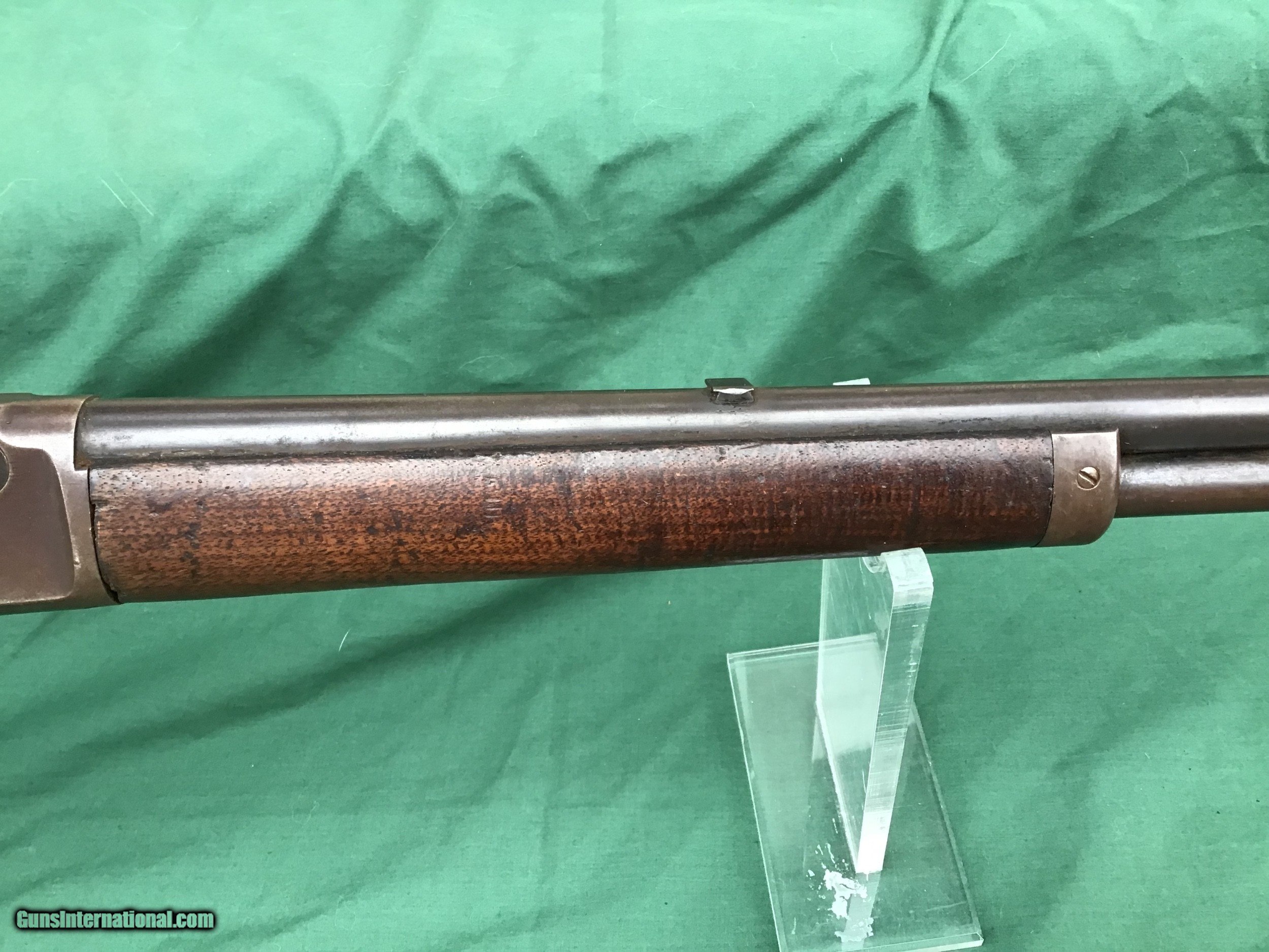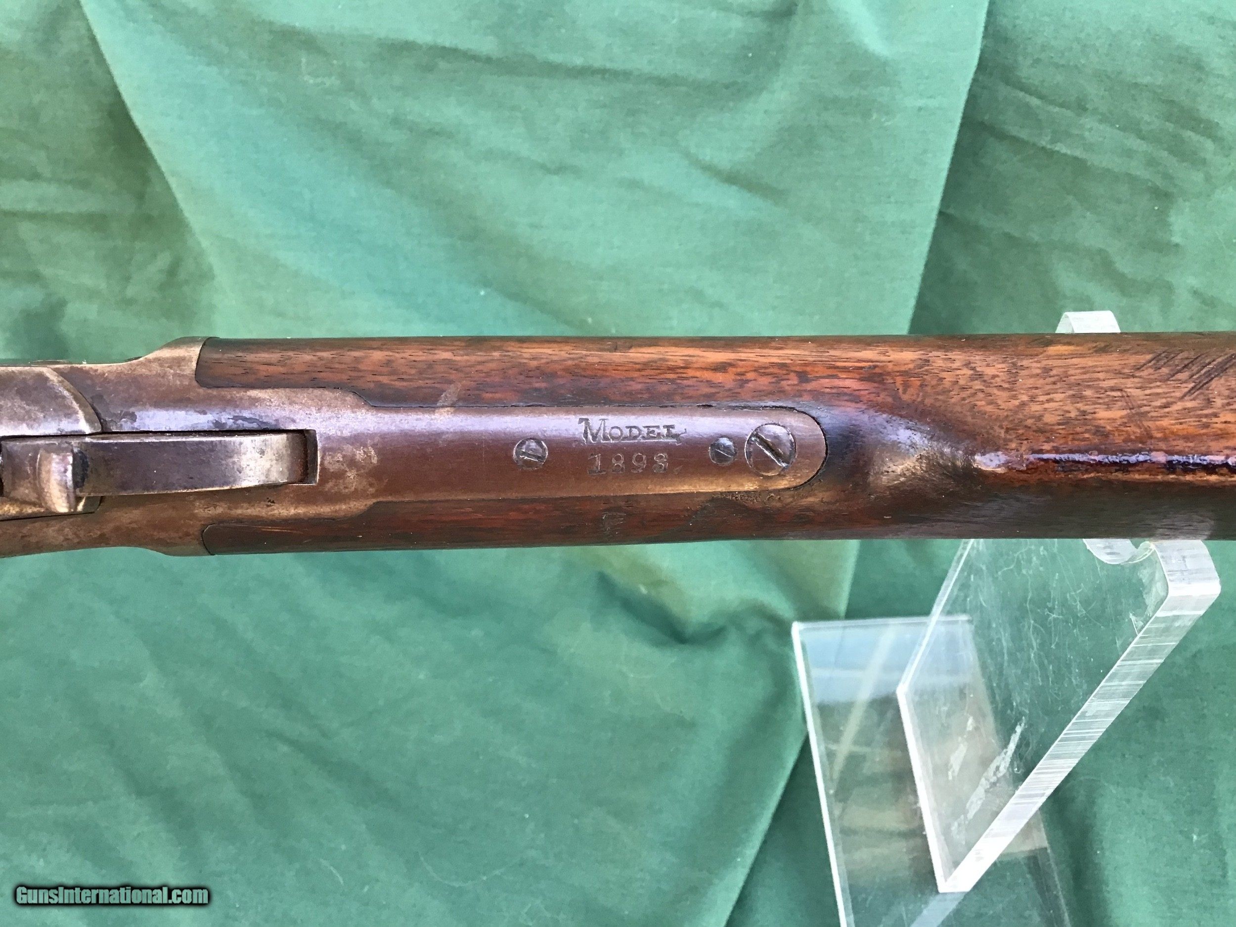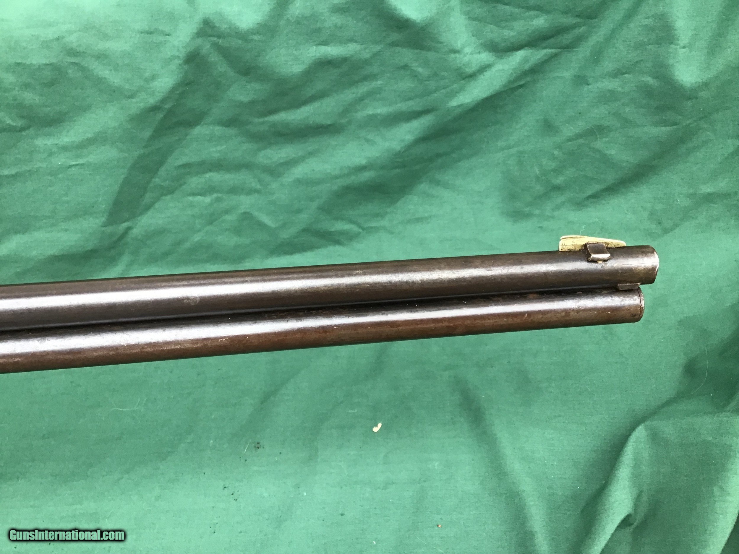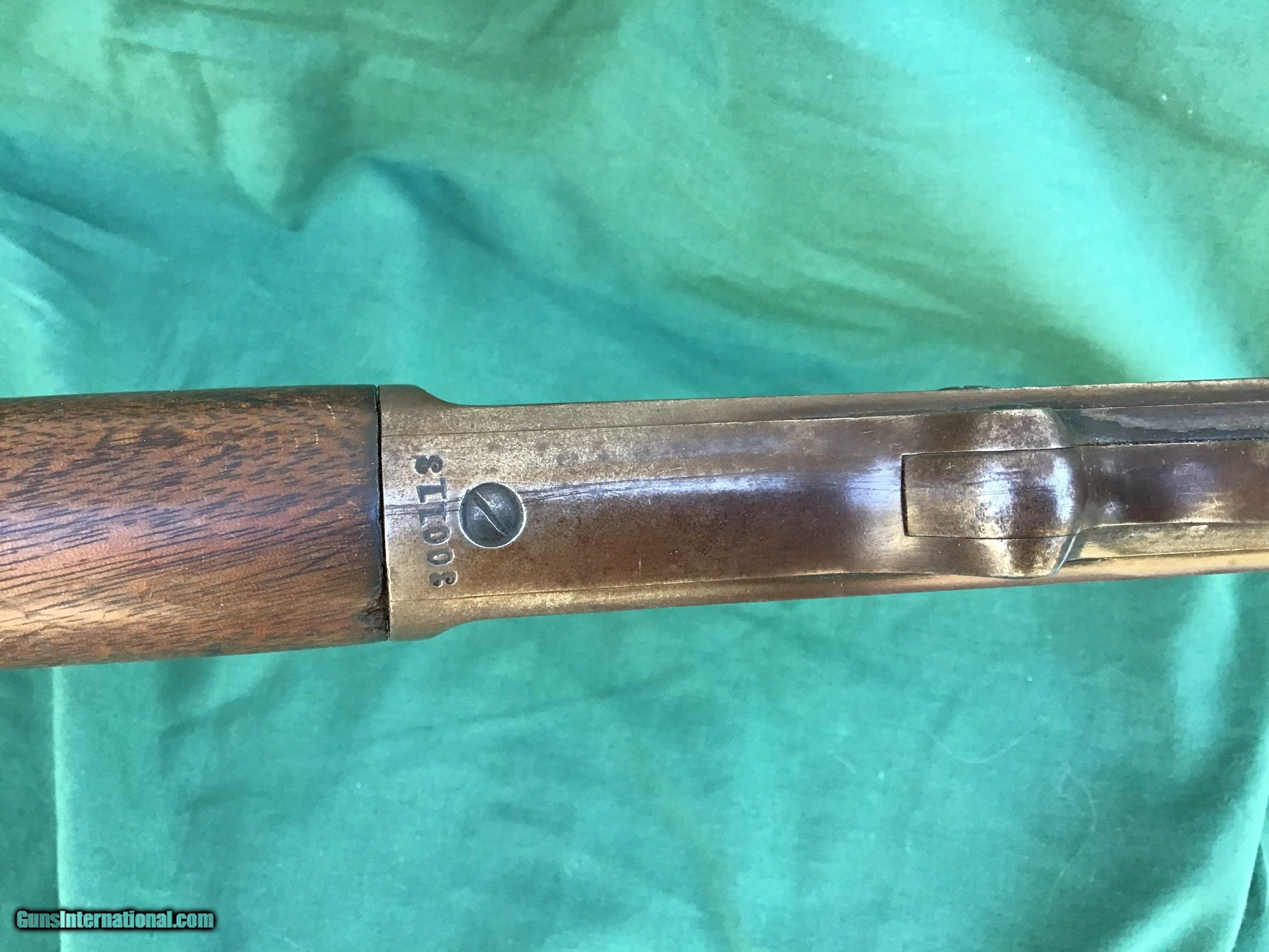 Description: Sold 1893 Marlin Indian Owned rifle in the ever popular 32-40 caliber, has a special ordered Hepburn receiver sight and hard rubber shotgun buttplate. My friend purchased this rifle from a gentleman that lived on the St Regis Indian Reservation 30 years ago and was told the gun was on the reservation from its very beginning. Manufactured right around the turn of the century. 26" round barrel and full magazine tube. The bore is about a 5 maybe a 6 on a scale from 1 to 10. Barrel and tube retain maybe 20% of it's original blue in protected areas and the remainder is a nice brown / gray patina. There is a ding near the muzzle on right hade side (see pic). Correct sights and has the special order Marlin Hepburn receiver sight ($450 value by itself). Receiver is a nice brown / gray patina with traces of finish in protected areas. Action functions nicely. Good markings. Both forend and buttstock are in fair condition, showing numerous handling marks, scrapes, and usage that you would expect from a gun with this kind of pedigree. Buttplate has a tiny piece missing and shows tiny crack in same area (see pic). Just a cool used but not abused special ordered Marlin with some nice history. Must ship to a FFL or Curio and Relics license holder. This firearm as with any other should be checked first by a gunsmith before any attempt is made to fire / operate it. Please feel free to ask questions. SOLD Curio/Relic: Yes |