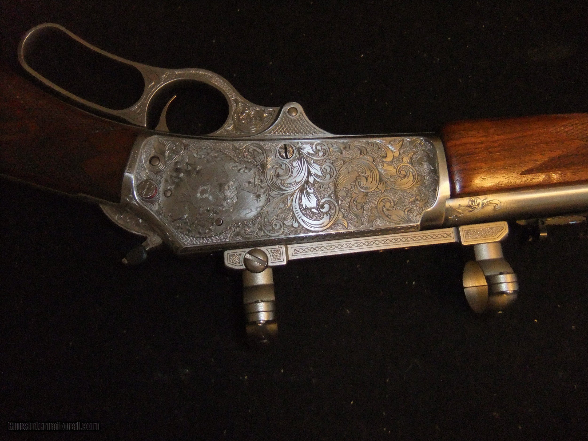 Description: STUNNINGLY BEAUTIFULLY MARLIN 30-30 IN STAINLESS STEEL ENGRAVED BY MASTER ENGRAVER AUSUSTION LO PRINZI (of Lo Prinzi Gutiar Co Fame) THIS BEAUTIFUL GUN FEATURES 100% ENGRAVING ON THE RECIEVER, BOLE HAMMER AND SCOPE MOUNTS.. "DEER IN THE PINES " on the right side of Reciever "HOG IN THE SWAMP" on the left side, Finished in a BLENDED AMERICAN AND ITALIAN SWIRL PATTERN This Work IS SIGNED BY THE ARTIST/ENGRAVER 111 The Wood on this Beautiful Gun is Grade IV Select, it is Deeply Figured and is finished in a Satin Finish, ! A WONDERFUL ADDITION TO ANY COLLECTION 111 SOLD Manufacturer: MARLIN Model: 336 SS Serial Number: 99025499 Caliber Info: 30-30 Condition: AS NEW Metal Condition: same Wood Condition: same Bore Condition: SAME Barrels: 1 Barrel Type: STAINLESS Action: LEVER Triggers: 1 Stock: WOOD Stock Dimensions: MFG. STD Finish: S. STEEL & WOOD Engraving: 100% RECIEVER Extras: IV WOOD |