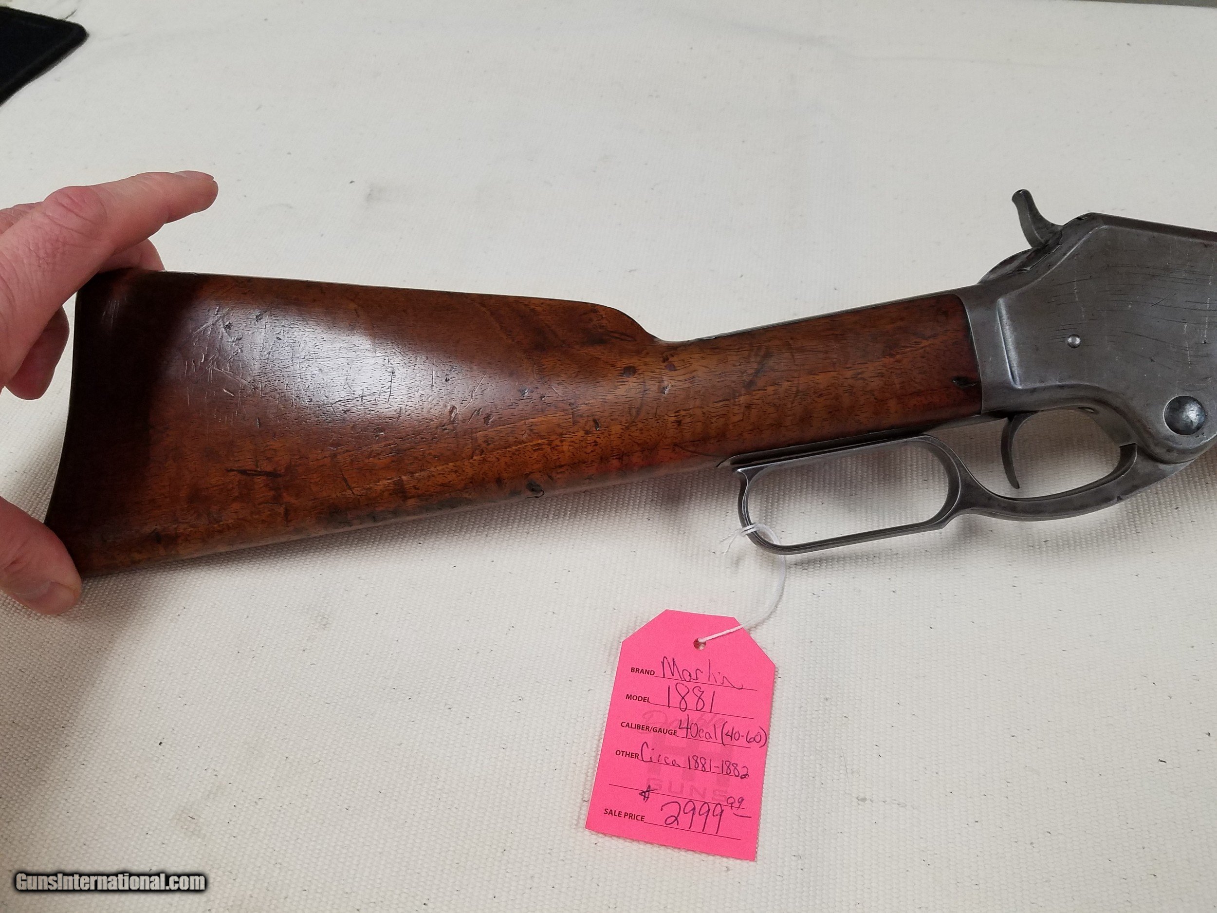 Description: This is an early production Marlin 1881, serial number 8052. The pictures should do it justice. While the gun is mostly grey everything else is nice including the bore......it still has some shine left!! The rifle wears a 28" barrel. Metal to wood fit is very good. No FFL required. Please call or email with any questions. WE TAKE CREDIT CARDS, DEBIT CARDS, MONEY ORDERS, CASHIER CHECKS, OR EVEN PERSONAL CHECKS.........AS LONG AS THEY'RE GOOD! 3% will be added to all charge cards. GUNS WILL BE HELD UNTIL PERSONAL CHECKS CLEAR. GUNS SUBJECT TO PRIOR SALE. There is a $50 shipping charge per gun and is NOT refundable. Insurance may be extra. Thank you, Darryl Howard SOLD |
