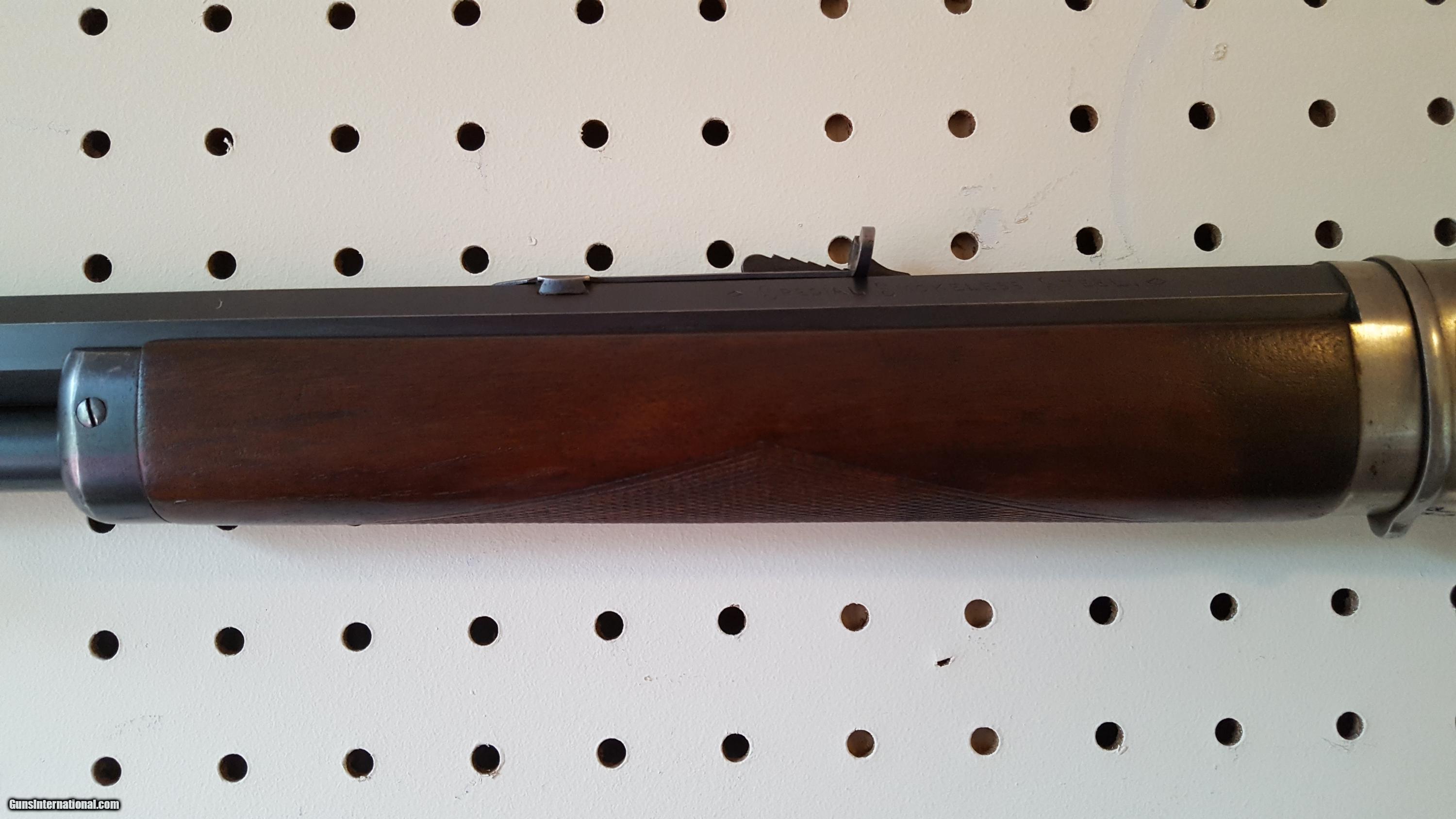 Description: Marlin. Model 1893 Semi Deluxe Takedown lever action rifle. Cal 30-30 Win. 26" Octagon to round barrel with a bright shinny bore. Half magazine Rocky mountain front sight with German silver blade and semi buckhorn rear sight. Receiver is color case hardened. Mounted with A-style checkered forearm & serpentine grip buttstock with Marlin embossed hard rubber buttplate. Condition is very fine . Barrel and magazine tube retain 98% strong original blue and the receiver about 70% orig case colors, bright on the left side and top, more faded on the right and turned silver on the bottom. Lever retains faded case colors in protected areas and the hammer most of its original blue. Wood is fine, mechanics are fine. Serial $ A8022. SOLD Antique: Yes |
