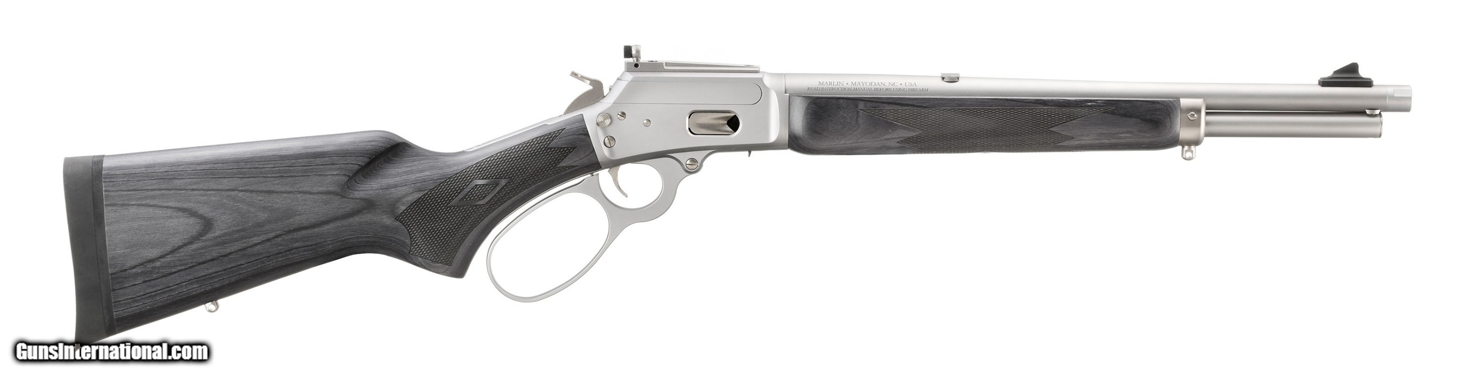 Description: NEW IN STOCK Marlin Firearms 1894, Trapper, Lever Action Rifle, 357 Magnum, 16.1" Cold Hammer Forged Barrel, Threaded 1/2X28, Matte Finish, Silver, Black Laminate Stock, Skinner Bear Buster Front and Skinner Receiver Mounted Trapper Peep Rear Sights, 8 Rounds 70452