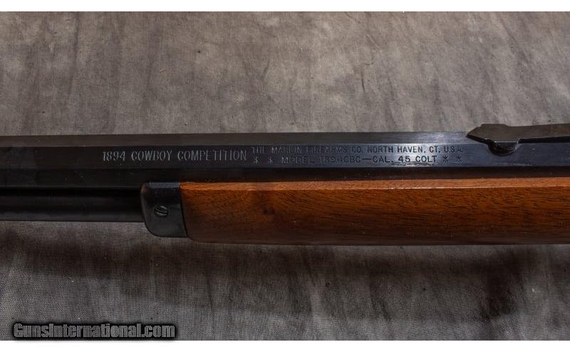 Description: This JM marked Marlin 1894 Cowboy Competition is chambered in 45 Long Colt and was manufactured in 2002 according to the serial number. This Cowboy Competition model features a 10 shot tube mag, 20" tapered octagon barrel with deep cut Ballard type rifling, hammer block safety, Marbles sights, case colored receiver, and bolt is factory tuned to meet the demands of competitive shooters. The metal condition is excellent, and the stock shows a few handling marks. .45 Colt SOLD Chambers: 45 LC Metal Condition: Excellent Wood Condition: Very Good Bore Condition: Excellent Barrels: 20 Weight: 6.5lbs Item Location: Concord, NC |