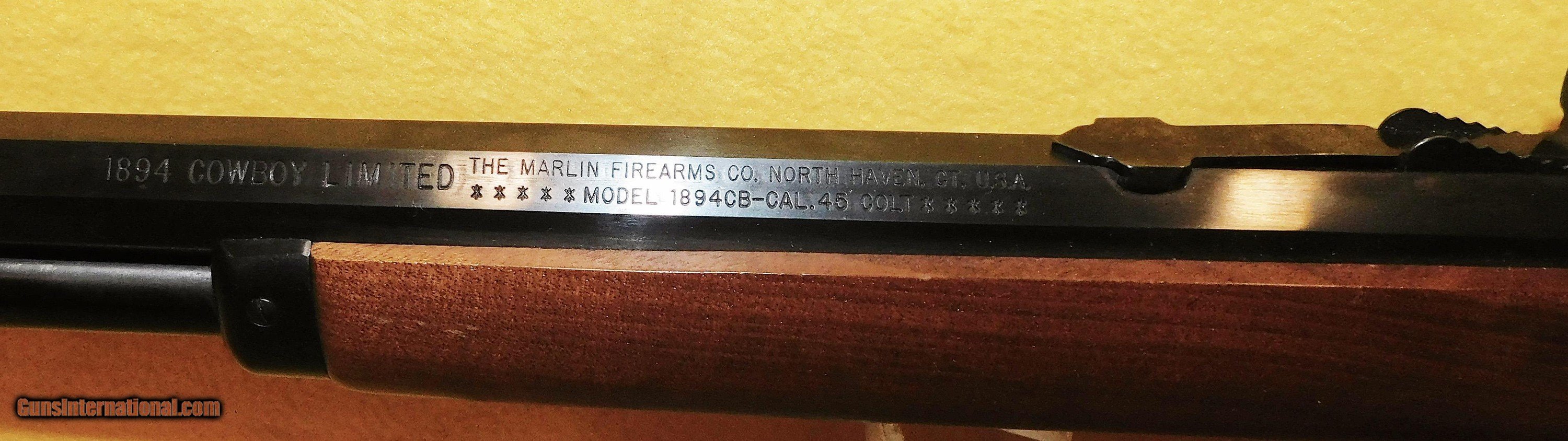 Description: MARLIN 1894 COWBOY LIMITED 1894 CB IN .45 LONG COLT CAL., WITH 20" BARREL. COLOR BLUE. CONDITION 98%. SERIAL NUMBER 94209110. MARLIN MODEL 1894 CB COWBOY LIMITED, MIRROR BORE, WALNUT STOCK AND FORE ARM EXCELLENT, HEAVY RIFLING TO SHOOT LEAD, CROSS BOLT SAFETY, 98% OVERALL CONDITION, OUR STOCK # D7474 SOLD |