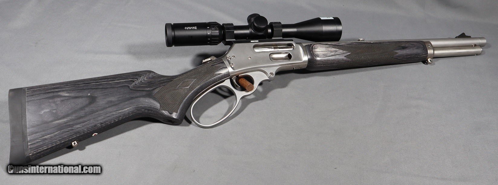 Description: For y our consideration, we have a Marlin, Model 1895 in .45-70 Gov. caliber. This stainless beauty is in very good shape, is compact and reliable. You may purchase this used firearm by clicking "Order Online." For more information, click "Request Info" or you may contact the Wichita, Kansas Gun Library at (316) 854-0748. Your purchase will be shipped free of charge to the Bass Pro Shops/Cabelas store nearest to your location. Thank You for your interest and for shopping Bass Pro Shops/Cabelas. .45-70 Government SOLD Metal Condition: Good Condition Wood Condition: Good Condition with one small scuff Barrels: 16" stainless barrel Stock Dimensions: 34.25" Length OAD Butt Pad: Marlin recoil pad Weight: 7lb 14oz Sights: Fixed sights and a Hawke Vantage IR Scope Item Location: Wichita, KS |