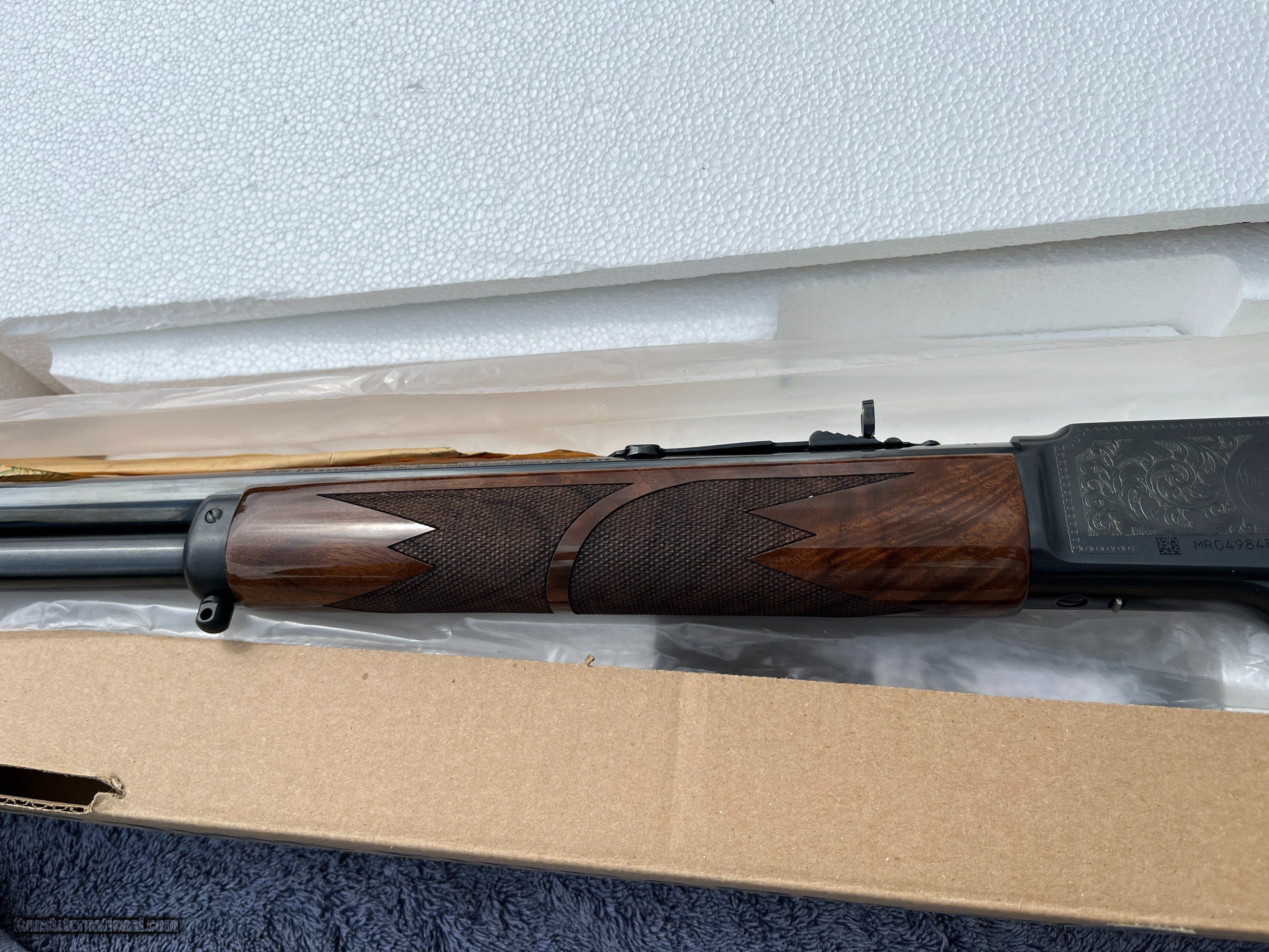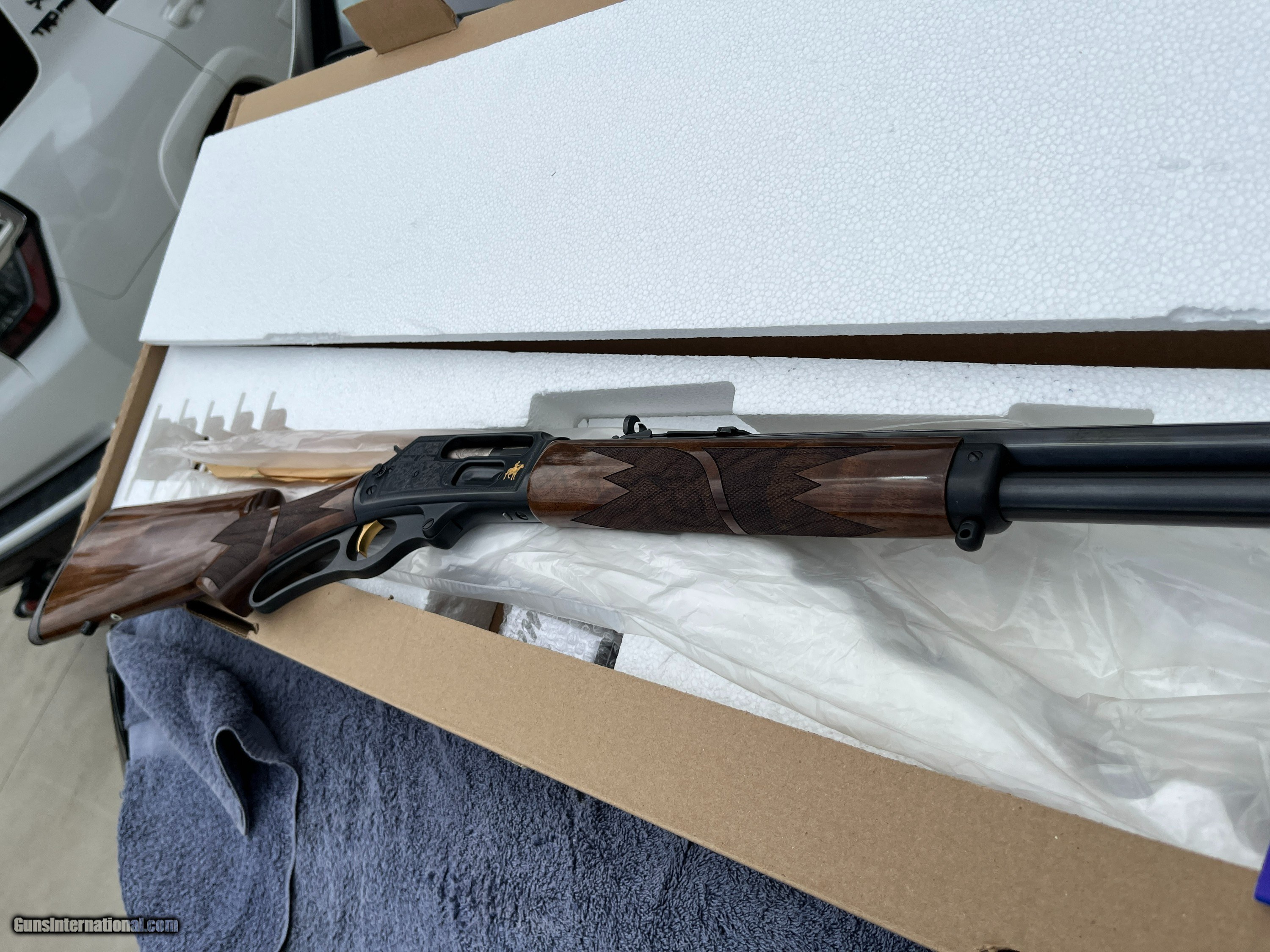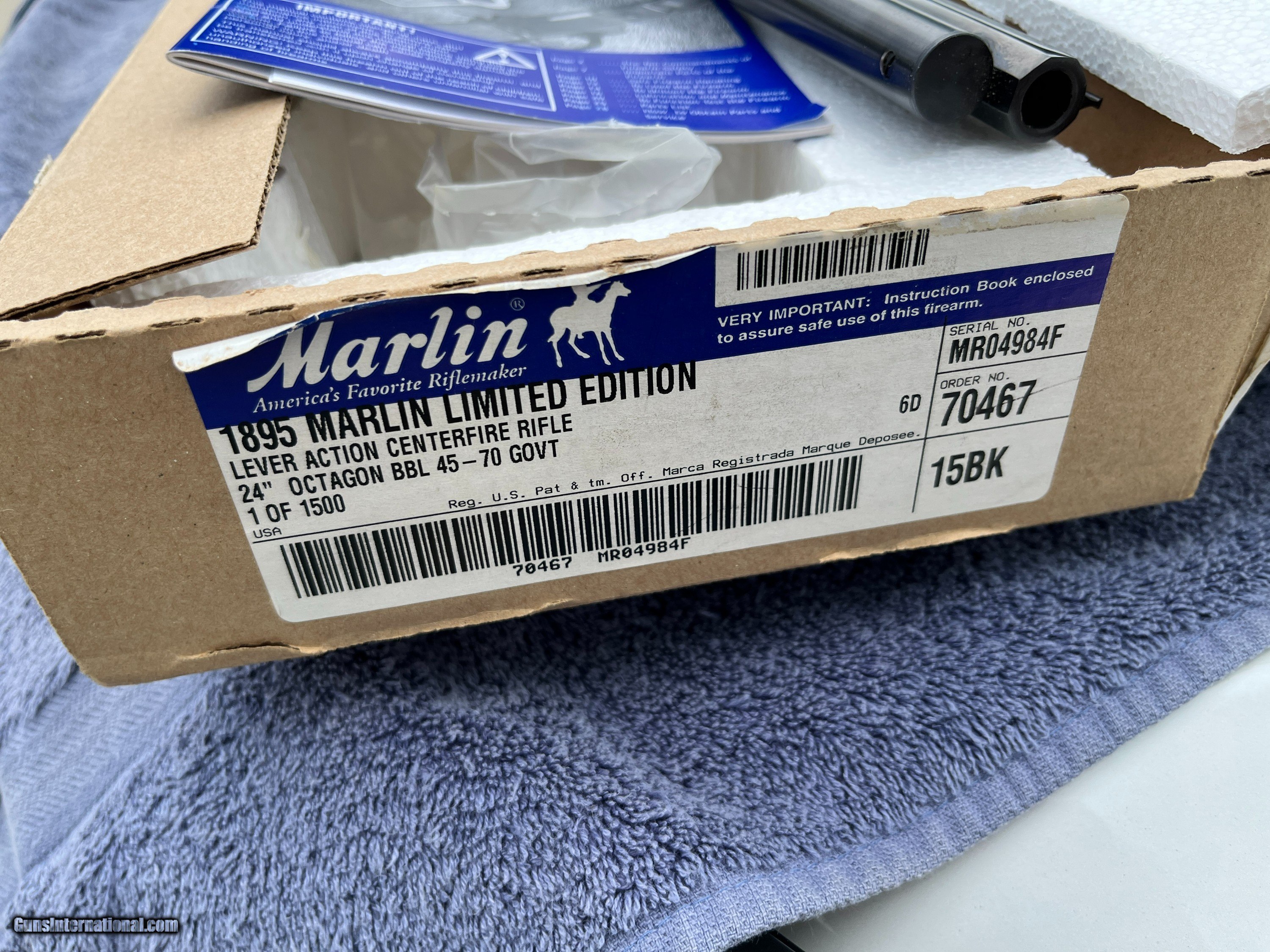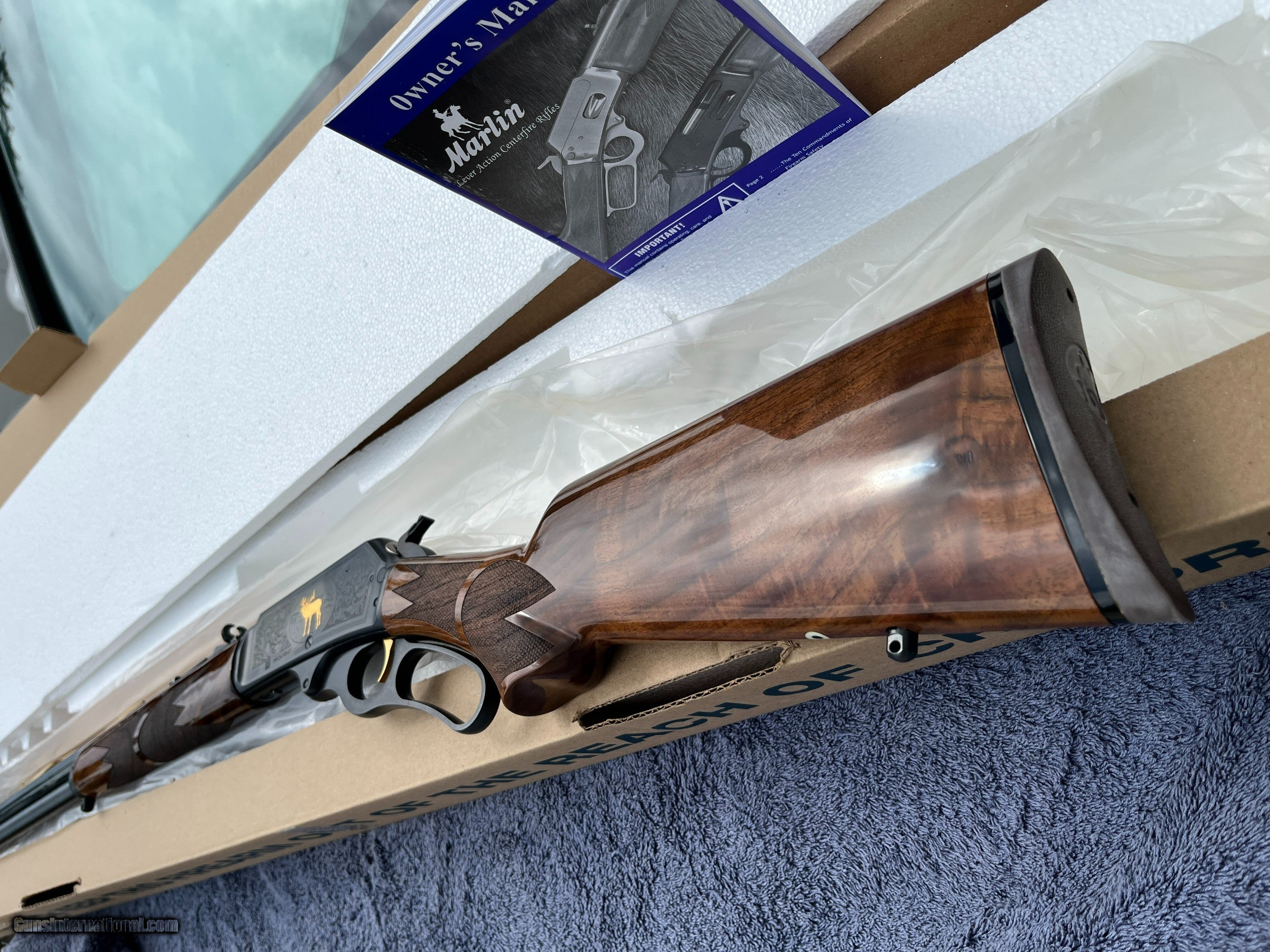 Description: This gun was recieved into my shop new 11/2015 from Acusport dist. This is a Remington mnf. Marlin. Unfired outside the factory. 100% NIB as shipped from Marlin. 45-70 24" octigon hi-gloss blue. white front bead sight bickhorn rear sight. Extra fancy hi-gloss old style pistol grip stock ,special checkering and swivel studs. Must ship to buyers FFL# Buyers checks excepted, item will ship after check has cleared. We add 3% lost cash discount for Visa/MC C/Card use. Shipping to lower 48 will be 75.00 UPS ground insured for the full amount. Alaska, Hawaii, and California. Note: will take clean Marlin lever action .22 on trade. 1897, 39, 39A SOLD |
