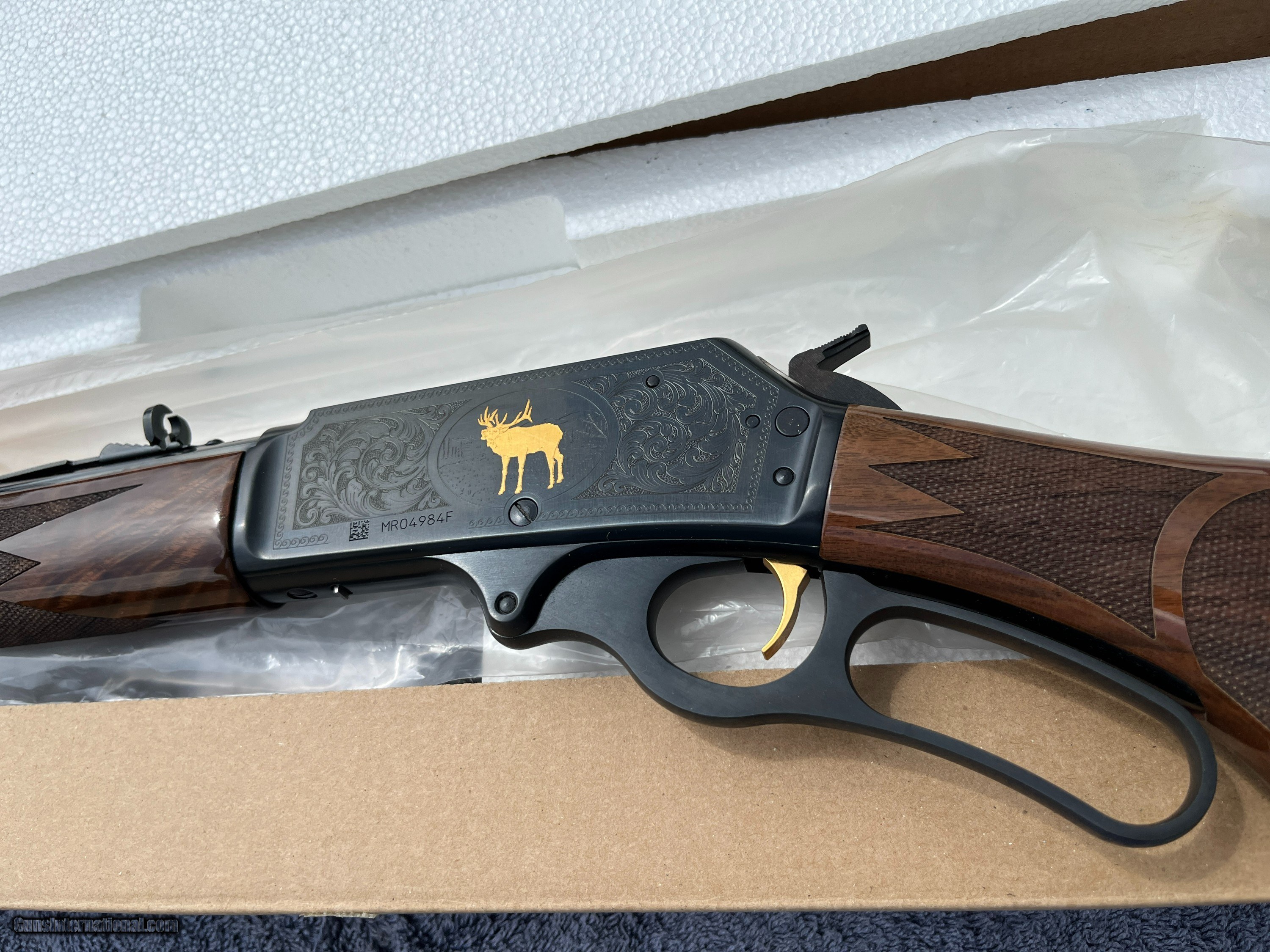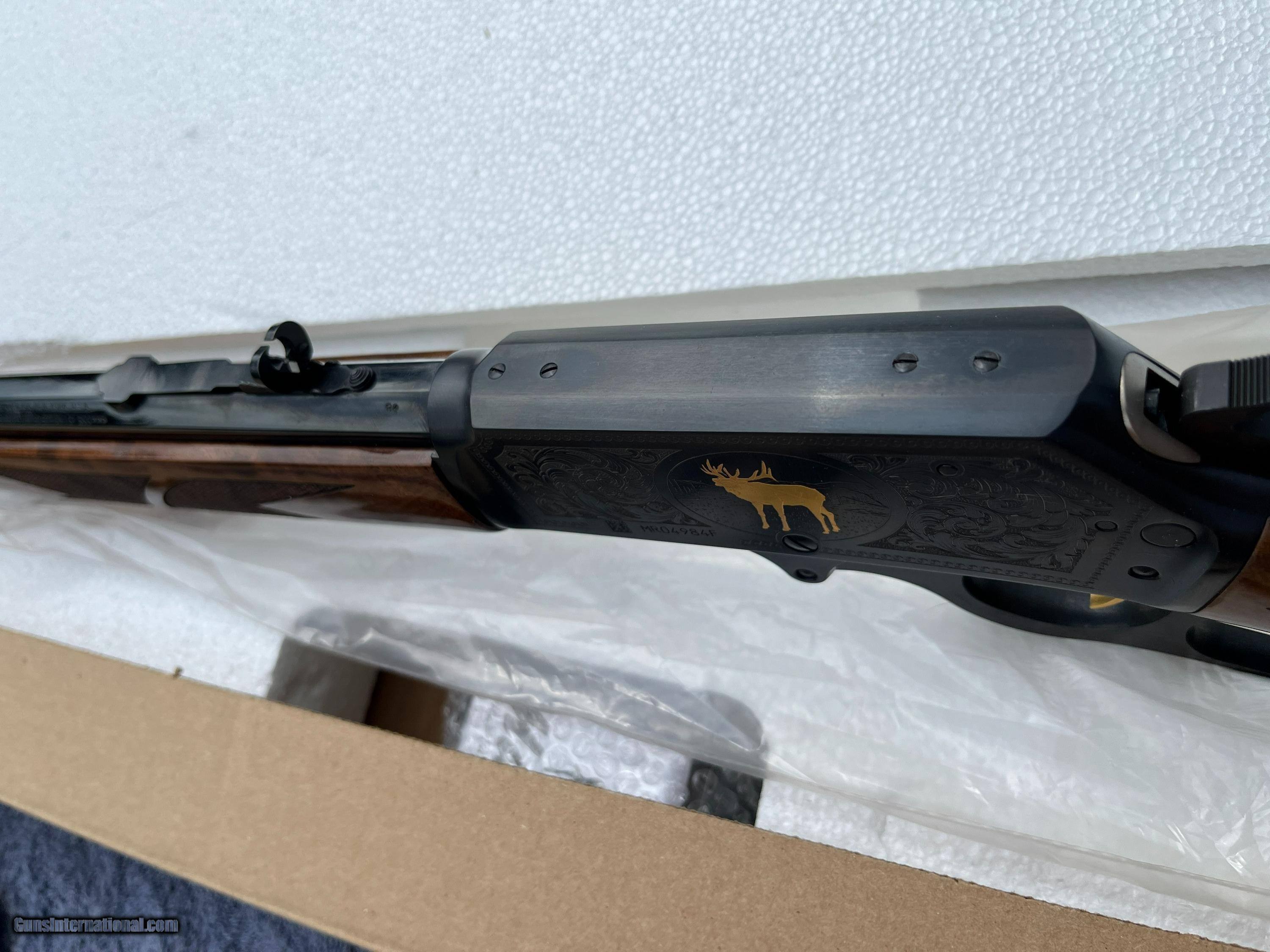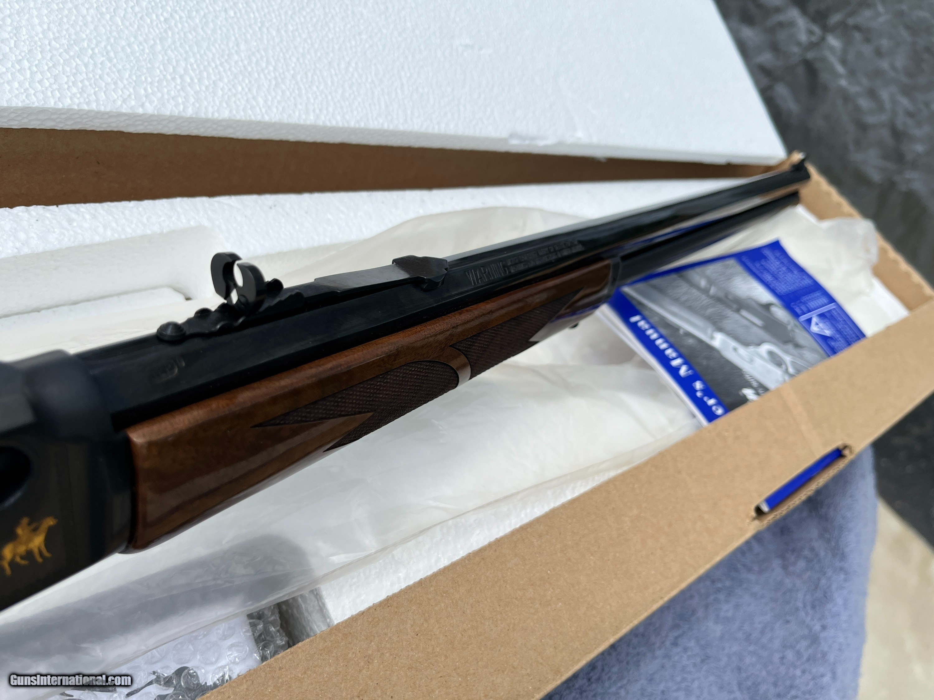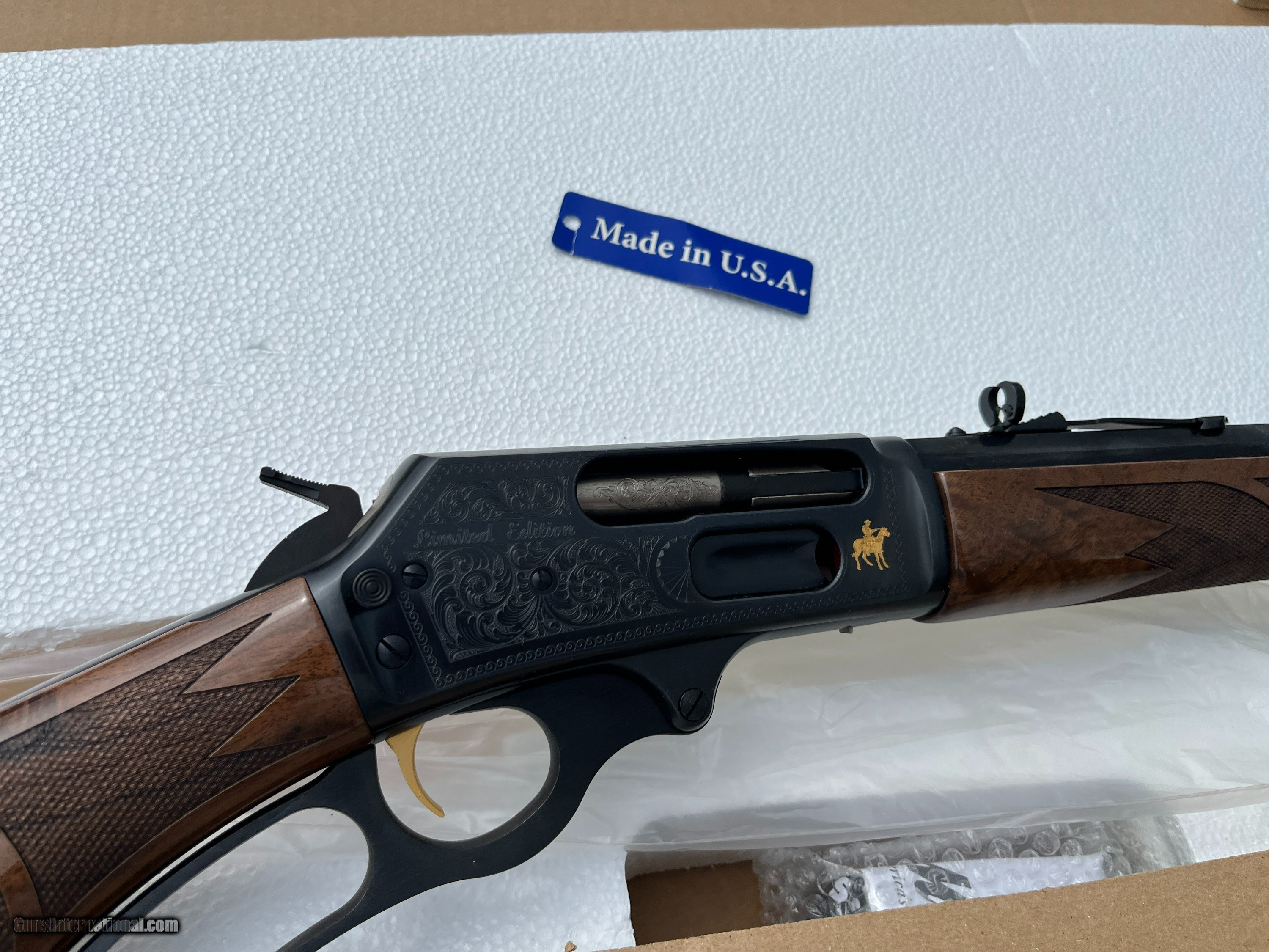 Description: This gun was recieved into my shop new 11/2015 from Acusport dist. This is a Remington mnf. Marlin. Unfired outside the factory. 100% NIB as shipped from Marlin. 45-70 24" octigon hi-gloss blue. white front bead sight bickhorn rear sight. Extra fancy hi-gloss old style pistol grip stock ,special checkering and swivel studs. Must ship to buyers FFL# Buyers checks excepted, item will ship after check has cleared. We add 3% lost cash discount for Visa/MC C/Card use. Shipping to lower 48 will be 75.00 UPS ground insured for the full amount. Alaska, Hawaii, and California. Note: will take clean Marlin lever action .22 on trade. 1897, 39, 39A SOLD |