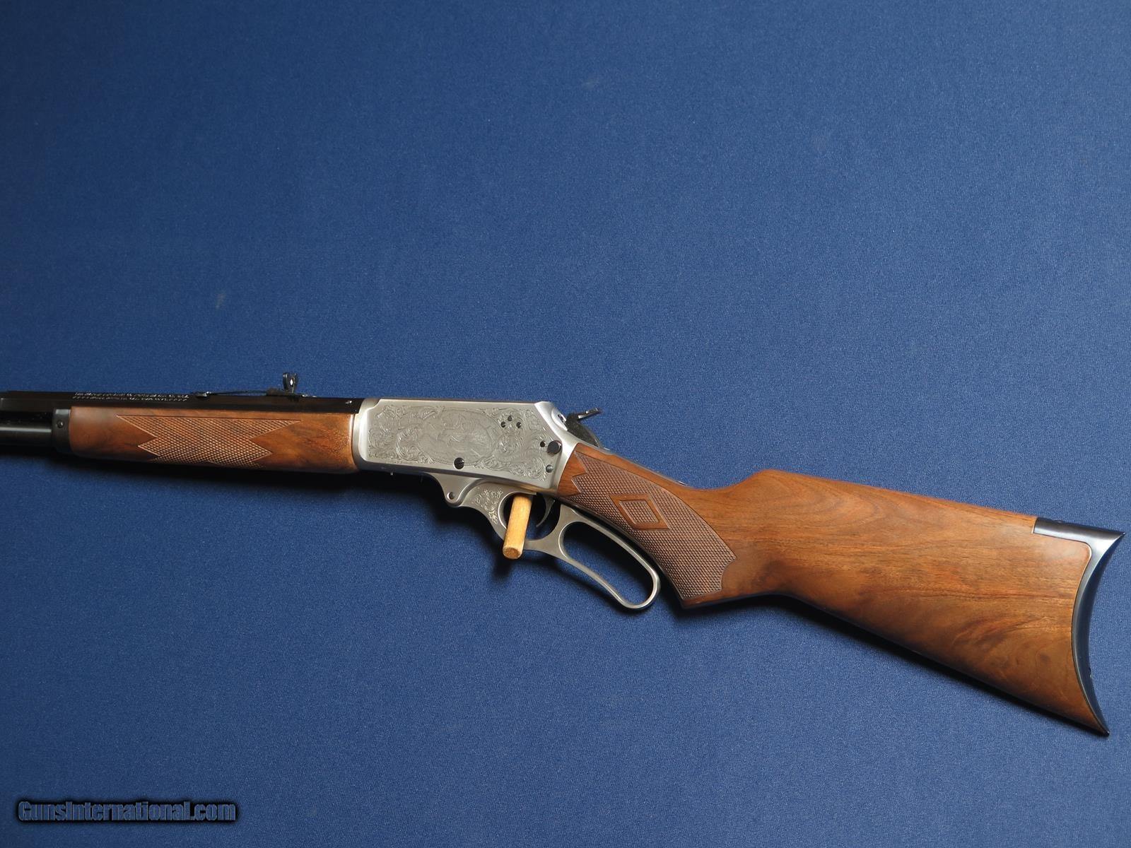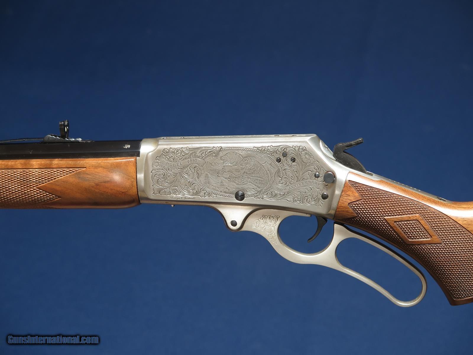 Description: Marlin 1895 CLTD Century Limited Anniversary 45-70 rifle. 24 inch half octagon half round JM stamped barrel. Only made one year, 1995. Engraved receiver with grizzly bear and horse rider. Looks unfired in box, shipping box, offset hammer spur, and papers. We have over 45 years in business, and not only do we buy guns, but we accept collections (and single/multiple guns) on consignment. SOLD Rifle Caliber: .45-70 Government |