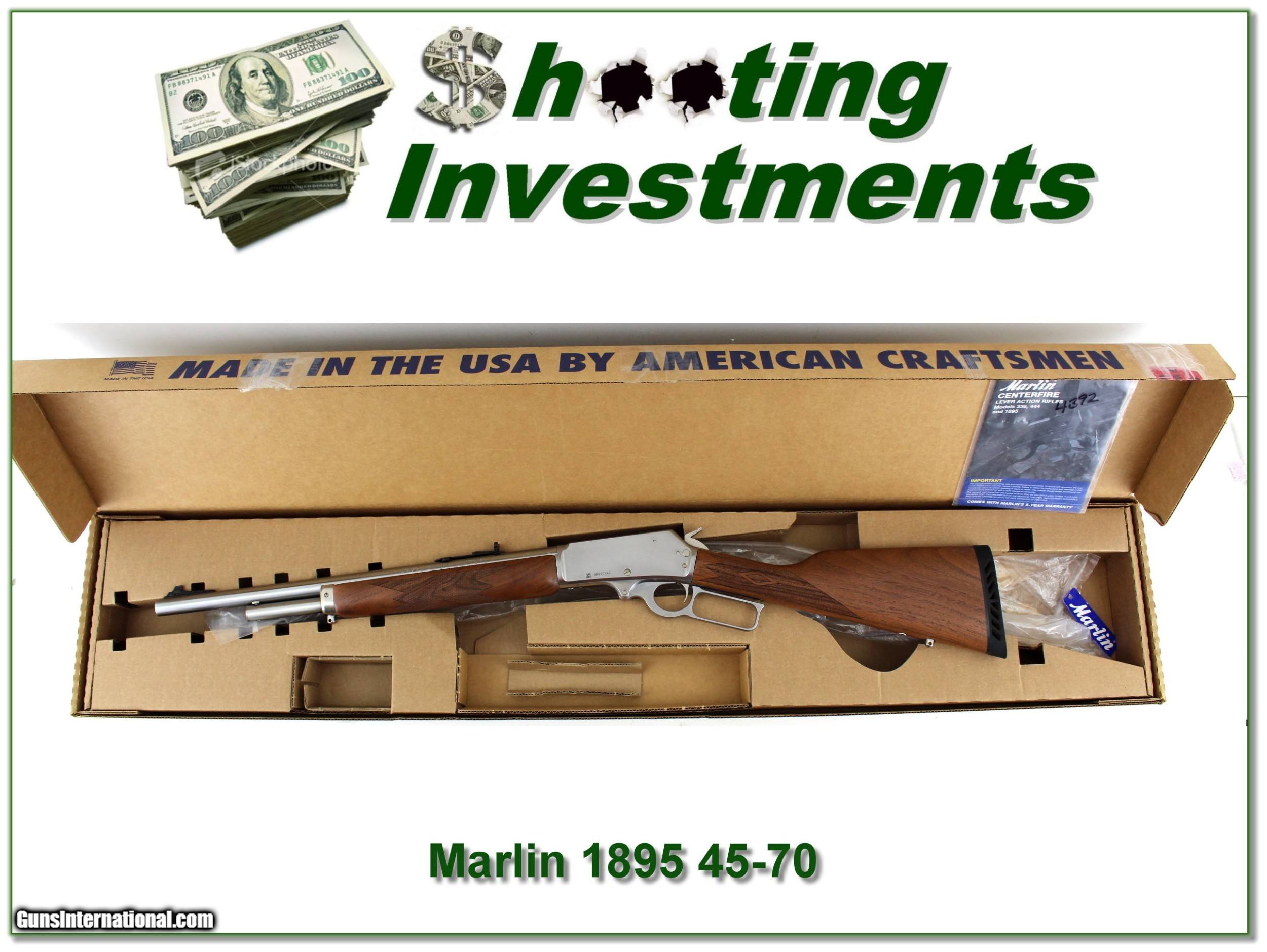 Description: This is a like new Marlin 1895GS 45-70. It is the harder to find Stainless Walnut model. I find no marks on the metal or the wood and at most test fired. It comes in a correct Marlin, but the box was for a Stainless SBL. This one will make a nice addition to any collection or will be a classic bear gun. Either way it is a real Shooting Investment. Shipping and insurance is $49. Please email me with any questions or larger pictures. (Consign your quality firearms with Shooting Investments for only 12%! Let me know if you have any you would like to sell!) 22-1093 Payment: Payment is by Money Order, Cashiers Check or Personal Check. I can now also accept Credit Cards (MasterCard, Visa, Discover & American Express) with a 3% convenience fee. Shipping: The shipping charge will be listed in each description. It is $49 for most long guns. Some heavy guns, over 48in boxes or those insured for over $2000 will be higher. Shipments to Alaska and Hawaii are higher because air shipment is required. Most firearms are shipped on Tuesday and Thursday and usually in 5 days of receipt of payment. We package all shipments carefully and insure them. Optics are shipped Priority Mail and most other non-firearm shipments are shipped First Class. Returns: Our return policy is simple. If for any reason you are not pleased with your purchase, you may return your item for a full refund of purchase price. Ammunition cannot be returned. It is important to us that you are happy. Guns cannot be fired or dissembled before returning them and they must be returned in the same condition as received. Notification of a return must occur with-in 3 days of receipt at your dealer. Shipping, convenience and dealer fees are not refundable and are the responsibility of the buyer. Lay-a-way: If needed, we offer a 60 day lay-a-way option on most firearms. It is 1/3 now, 1/3 in 30 days and 1/3 in 60 days. Lay-a-way firearm sales are final and if not completed the first payment cannot be returned. Consigning your firearms with Shooting Investments: We will help you get top dollar for your firearms. While most local guns shops charge 20% or more, our fee is only 12% with a minimum of $75. At your local gun shop it might take months to sell. Selling on-line provides instant access to thousands of interested buyers. You won’t find any other on-line dealer willing to sell your firearms for only 12% or listing every gun on 3 separate s. Selling through an House typically costs the seller 15% and the buyer an addition 15% (so 30%) and you have to wait several months to sell and longer to receive funds. If properly priced, we will sell your firearms in a few weeks. Send us an email or give us a call and we’ll explain how easy it is for you to get top dollar. Trading: Trading for use is really just buying your gun to re-sell. If you have a gun you want to trade, please email a picture and we will let you know what we can give or it. You will always get more if we sell it for you on consignment. Help for California Buyers: We are happy to ship to California. It is the buyer’s responsibility to make sure any item you buy is legal in your state. We are also happy to help with your purchase of a firearm from someone other than us. If you see a gun you would like to buy but the seller can’t or won’t ship to California they can ship to use and we’ll then ship it to your California dealer. The cost for this service is only $30 + shipping. Let us know if we can help! SOLD |