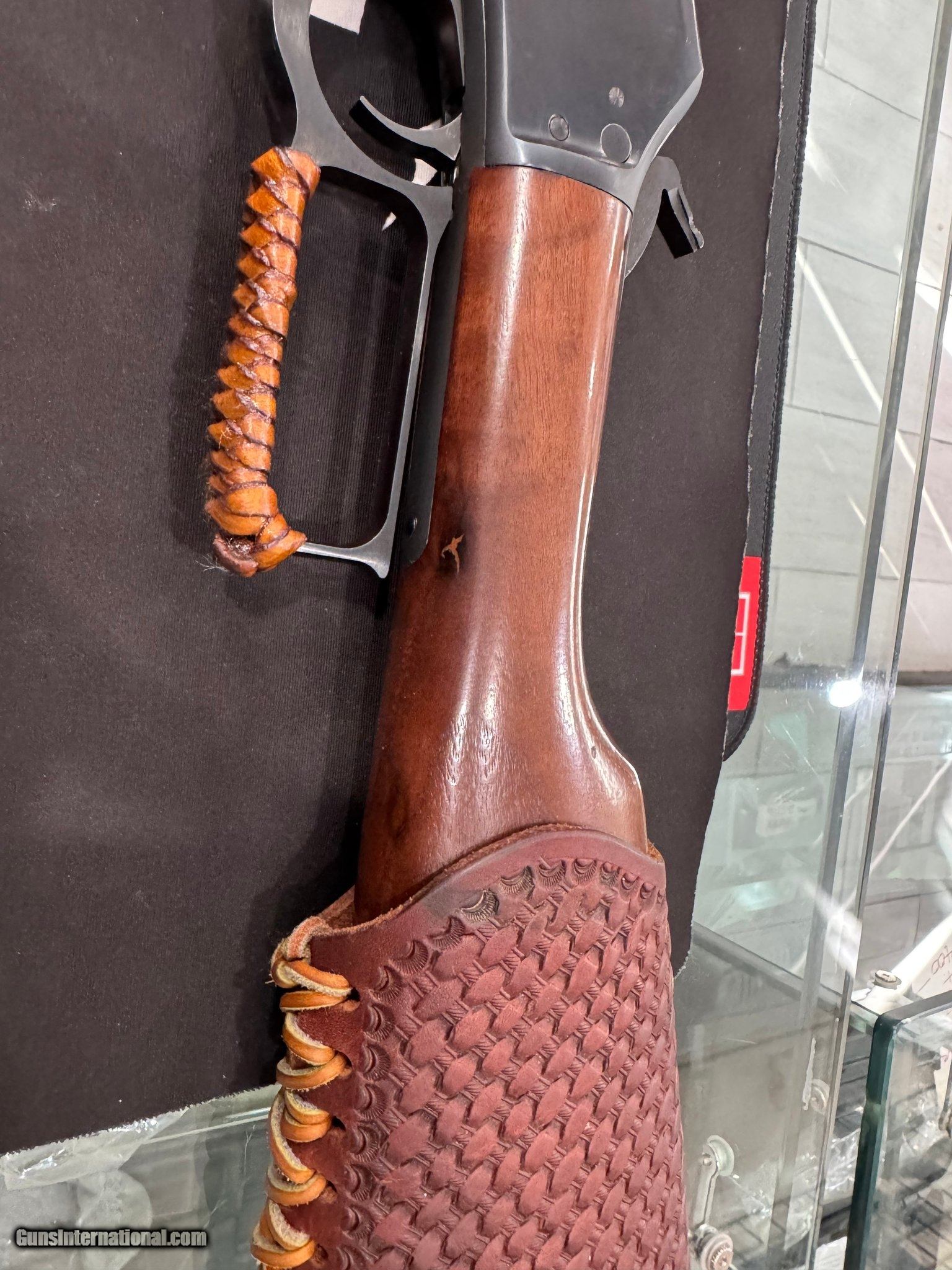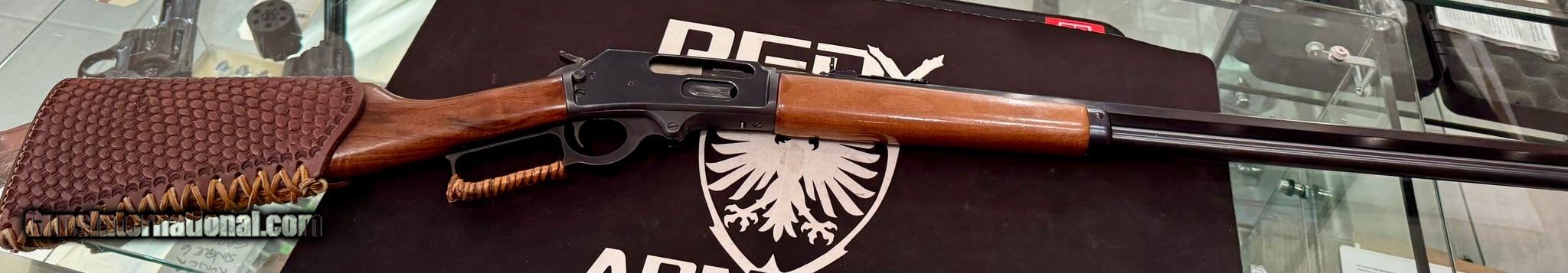 Description: Guns Listing ID: 485012 JM PROOF STAMP - OCTAGON BARREL - CUSTOM LEATHER STOCK AND LEVER WRAP Mfg date: 2002 EXCELLENT CONDITION With their tapered octagon barrels, these rifles offer true cowboy-rifle heft and aesthetics for everyone from the die-hard Cowboy Action Shooter to the hunter who appreciates 19th century-style firearms. The Marlin Model 1895 Cowboy is chambered for 45-70 Gov’t. and is equipped with a 26" barrel. Also,featuring traditional Ballard-style rifling, handsome American black walnut stock and fore-end, and richly blued finish. Firearm Features: Polished blued finish 26" tapered octagon barrel 9-shot tubular magazine American black walnut straight-grip stock Adjustable Marble’s semi-buckhorn rear sight and Marble’s front sight Firearm Specifications: Caliber: 45/70 Gov’t. Capacity: 9-shot tubular magazine Action: Lever action with squared finger lever; side ejection; solid top receiver; deeply blued metal surfaces; hammer block safety. Stock: Straight-grip American black walnut; hard rubber butt plate; tough Mar-Shield® finish; blued steel fore-end cap. Barrel: 26" Tapered octagon barrel with deep-cut Ballard-type rifling (6 grooves) Twist Rate: 1:20" R.H. Sights: Adjustable Marble semi-buckhorn rear Marble carbine front sight. Solid top receiver tapped for scope mount; offset hammer spur (right or left hand) for scope use. Serial number is on left side of receiver instead of tang allowing custom installation of a tang sight by a competent gunsmith. Overall Length: 44.5" Weight: 8 lbs. SOLD Manufacturer: MARLIN Model: 1895CB Condition: Used - Non-Certified Barrels: 26 Gauge Info: .45-70 GOVT Finish: blued |