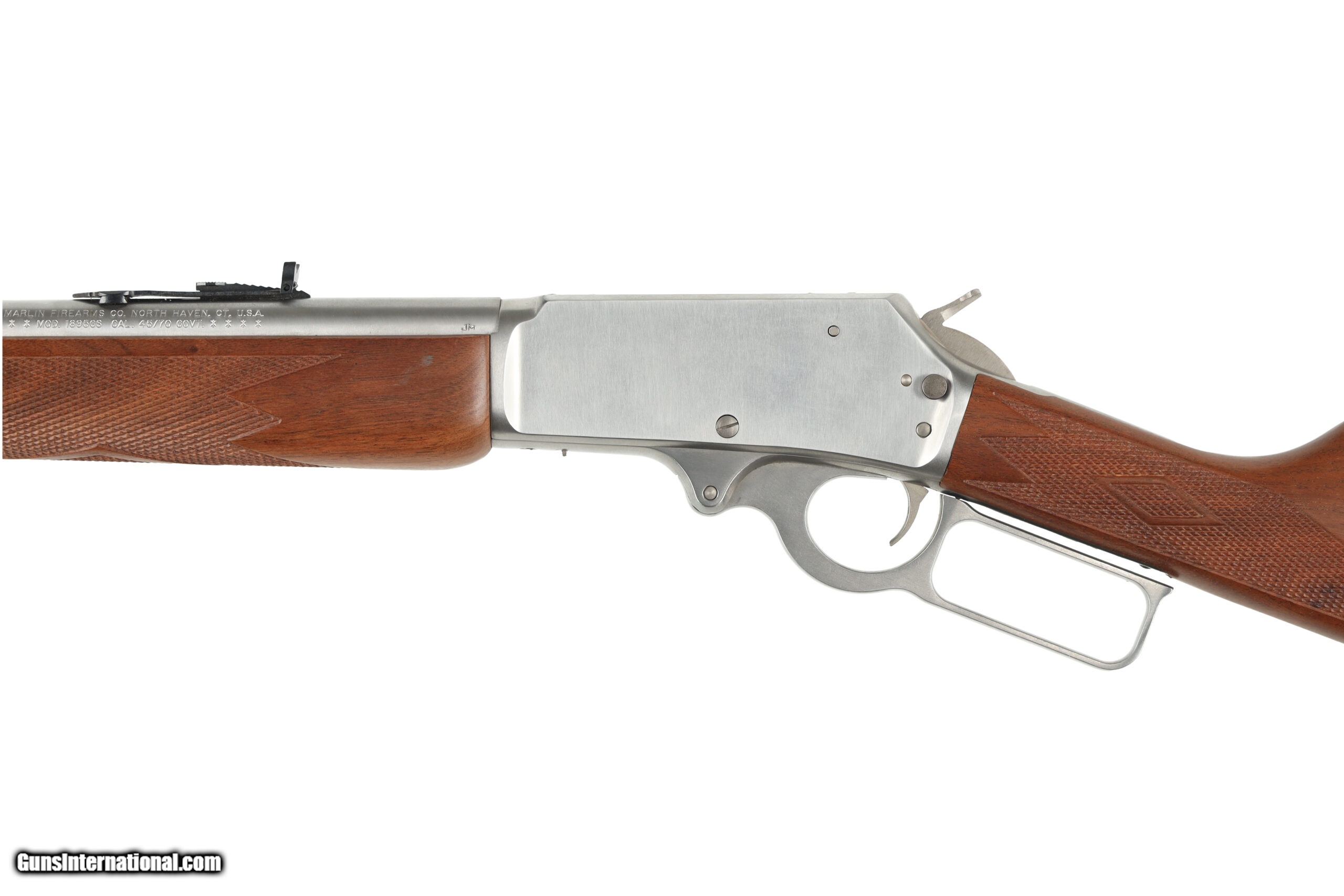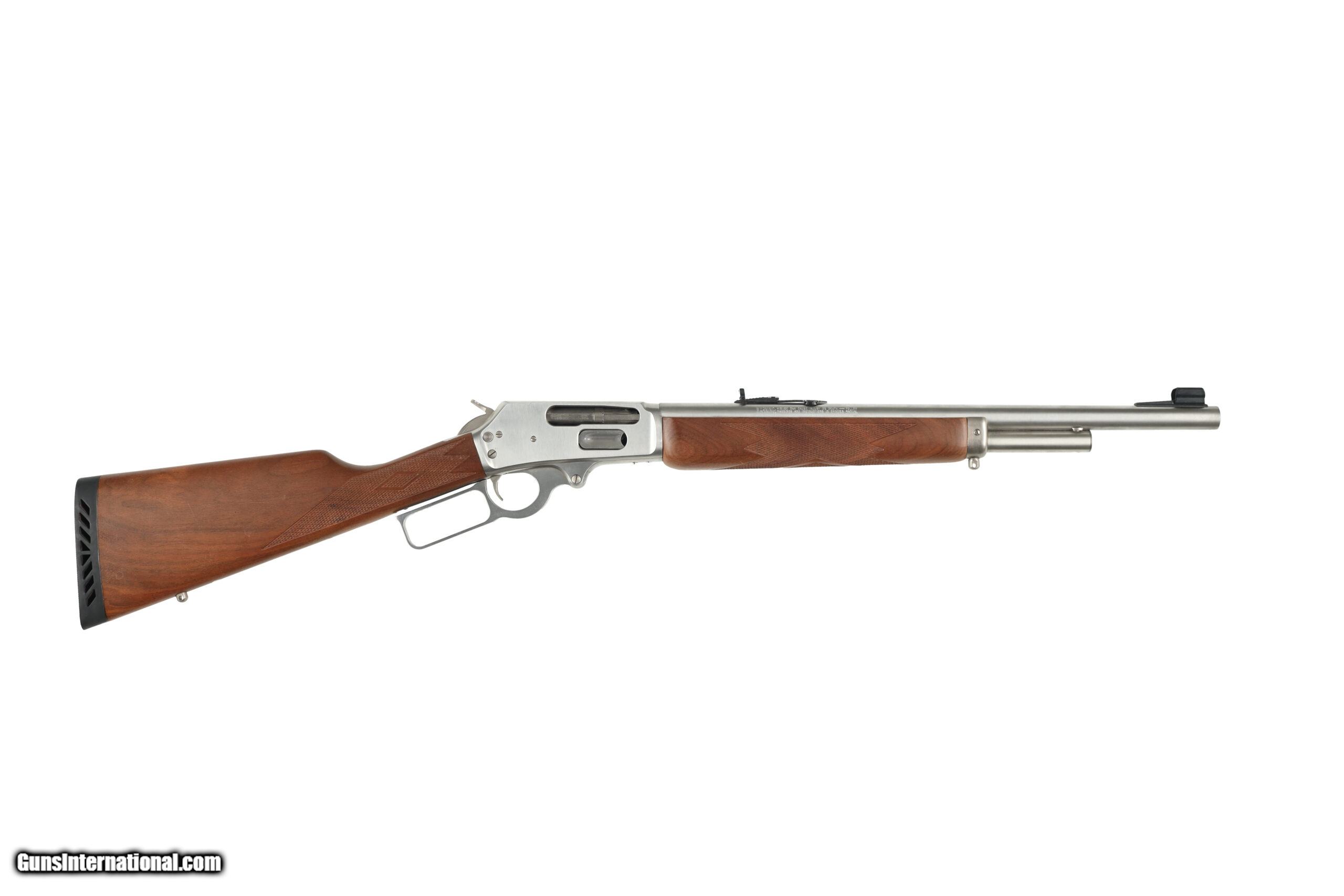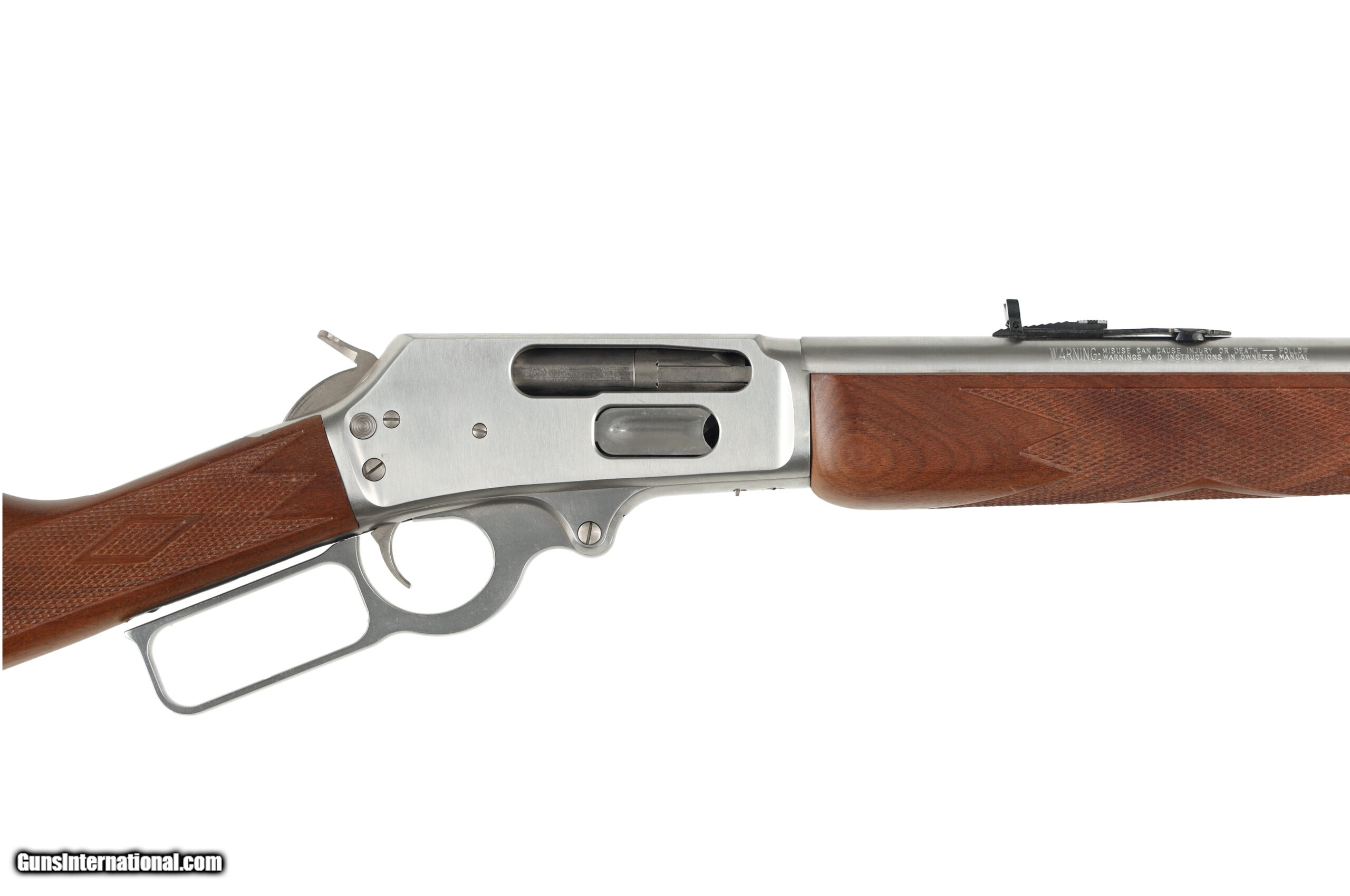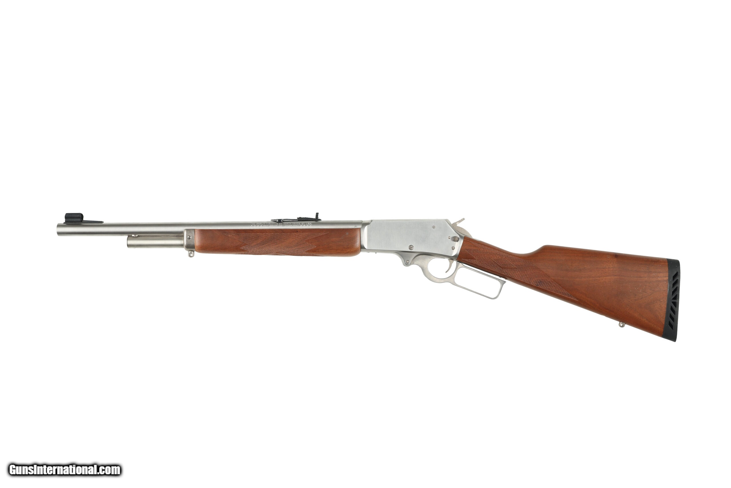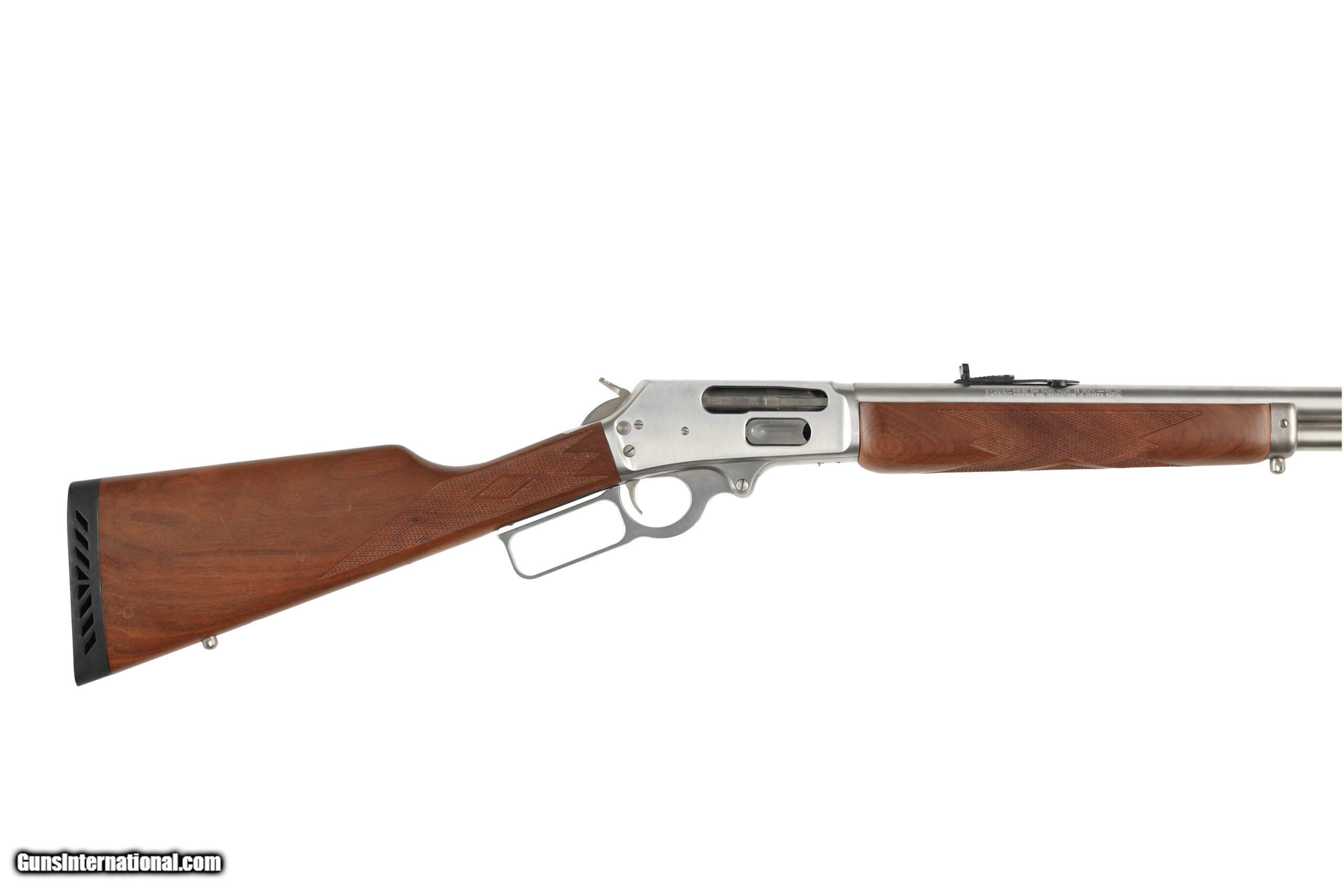 Description: The Marlin 1895 in .45-70 is the ubiquitous "Guide Gun". This example is equipped with a 18.5" stainless barrel and a straight grip. Overall condition is very good, with the only wear of note being some spots on the butstock that appear to be paint spatter or other transfer. Manufactured in: USA Hand: Right Hand Action Finish: Stainless Steel Barrel Length: 18 1/2" Barrel Condition: Very Good Stock Finish: Original Stock Condition: Very Good Type of Butt: Factory Pad Pad Thickness: .75 Grip: Straight Grip Forend: Checkered SOLD Manufacturer: Marlin Model: 1895 GS Caliber Info: .45-70 Condition: Preowned Metal Condition: Very Good Action: Lever Action Triggers: Single Fore End: Checkered Butt Pad: .75 LOP: 13 1/4 Weight: 6.9 lbs Case: NONE |
