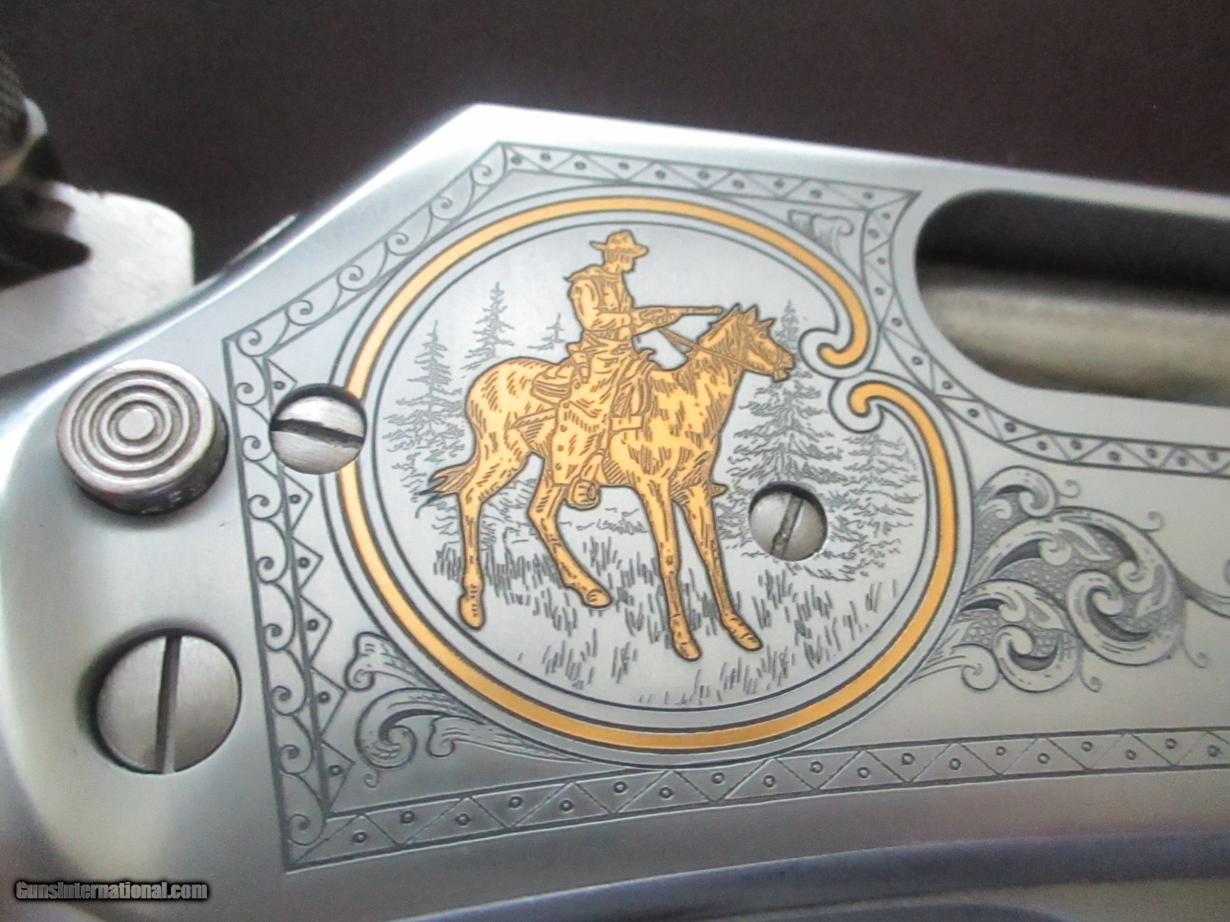 Description: 18 1/2" heavy (non fluted) bbl., hooded front blade brass bead, open rear, 1" base & rings, engraved Grizzley bear &, 24kt gold horse & rider inlay with gold cameo bordering all engraving encased in floral engraving, deluxe checkered American walnut straight stock with deep hand carved Guns & Ammo 50th Yr. Anniversary logo, unfired in fitted hard case with fine leather double strapped scabbard included, box 45/70 Gov't ammo included, only a few mfg. for Guns & Ammo. 2008, 99% as new, SOLD |