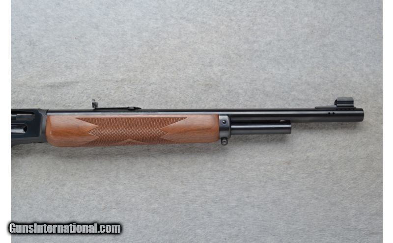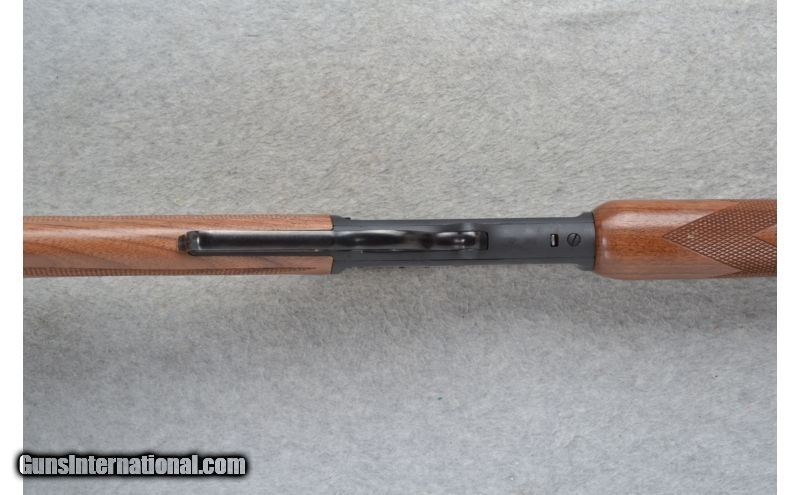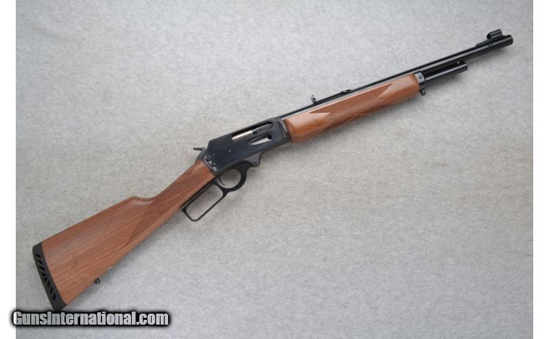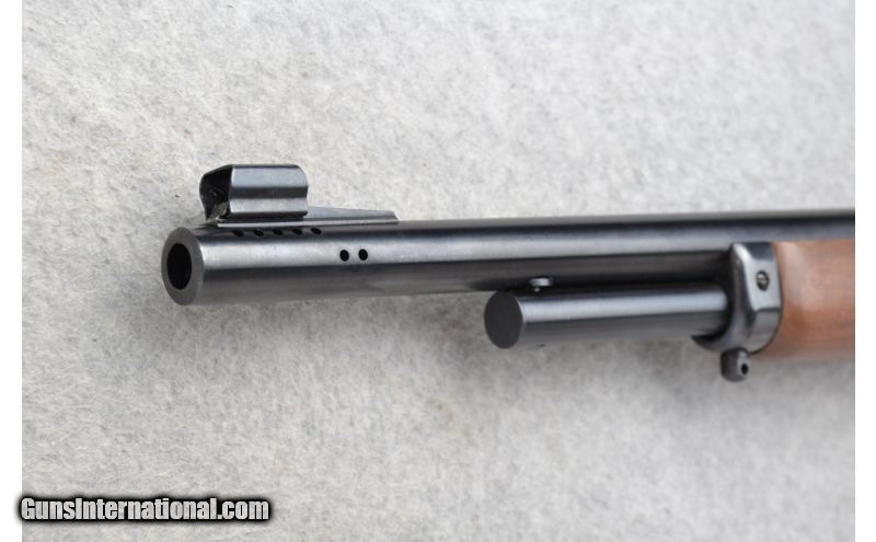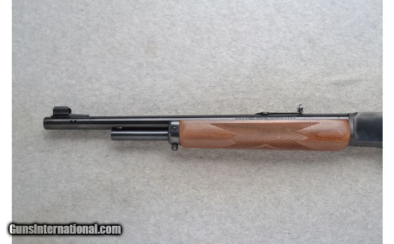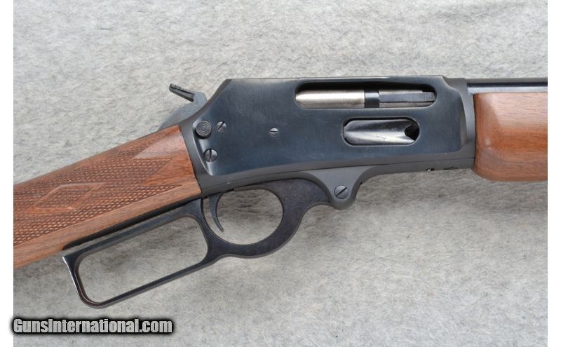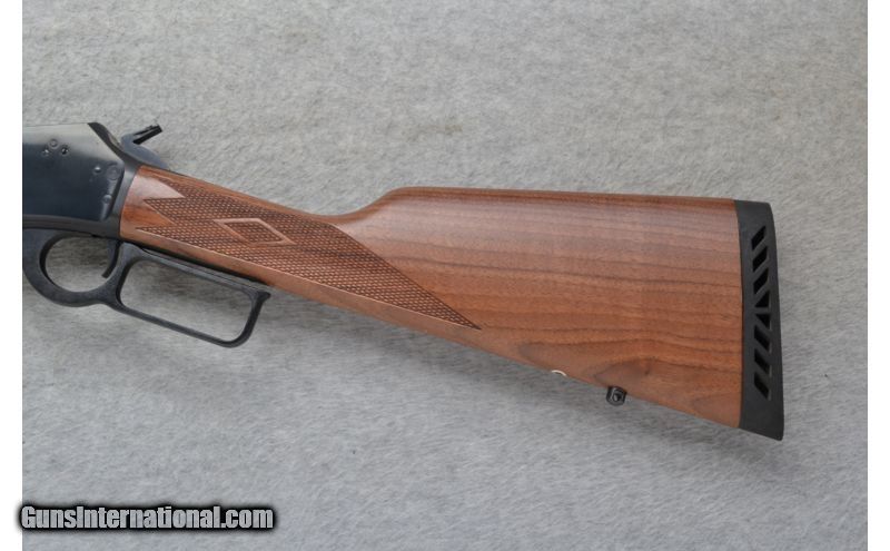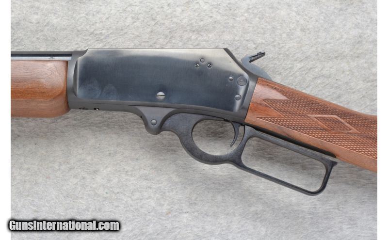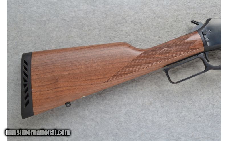 Description: This Marlin Model 1895M is a right hand lever action repeating rifle in .450 Marlin Cal. It has a 18.5 inch ported barrel. A hooded front blade sight, folding buckhorn middle sight and is drilled and tapped. The stock is a diamond checkered walnut straight grip. SOLD Caliber Info: .450 Marlin Chambers: Lever Action 4 round tube magazine. Metal Condition: Excellent with a couple of minor handling marks. Wood Condition: Excellent with a couple of minor handling marks. Bore Condition: Excellent. Barrels: 18.5 inch blued ported barrel. Stock: Diamond checkered walnut straight grip. Stock Dimensions: LOP 13 3/8 inches. Fore End: Diamond checkered grip walnut with a black steel cap. Butt Pad: Marlin black rubber recoil pad. Weight: 6 lbs. 12 oz. Sights: Hooded front blade. Folding buckhorn middle. Drilled and tapped. Extras: Sling swivel studs. Item Location: Richfield, WI |