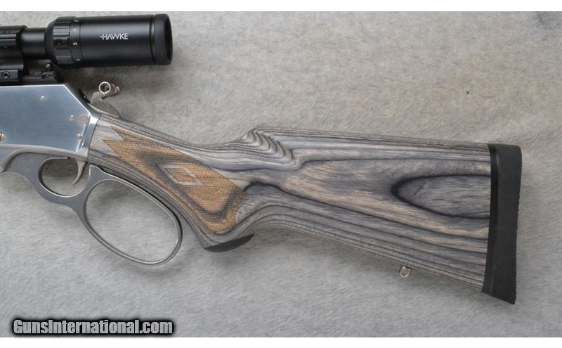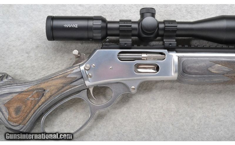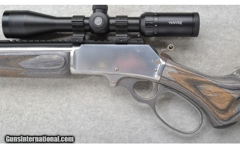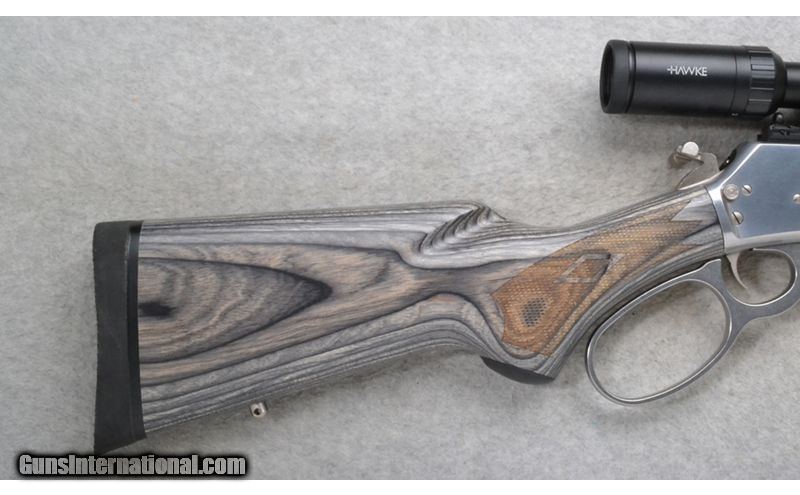 Description: This Marlin Model 1895SBL is a right hand lever action stainless steel repeating rifle in .45/70 Gov't. Cal. It has an 18 inch barrel. A raised blade front sight and an adjustable aperture rear sight. It is outfitted with a Hawke 3-9x40 Scope. The butt stock is a diamond checkered hardwood laminate pistol grip with a black cap. The forearm is a checkered grip hardwood laminate with a stainless steel cap. It has a left side hammer thumb extension. .45-70 Government SOLD Chambers: Full barrel length tube magazine. Metal Condition: Excellent. Wood Condition: Excellent. Bore Condition: Excellent. Barrels: 18 inch stainless steel. Stock Dimensions: LOP 13 1/2 inches. Fore End: Checkered grip hardwood laminate with a stainless steel cap. Butt Pad: Decelerator black rubber recoil pad. Weight: 8 lb. 8 Oz. Sights: Raised blade front with white. Adjustable aperture rear. Hawke 3-9x40 Scope. Item Location: Richfield, WI |
