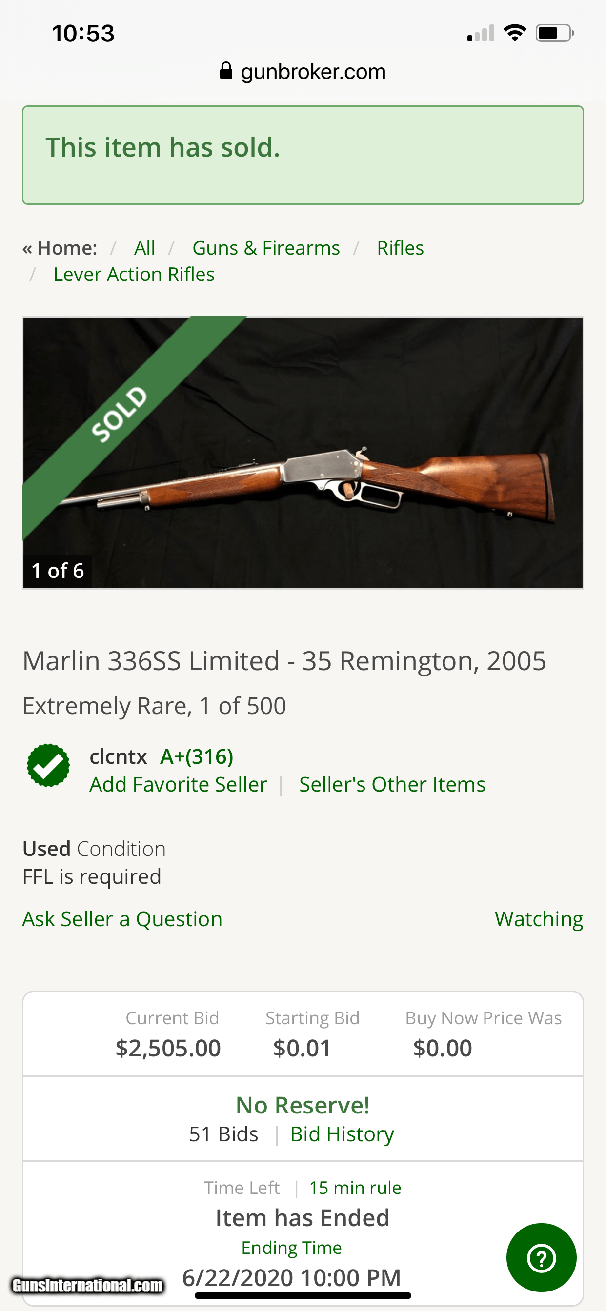 Description: I am relocating to another part of the state so need to downsize a bit. Up for sale is a Marlin most do not see very often, a Marlin 336SS LTD chambered in 35 Remington. If my research is correct these were manufactered in 2004 with a run of only 501 for Davidsons. They have an 18" (guide gun length) SS barrel, checkered walnut and straight stock. Includes factory box and paperwork. The metal and wood on this rifle I would rate at excellent but take a look at the pictures and you be the judge. Local pickup is available with valid ID and signing a BOS. Shipping and insurance available to your FFL of choice. Other listings following including the blue version of this rifle a 336D. Thank you. Added 6-29-2020-The last one of this model sold on listing #870732744, with no box sold for $2500. SOLD Manufacturer: MARLIN Model: 336 SS LTD Caliber Info: 35 Remington Condition: Excellent Action: Lever Action Sights: Factory Buckhorn Manufacture Date: 2004 Extras: Factory Box |