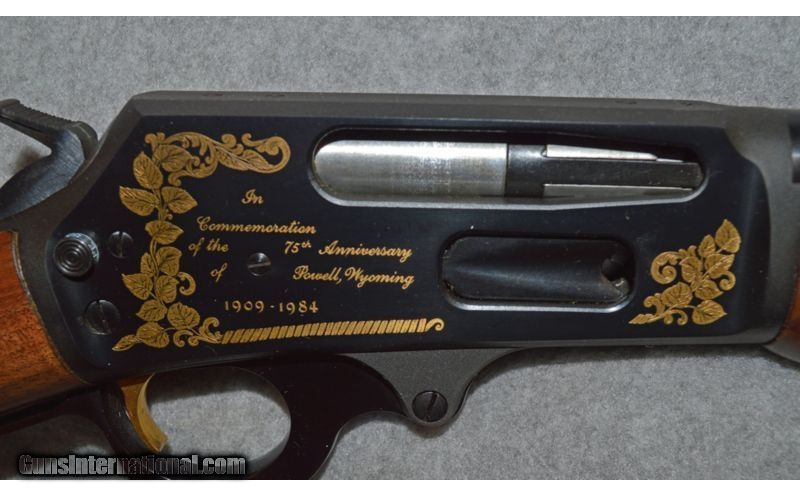 Description: This beautiful Marlin is 1 of 500, Powell, Wyoming 75th Anniversary editions issued to account holders of the First Nation Bank of Powell Wyoming. The receiver and saddle ring is highlighted with gold plating. Whether you live in Powell Wyoming or simply a Marlin rifle fan, this would be a stunning addition to any collection. SOLD Caliber Info: .30-30 Winchester Metal Condition: Excellent Wood Condition: Excellent Bore Condition: Bright Barrels: 18 " carbine Triggers: Single, gold plated Stock: Walnut Stock Dimensions: LOP 13 1/2" Over all 36 1/2 Fore End: Walnut Butt Pad: Factory Weight: 6.6 lbs Sights: Factory iron, front hooded Extras: Box Item Location: Short Pump, VA |