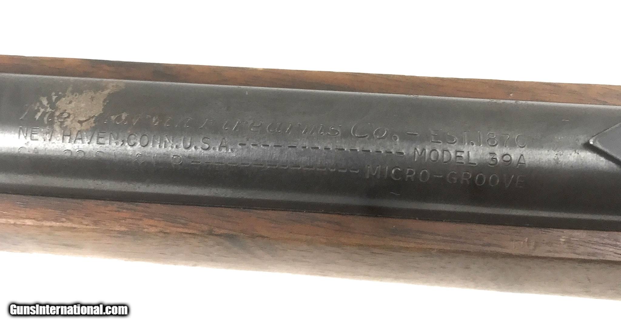 Description: Guns Listing ID: 734161 Manufacturer: The Marlin Firearms Co. Model: 39A Type: Lever Action Rifle Caliber: .22 Short, .22 Long or .22 Long Rifle Serial No.: M16946 Capacity: 26 Short, 21 Long or 19 Long Rifle Cartridges Barrel Length: 20\" Front Sight: Ramp With Brass Bead and Hood Rear Sight: Semi Buckhorn Action: Lever action NOTE; JM Stamped (Circa 1955) SKU: 22030013 Although The Marlin 39A Is Graded As-Used, Is In Good Condition, It Has Signs Of Use, Some Discoloration On The Barrel Some Marks On The Body (See Photos) SOLD Manufacturer: MARLIN Model: 39A Caliber Info: .22 S/L/LR Condition: Used - Non-Certified Barrels: 2 BARREL Finish: BLUE |