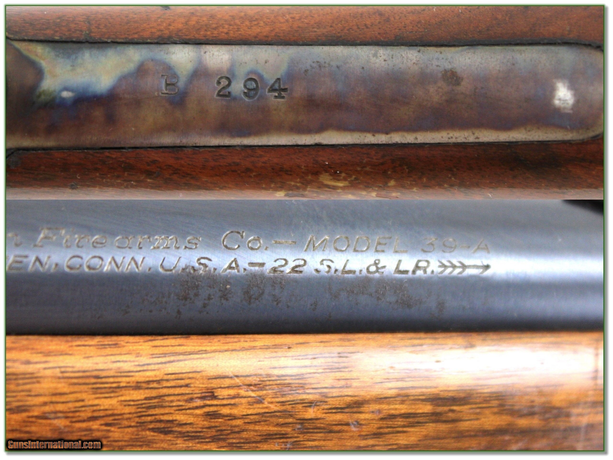 Description: Collectors, this is a rare chance to own a very early first model Marlin 39A! Yes, a 1940 made Marlin in original condition! It is serial number B 294. It has beautiful factory case color and the wood has only minor marks mostly one the forearm. I’m sure not many rounds through this nearly 90 year old gun! You will look hard to find another one! It is a true Shooting Investment! Shipping and insurance is $69. Please email me with any questions or larger pictures. (Consign your quality firearms with Shooting Investments for only 12%! Let me know if you have any you would like to sell!) 25-0112 Payment: Payment is by Money Order, Cashier’s Check or Personal Check. I can now also accept Credit Cards (MasterCard, Visa, Discover & American Express) with a 3% convenience fee. Shipping: The shipping charge will be listed in each description. It is $49 for most firearms. Some heavy guns or those insured for over $2000 will be higher. Shipments to Alaska and Hawaii are higher because air shipment is required. Most firearms are shipped on Tuesday and Thursday and usually in 5 days of receipt of payment. We package all shipments carefully and insure them. Optics are shipped Priority Mail and most other non-firearm shipments are shipped First Class. Returns: Our return policy is simple. If for any reason you are not pleased with your purchase, you may return your item for a full refund of purchase price. Ammunition cannot be returned. It is important to us that you are happy. Guns cannot be fired or dissembled before returning them and they must be returned in the same condition as received. Notification of a return must occur within 3 days of receipt at your dealer. Shipping, convenience and dealer fees are not refundable and are the responsibility of the buyer. Lay-a-way: If needed, we offer a 60 day lay-a-way option on most firearms. It is 1/3 now, 1/3 in 30 days and 1/3 in 60 days. Lay-a-way firearm sales are final and cannot be returned. If a lay-a-way is not completed the first payment cannot be refunded. Consigning your firearms with Shooting Investments: We will help you get top dollar for your firearms. While most local guns shops charge 20% or more, our fee is only 12% with a minimum of $100. At your local gun shop it might take months to sell. Selling on-line provides instant access to thousands of interested buyers. You won’t find any other on-line dealer willing to sell your firearms for only 12% or listing every gun on 3 separate s. Selling through an House typically costs the seller 15% and the buyer an addition 15% (so 30%) and you have to wait several months to sell and longer to receive funds. If properly priced, we will sell your firearms within a few weeks. Send us an email or give us a call and we’ll explain how easy it is for you to get top dollar. Trading: Trading for us is really just buying your gun to re-sell. If you have a gun you want to trade, please email a picture and we will let you know what we can give for it. You will always get more if we sell it for you on consignment. SOLD |
