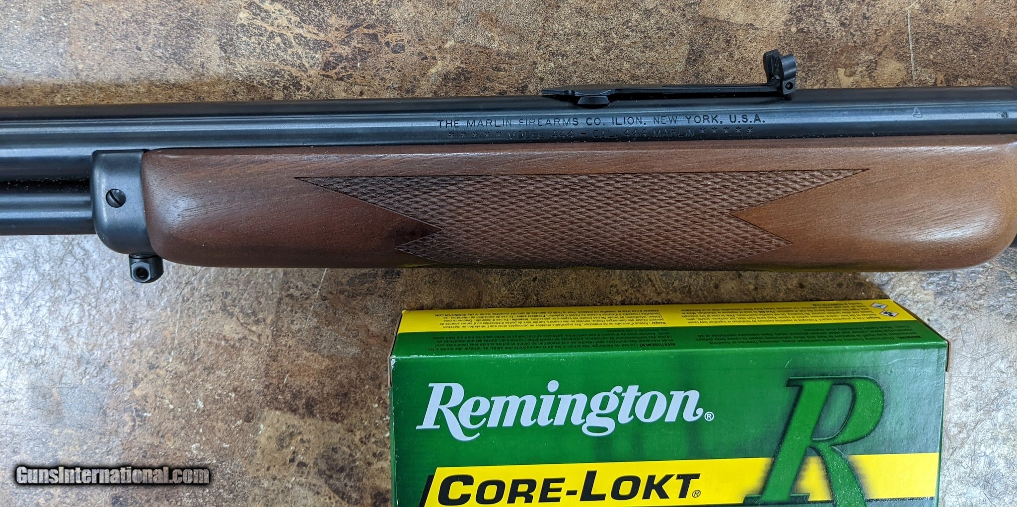 Description: Guns Listing ID: 422270 COMES WITH 2 BOXES OF AMMO Description: Lever-action. Side ejection. Tapped solid top receiver. Tubular magazine. Hammer block safety. American black walnut stock w/pistol grip, fluted comb, cut-checkering & Mar-Shield® finish. Swivel studs. Rubber rifle butt pad. Barrel w/deep-cut Ballard-type rifling. Adjustable semi-buckhorn folding rear, ramp front sight w/brass bead & Wide-Scan® hood. Ambidextrous offset hammer spur. Wt.: 7.5 lbs. Includes: gun lock. Attributes Caliber: .444 Marlin Capacity: 5 Product Model: MODEL 444S Product Information Metal Finish Blue Caliber 444 Marlin Barrel Length 22 Overall Length 40.5\" Trigger Single Stage Stock wood SOLD Manufacturer: MARLIN Model: 444 Caliber Info: 444 MARLIN Condition: Used - Non-Certified Barrels: 22" BARREL |