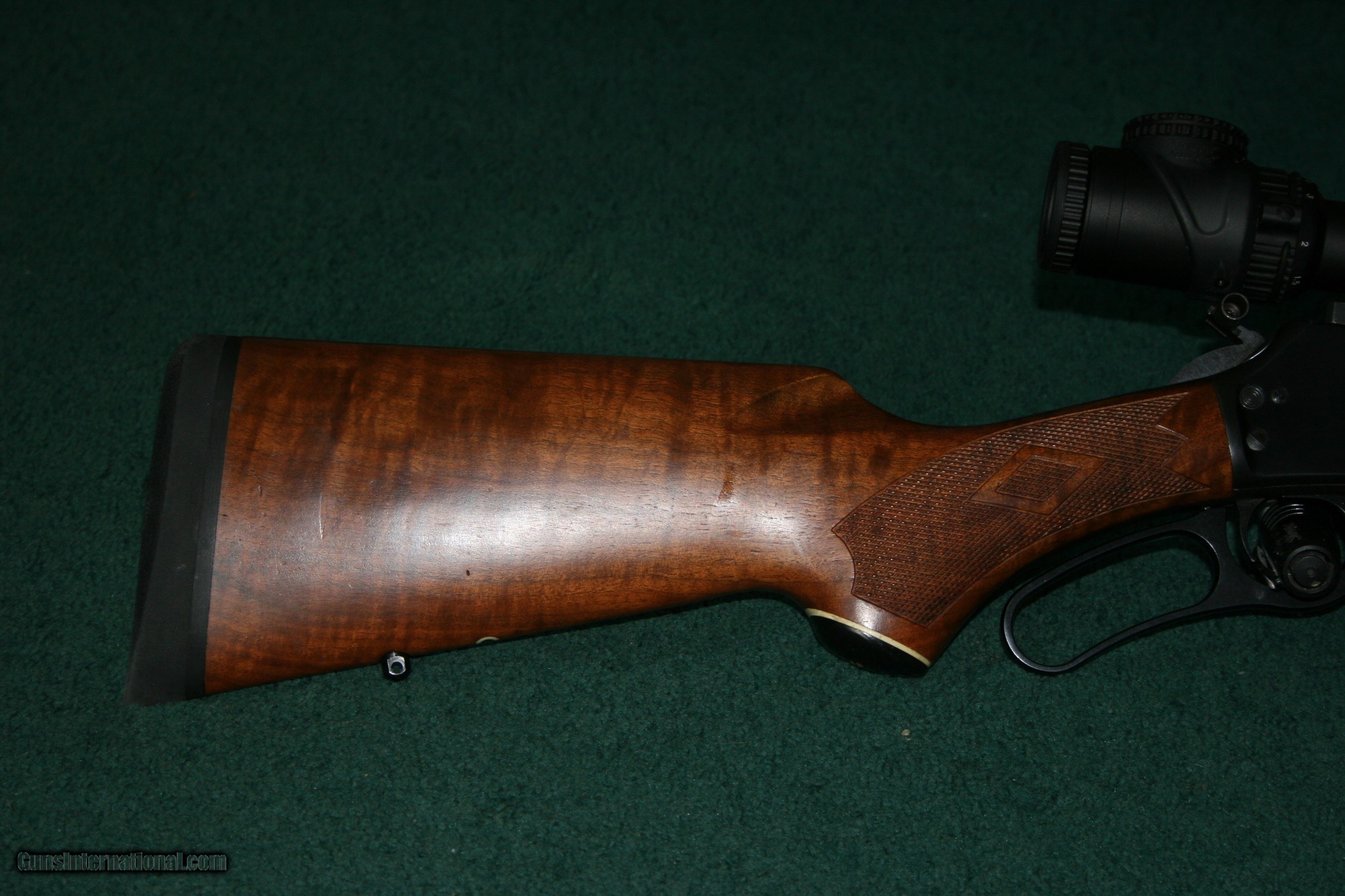 Description: A used, 99%, Marlin 444SS lever rifle with a 22" barrel, in 444 Marlin. It has a Trijicon Accupoint 1-6x24, 30mm tube, scope on it with Leupold steel QR base and rings along with the Trijicon scope cover. In the photo that shows the left side of the rifle, it appears that there is a scratch on the frame. There is not any acratches on the frame. The line you see in the photo is lint and has since been removed. Also included in this sale is a case of (200 rounds) of Hornady 444 Marlin 256gr FTX LVR ammuntion and a hard case. The entire package can be had for $2,995.00US + $150.00 shipping and insurance via FedEx. I believe that this rifle was produced in 1996. SOLD Rifle Caliber: .444 Marlin Manufacturer: Marlin Firearms Company Model: 444SS Serial Number: 04017520 Barrel Length: 22 Condition: 99% Metal Condition: 99% Wood Condition: 99% Bore Condition: 99% |