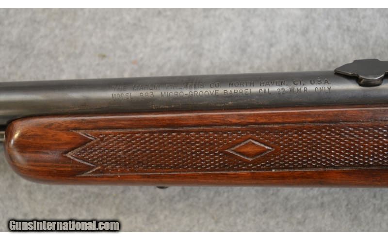 Description: This Marlin 883 JM stamped, chambered in 22 WMR is in excellent condition. This rifle is equipped with a 22" barrel and a 12 round capacity feed tube. This is a great small game rifle, and would make a great addition to any collection. .22 WMR SOLD Chambers: 22 WMR Metal Condition: Excellent Wood Condition: Excellent Bore Condition: Bright and shiny Barrels: 22" barrel Triggers: Crisp Stock Dimensions: 12" stock Fore End: 10" fore end Butt Pad: Rubber butt pad Sights: Iron sights Item Location: Huntsville, AL |