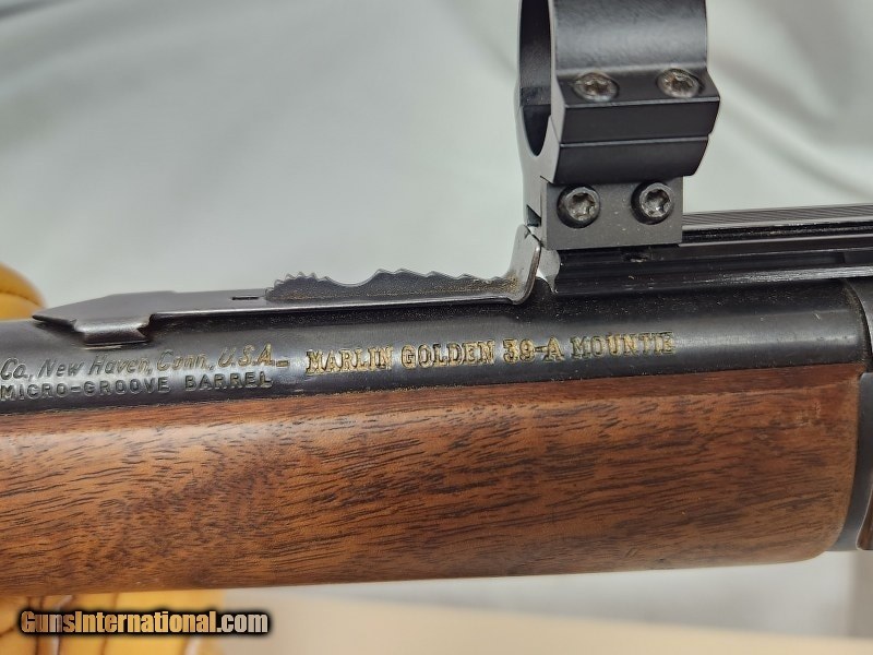 Description: Guns Listing ID: 868395 This is a beautiful blast from 1963 (://oldguns/sn_php/marlinlookup.php). Marlin Original Golden 39-A Mountie 20\" barrel with 13-3/8\" length of pull. Will shoot .22 LR (20 rounds), shorts, and longs. Barrel is stamped with the highly desirable \"JM\". Has the original Marlin butt plate. Also has weaver rings and bases installed. Bore looks AMAZING. No rust or pitting on the barrel or the receiver. Stock has a few dings (pictured), but other than that, this gun looks great for being 6o years old! SOLD Manufacturer: MARLIN Model: GOLDEN 39-A MOUNTIE Caliber Info: 22 S/LR Condition: Used - Non-Certified Barrels: 20 BARREL Finish: BLUED |