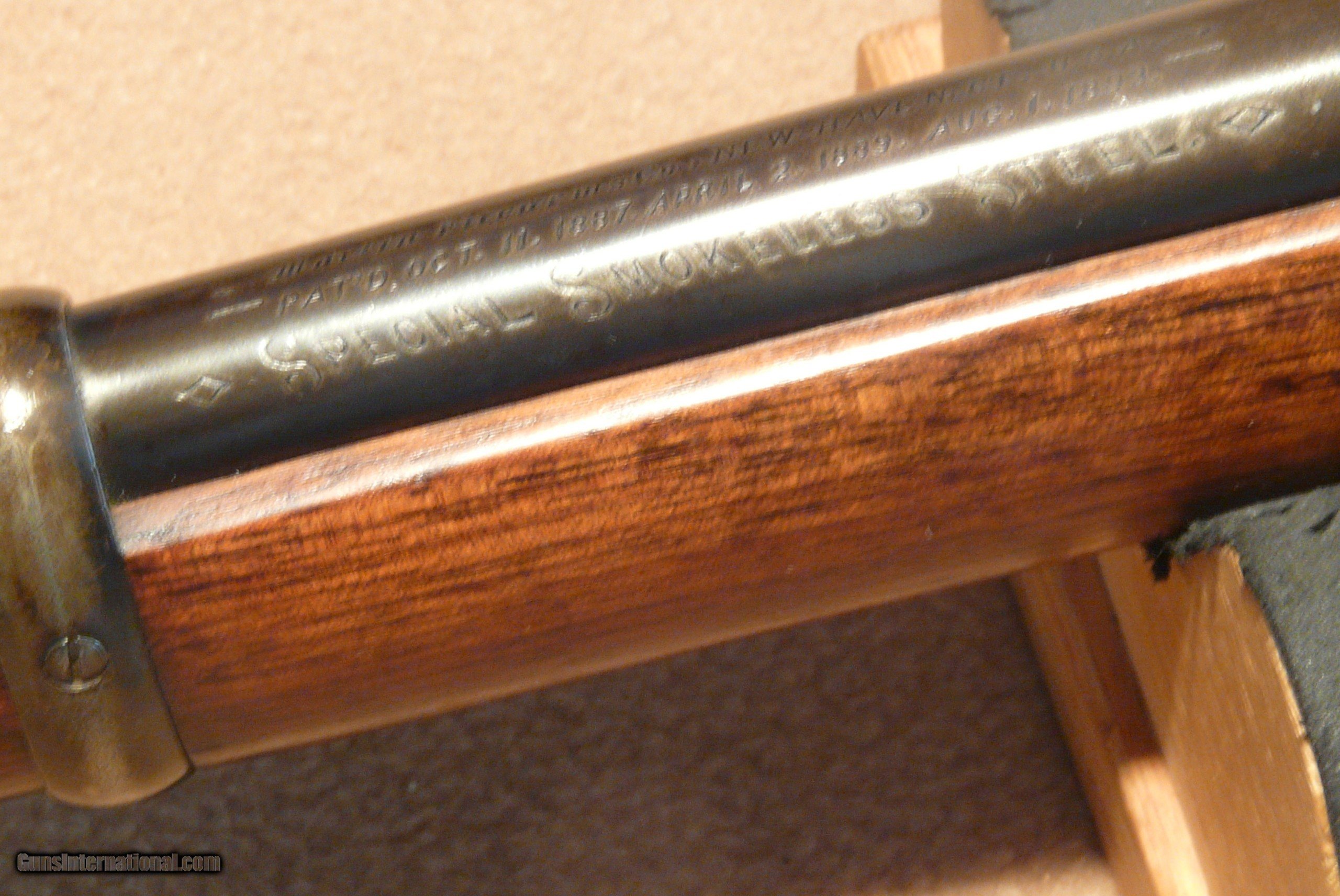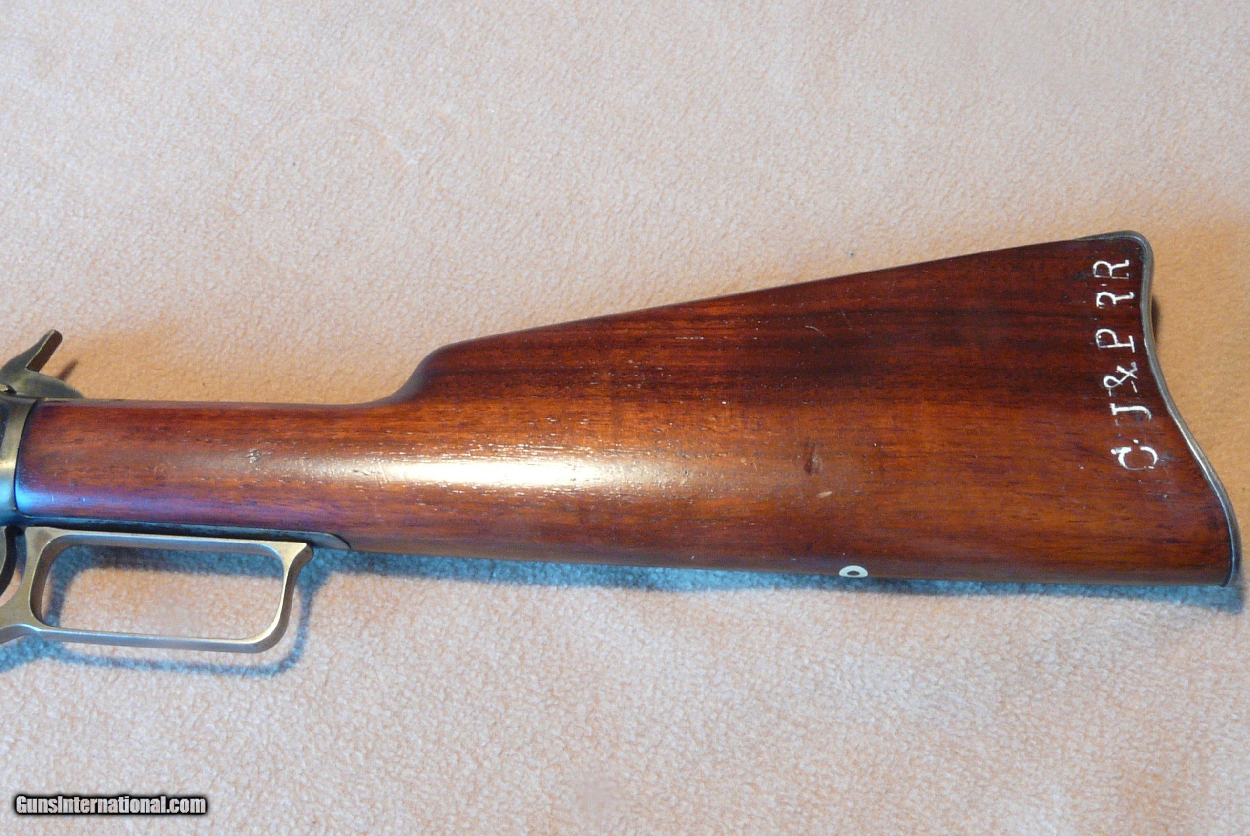 Description: Serial # 2257 on this 93 Marlin Carbine, in rare orig. condition, Traces of case color and orig blue w/Patina, with Exc Bore, in 30-30 cal w/ orig carbine rear sight, orig front sight ! Wood is Exc also, with very little use marks, as you can see in pics ! Slings were not put on R R carbines, Single line stamp Cartouche is visible on left rear of stock, C,U,P,R,R "Central Union Pacific RR" An Exceptional condition carbine, with EXC Bore, that will be a standout in any collection ! SOLD |