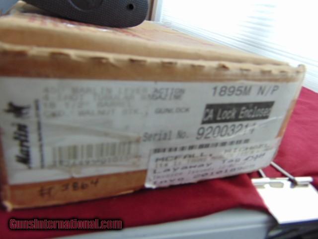 Description: MARLIN MODEL 1895 LEVER ACTION CARBINE. CALIBER 450 MARLIN. SER# 92003214. 18 1/2 INCH BARREL . GUN IS IN EXCELLENT CONDITION WITH ORIGINAL BOX. PREVIOUS OWNER SAID HE BOUGHT IT NEW AND NEVER FIRED IT. COMES WITH ORIGINAL BOX AND PAPERWORK . EASTERN BRANCH FIREARMS ADD 35.00 SHIPPING – HANDGUN USPS PRIORTY MAIL ADD 35.00 SHIPPING – LONG GUNS GROUND SHIPPING Questions e-mail or call Glen at Eastern Branch Firearms 207-215-5021 TERMS – PLEASE READ BEFORE I DO NOT HAVE A LAYAWAY OPTION ( WE ACCEPT CREDIT CARDS ) -- I GET ALOT OF REQUEST FOR TRADES, I WOULD PERFER NOT TO DO TRADES ON MY INTERNET LISTINGS PAYMENT OPTIONS- We accept money orders, cashier’s checks , bank checks. sorry no personal checks. We accept all major credit cards please add 3% to the ’s cash discount price.(Maine Residents to pay 5% sales tax) .Handguns and long guns do need to be shipped separate. PLEASE do not send payment via FED EX . USPS & UPS are fine. Thank you. We include a signed copy of our FFL with each firearm shipped. SAFTY NOTICE- Buyer is solely responsible for determining that a used gun is safe to shoot. The firearms offered have not been test fired but have been given a visual inspection only for purposes. It is a requirement that every used firearm is inspected by a qualified gunsmith before firing. By , the buyer agrees to hold seller harmless against damages, injury, or death caused by defective merchandise. RETURN POLICY- All firearms come with a 3-day non firing , non messing with ( turning srews ,taking apart,removing parts, scoping. firing, cleaning or messing with in anyway) inspection/return privilege.Inspection is based on a visual review of the gun to confirm the gun is in the condition stated. In the case of a return, buyer pays all shipping charges & if paid for with a credit card buyer absorbs the 3% credit card charges . So please ask questions BEFORE you bid. Thanks for Looking and Good Luck!! U.S. sales only, no exports…this includes antiques. I will ship to third party for exporting SOLD |