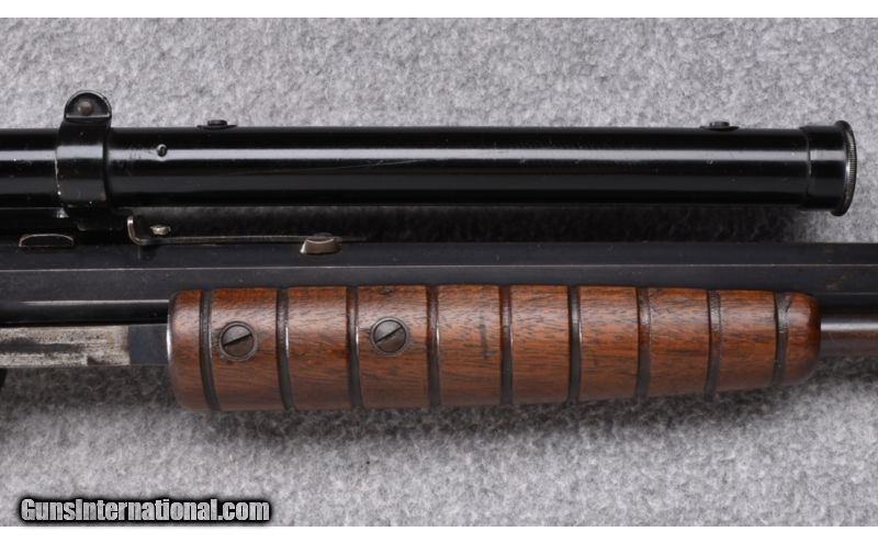 Description: Magazine tube has turned mostly a brown patina with remainder of blue showing light old freckling. Bore remains excellent. Wood shows light use marks and remains free of cracks. SOLD Manufacturer: S/N N/A (1898-1904) Caliber Info: .22 LR Metal Condition: Good Wood Condition: Good Bore Condition: Excellent Barrels: 24" Octagon Triggers: Factory Stock: Uncheckered Walnut Stock Dimensions: 13 1/2" LOP Fore End: Grooved Walnut Butt Pad: Crescent Steel Weight: 6 LB Sights: Bead Front - Notch Rear - Lyman 422 Expert Optic Item Location: Wheeling, WV |