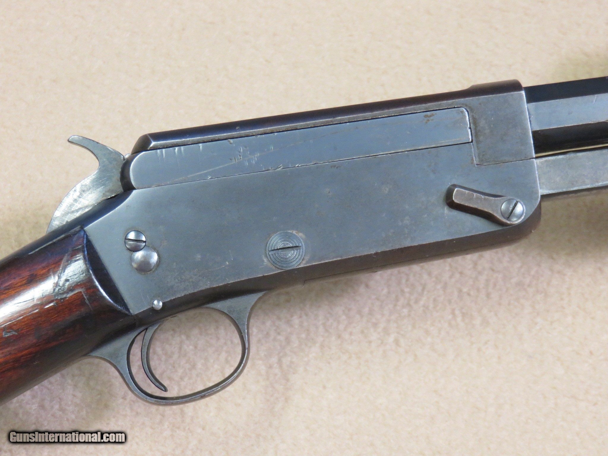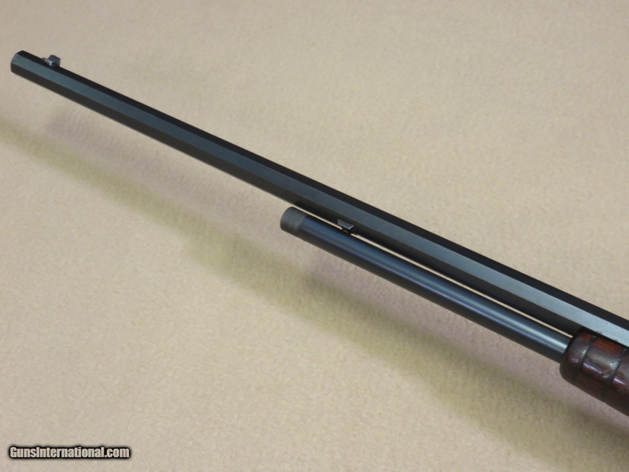 Description: This is a very cool old vintage Marlin pump rifle. This is a Model 27-S rifle, an improved version of the Model 27 which had a safety button on the right side of the receiver. Introduced in 1911, the Model 27-S was made until the outbreak of World War 1 at which point production was halted until the end of the war, when production was resumed until 1932. The Marlin 27-S pump-action rifle featured a take-down design and was offered in .25RF, .25-20 WCF, and .32-20 WCF in a round or octagon 24" inch barrel, with a 7-shot tubular magazine mounted under the barrel, and a Walnut straight-grip stock set. This particular example is serial number 14705, and was made circa 1914-15 pre-WW1. It is in 100% original condition and is completely functional. The original factory blue finish rates 75% or better, and has a great consistent look to it. The blue shows some age, some spots of prior surface rust, and some handling marks that you would expect from a 100 plus year old gun. It was certainly used/carried at some points during it's life but apparently was well cared for. The receiver has never been drilled and tapped for optics and the original iron sights are still intact. The bore in this Marlin is good overall. It shows some strong rifling with prominent lands and grooves. There is some light pitting throughout but nothing major, and we are confident that it would shoot very well today. Many of these Model 27-S Marlins have terrible shot-out bores given that corrosive ammunition was the standard when many were built. The original factory Walnut stock set is in great shape oversall. It shows some dings, dents, and handling marks from use but also has a great deal of original vanish on it still intact. Both the forearm and buttstock appear to be free from cracks or repairs, and the original crescent shaped metal buttplate is still in place and tight to the wood. Everything on this interesting Marlin works as it was designed to. The action is still nice and tight and all of the controls work properly. The rifle takes down into two pieces with ease, and goes back together nicely. The internals of this Marlin do not show much wear and everything fits together tightly without any slop. If you have been looking for a cool and unique vintage pump rifle for your collection made by one of America's famous gunmakers, this Marlin Model 27-S would be an excellent choice. With .25-20 ammunition available at most gun stores it could be enjoyed at the range as well. SOLD Curio/Relic: Yes Manufacturer: Marlin Model: Model 27-S Serial Number: 14705 Caliber Info: .25-20 Bore: Good Condition: Very Good Manufacture Date: circa 1914-1915 |