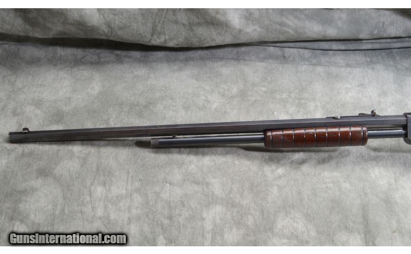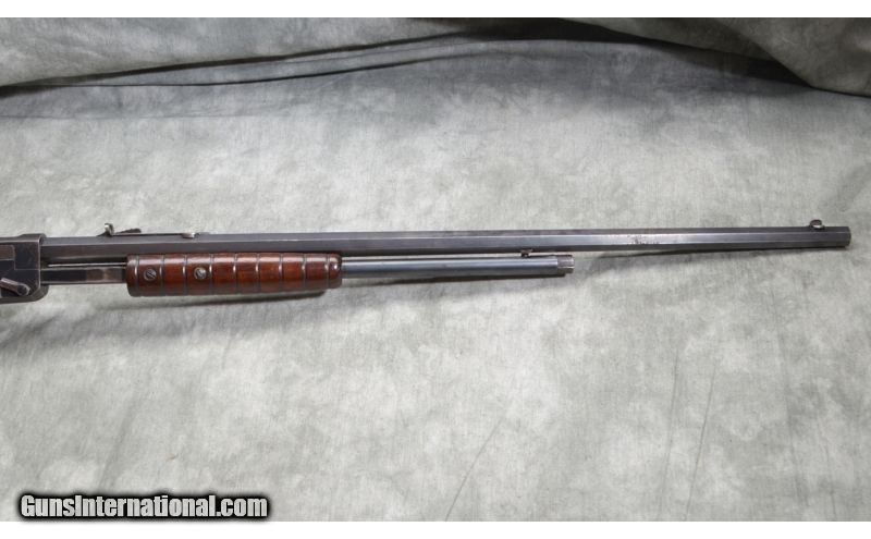 Description: Marlin's contribution to the slide action market circa 1912... This is the one with the safety button on the side. SOLD Curio/Relic: Yes Manufacturer: circa 1912 Caliber Info: .32-20 Winchester Metal Condition: Good to very good. There are some dents on the sharp barrel edge. Overall there are scatterred pits but the bluing is very good. Wood Condition: Good. Honest wear. Bore Condition: Shiny, bright and serviceable Barrels: 24 Inch, Octagonal Stock: Smooth walnut with shallow "perch belly" shape Stock Dimensions: 13 - 1/4 inch LOP Fore End: Grooved walnut "corn cob Butt Pad: Curved steel plate Weight: 5 lb - 13 oz Sights: Gold bead and semi-buckhorn open sights, drilled and tapped for receiver sights. Item Location: Rogers,, MN |