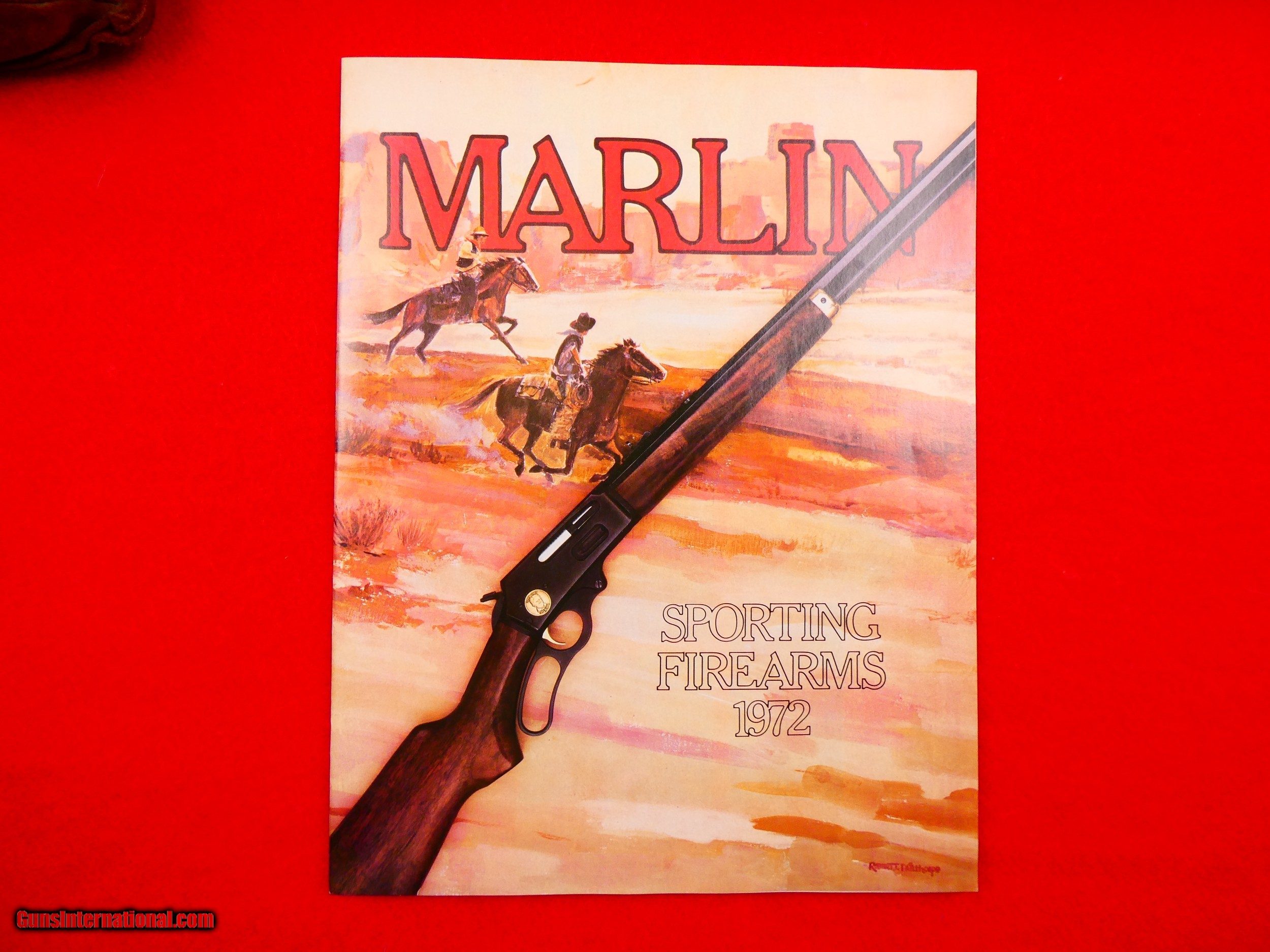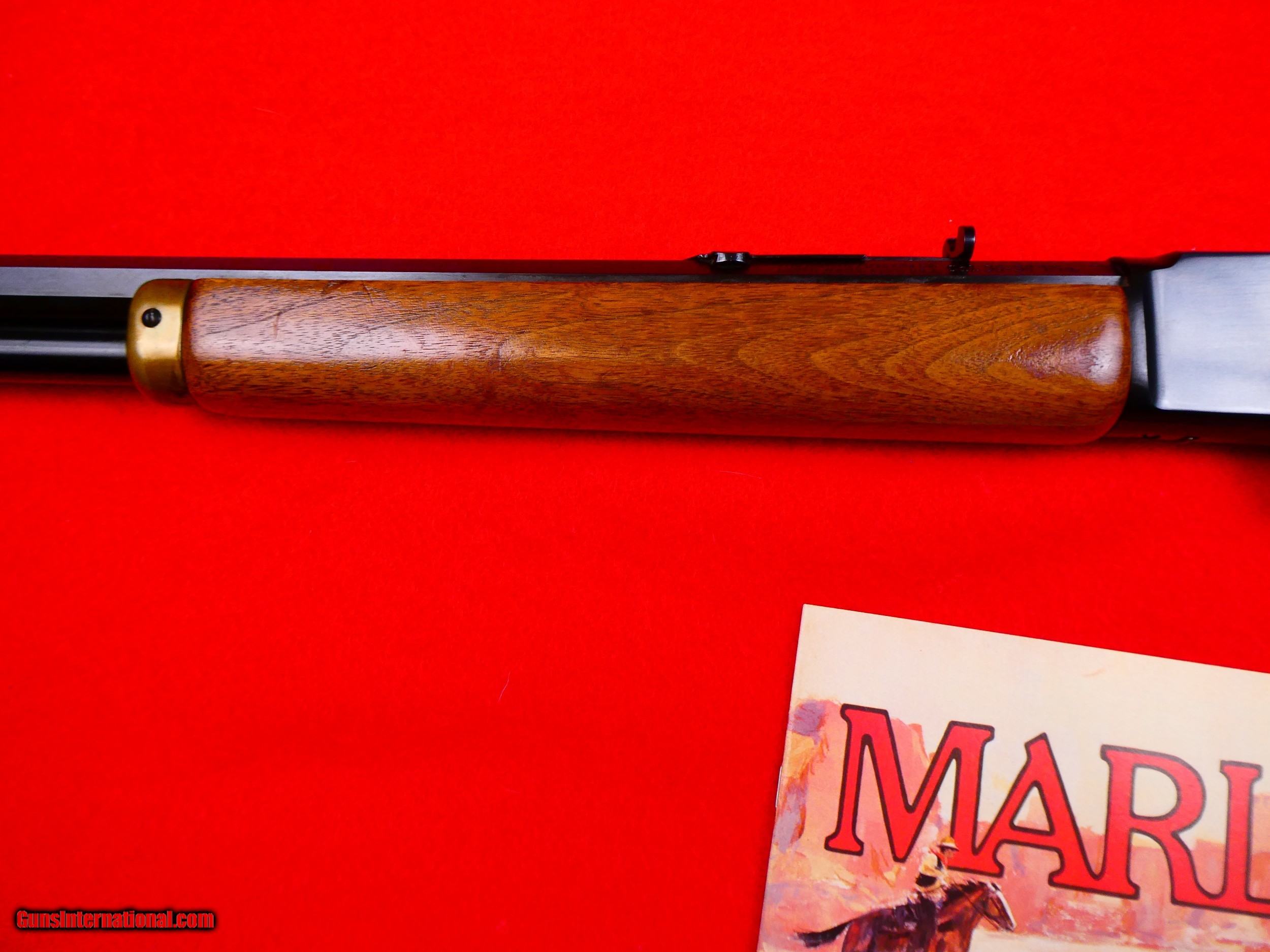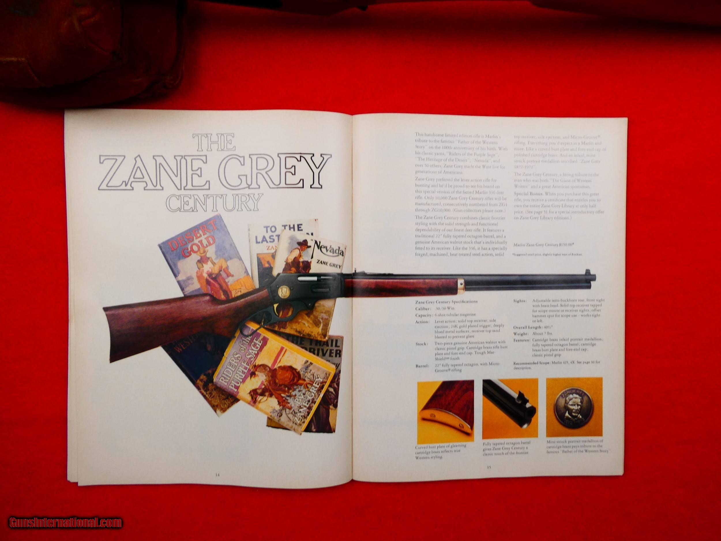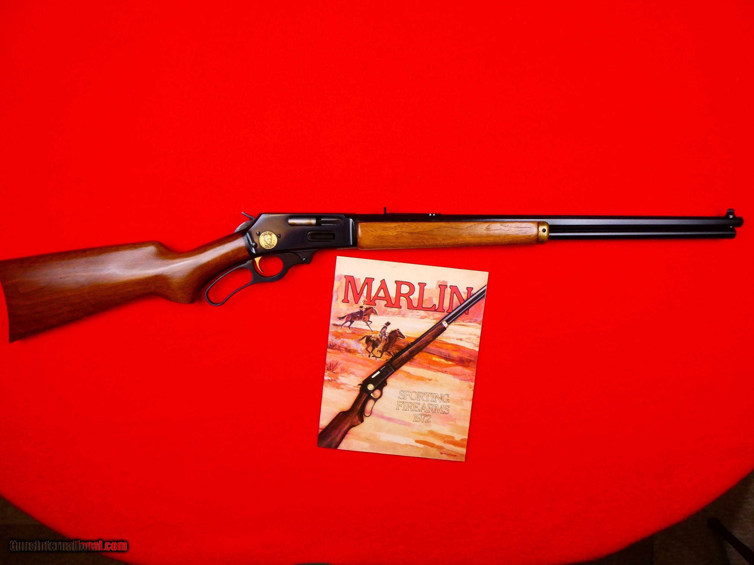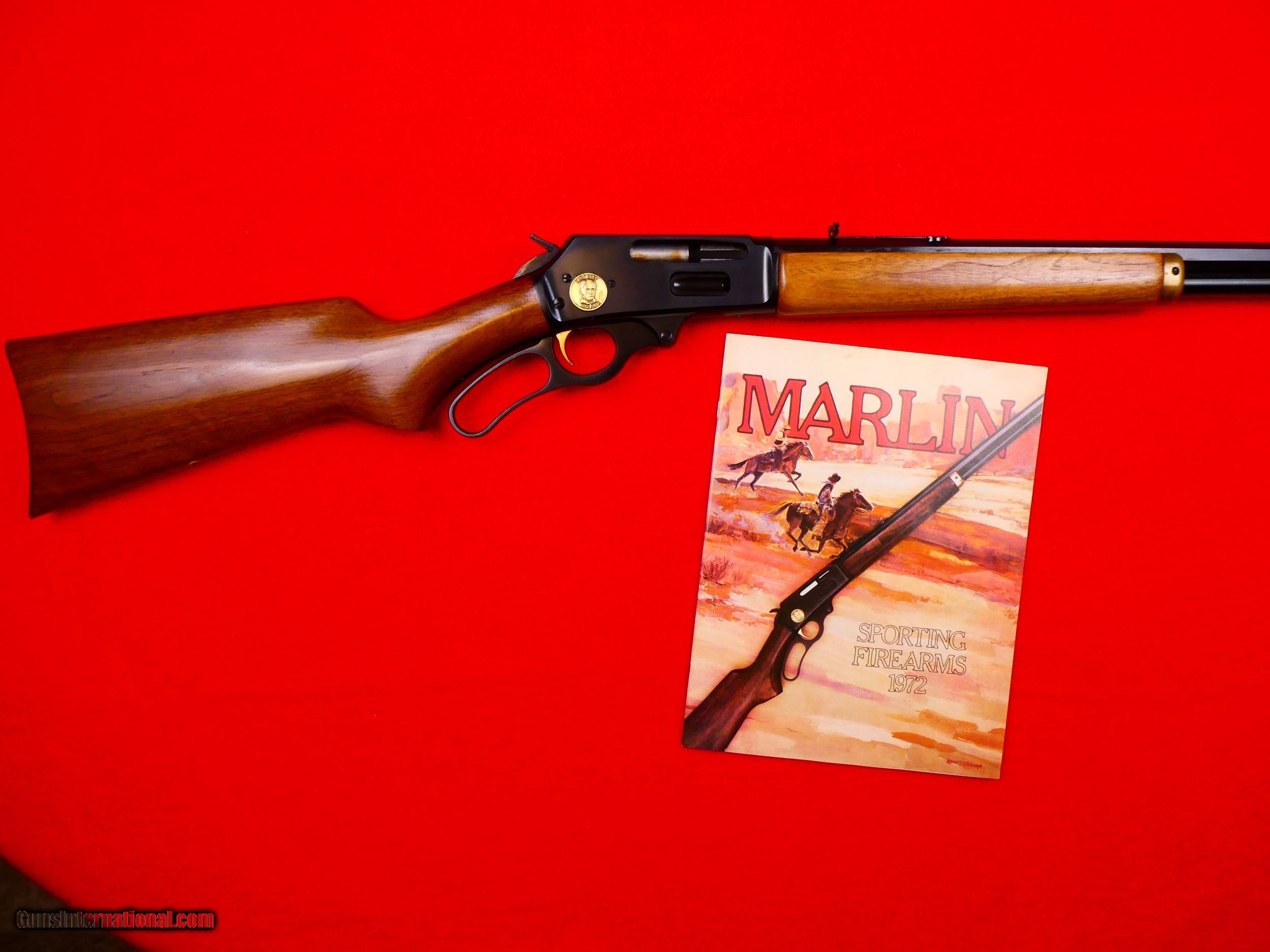 Description: ***SOLD*** Marlin Model 336 "Zane Grey" Commemorative carbine, 30-30, Made to commemorate Zane Gerys 100th birthday,1872-1972, These were made in 1971 and sold in 1972 only, Ser # ZG01762, Brass buttplate & forearm cap, Medallion inlaid in receiver, 22 inch tappered octagon barrel, Open sights, Factory drilled and tapped for scope, Gold trigger, Select walnut pistol grip stock has very minor handling marks, Bluing is excellent, Rifle has been used and fired but is in excellent like new condition, 7871 made in 1971 only, Comes with original new old stock 1972 Marlin catalog with this model on cover. Layaway Available Personal Property of David Walters SOLD |