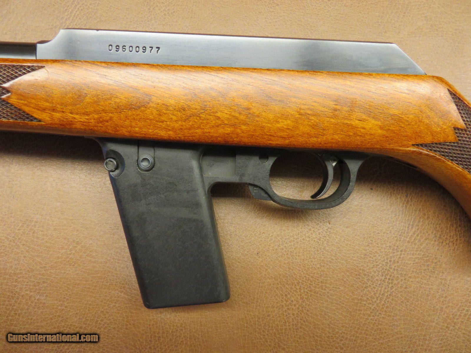 Description: .45 A.C.P. has 16 1/4 inch barrel with original sights including orange front. Checkered wood stock with sling swivel studs and a replacement butt plate. Takes any 1911 magazine and comes with one factory Marlin mag. There is a solid repair to the stock on right side at rear of receiver and there is a slight ring in the bore about 6 inches from the muzzle. Has had a new recoil buffer installed and shoots great. 90-95% finish. SOLD |