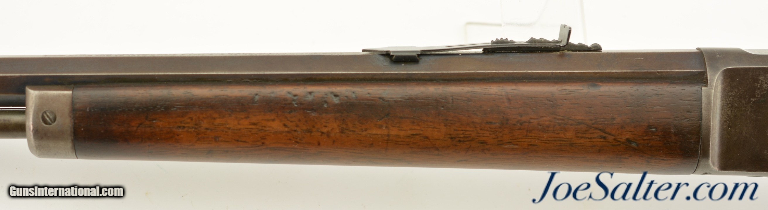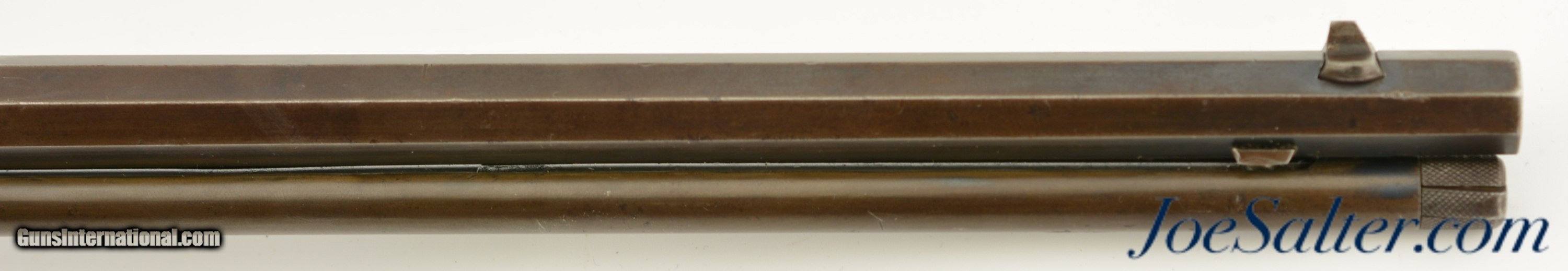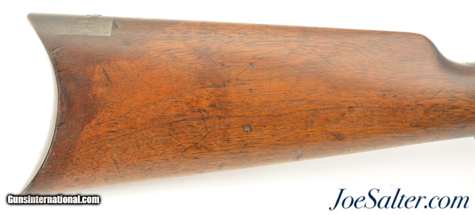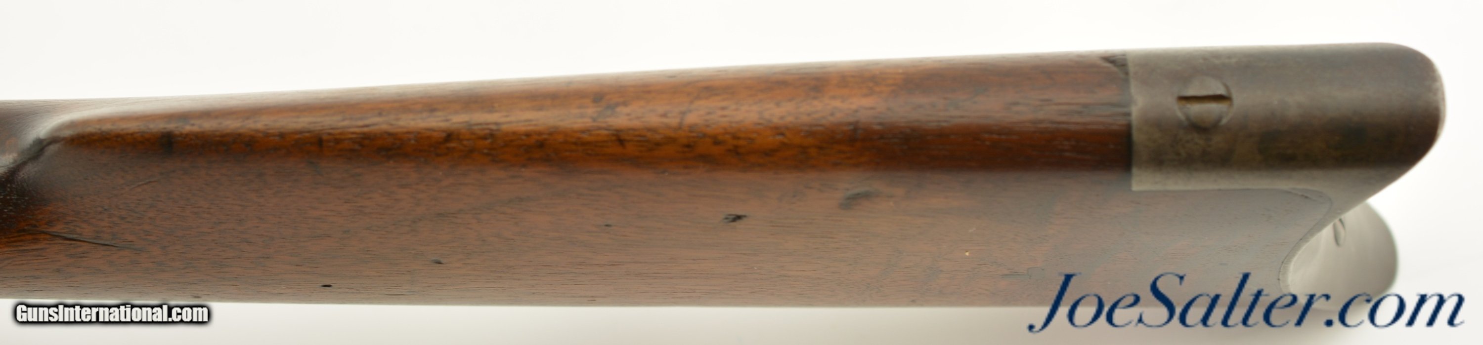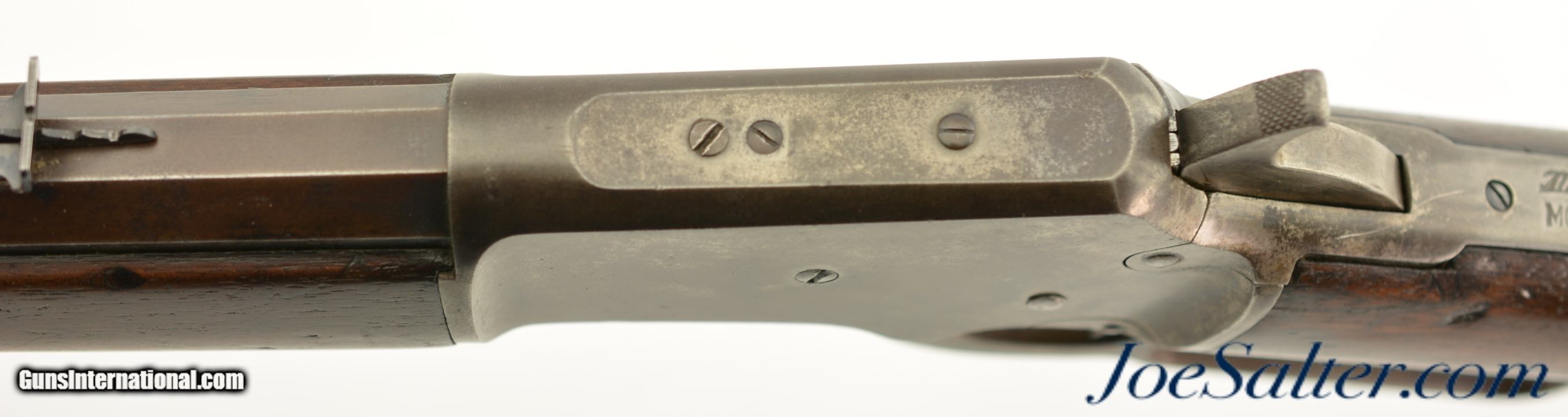 Description: Serial #359008, .22 S,L, LR, 25 inch octagonal barrel with a fine,dark lightly pitted bore with moderate rifling that will still spin a bullet. This is the Model 97 manufactured between 1905 and 1922 as indicated with the model designation on the tang. In fine plus overall condition the barrel retains perhaps 75-80% of the original finish which is now mostly turned plum-brown with silvering on the high edges with scattered scratches and tiny impact marks. The receiver shows a mottled pewter gray with light scratches and impact marks. The walnut stock is solid with slight shrinkage around the tang with some small missing chunks of wood and some scattered contusions overall. Mechanically it functions properly with a very smooth action and nice trigger. A very nice Model 97 that would be a great candidate for a full cosmetic restoration. SOLD Curio/Relic: Yes |