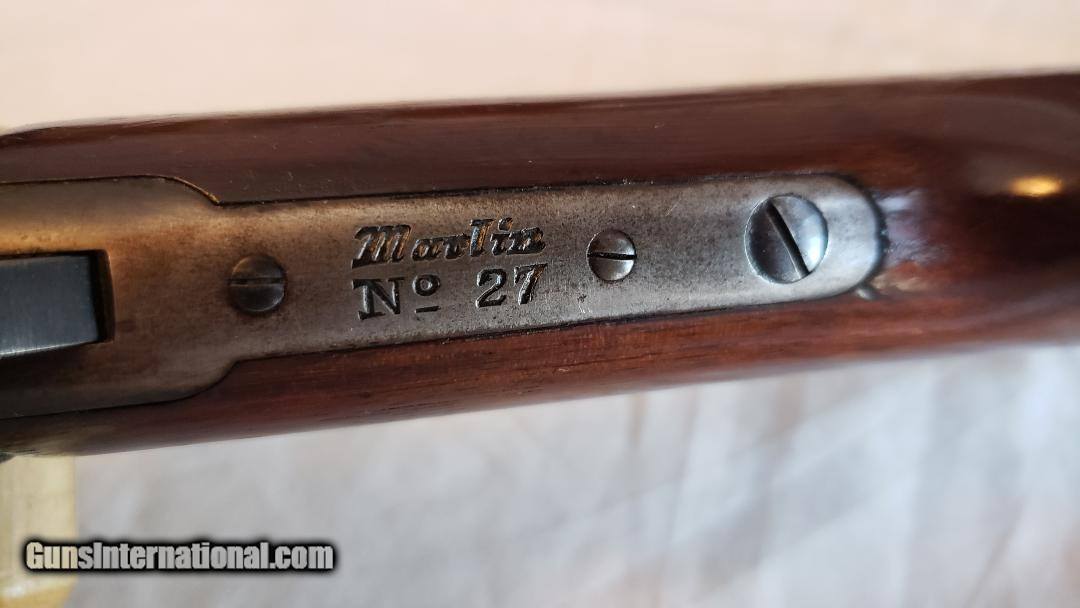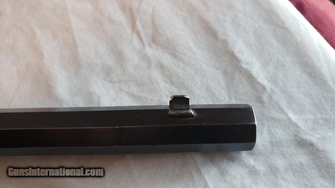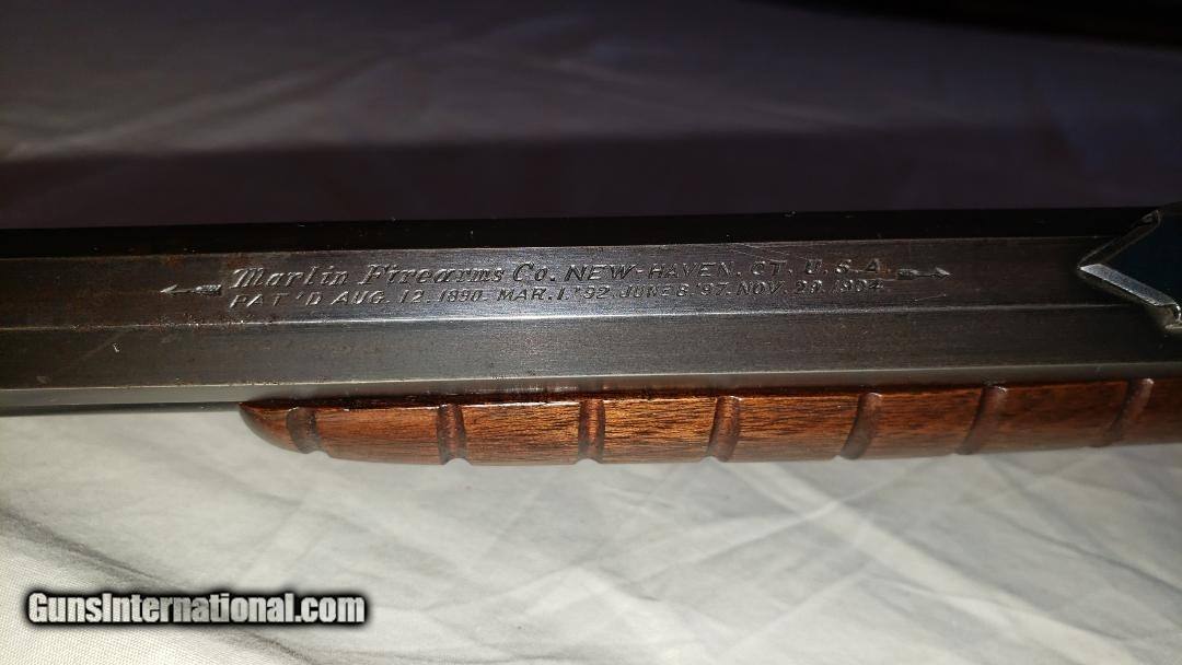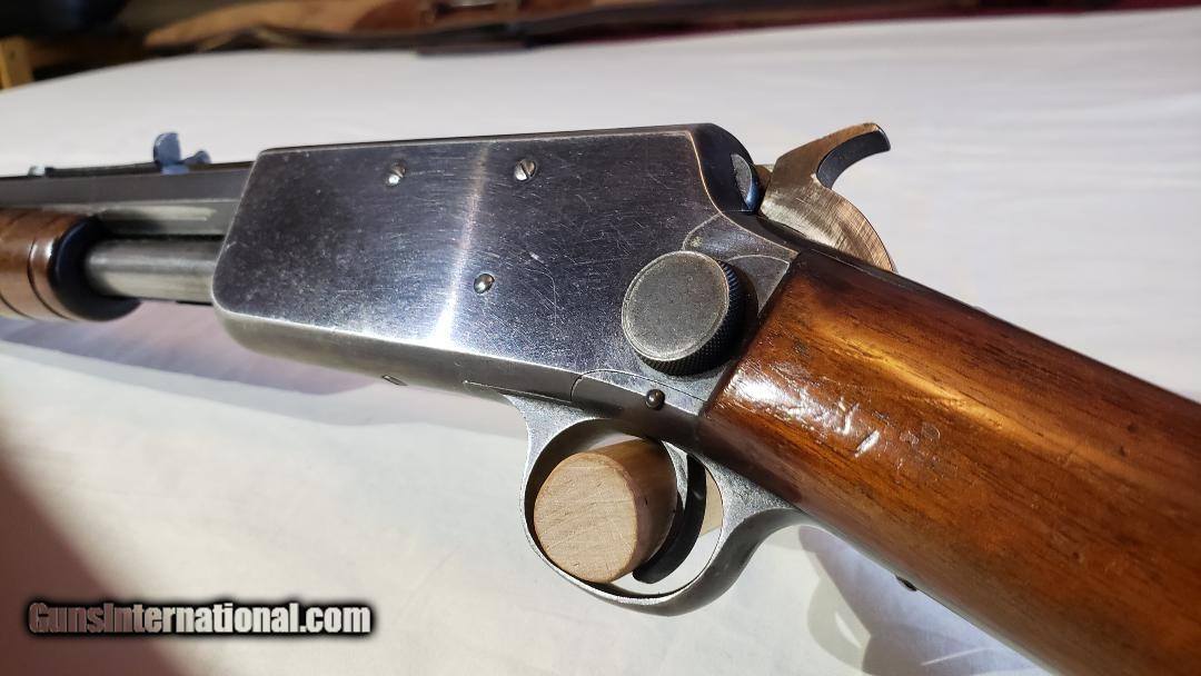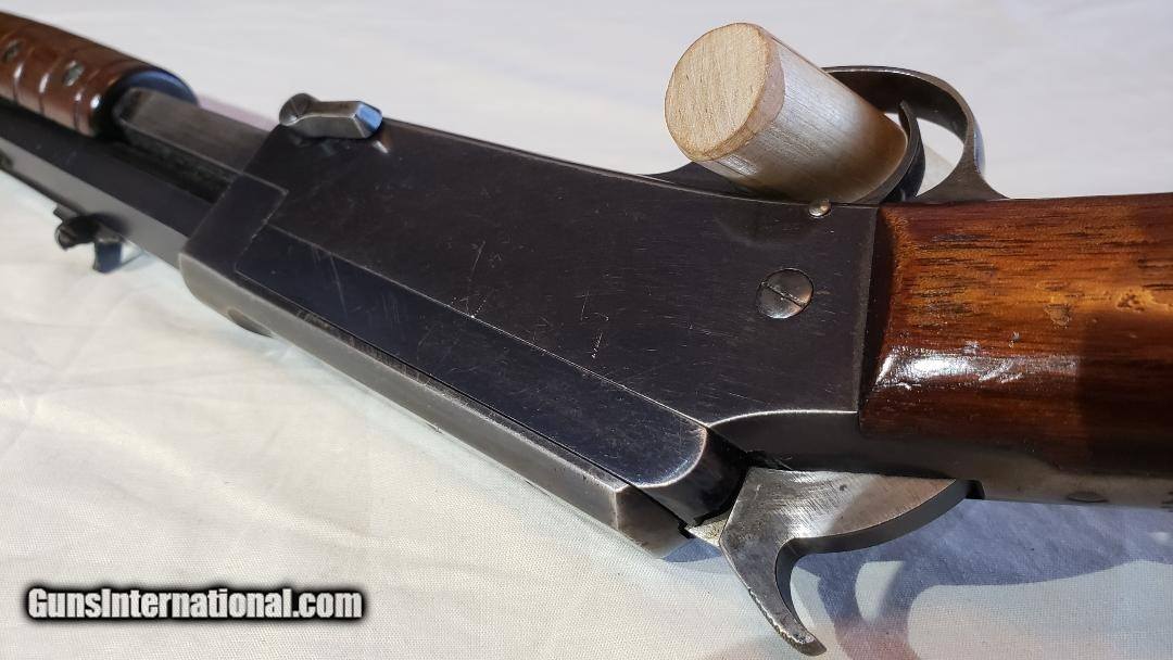Description: This is an excellent example of the scarce model no. 27 in 25-20 center fire slide action. The model 27 without the S, suffix which means it does not have the de-cocking slide button on the right side of the receiver. Blue Book states it was built in 1910-1911 only, while the Standard Catalog states 1910-1916. The 24 inch octagon barrel has a VG to Exc. bore, with the correct and original sight package. Factory blue rates a strong 85-90% overall, with loss at the top tang from normal carrying. Wood stock is in great shape as well, showing only minor handling marks to the original finish. Forend appears refinished at some time. All metal to wood fits nicely, with no cracks and only minor imperfections. Crecent butt plate is correct and original. This is about as fine and original example as you could hope to encounter. Lower 48 states only. Payment by Postal Money Order. Add $45.00 shipping and insurance. SOLD Manufacturer: Marlin Model: no. 27 Serial Number: None Caliber Info: 25-20 |