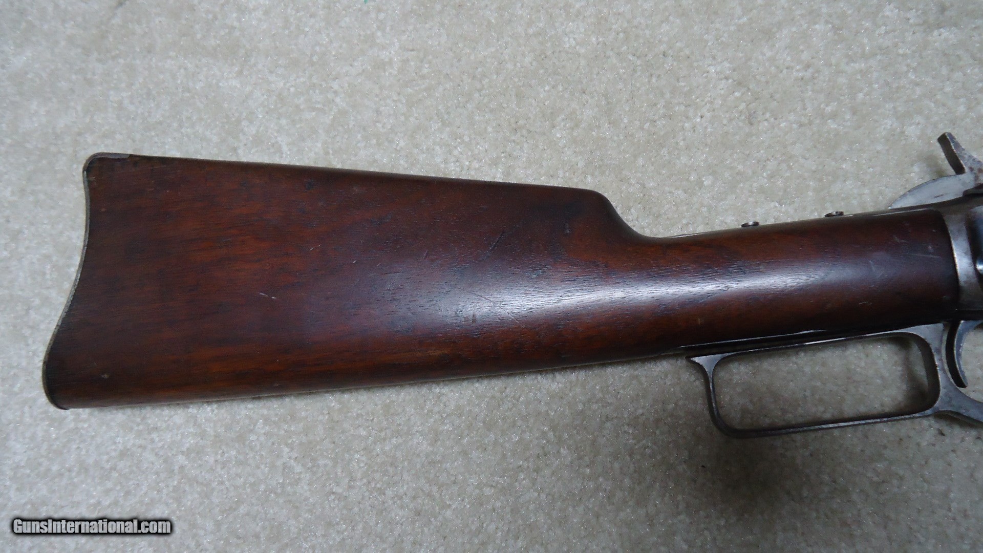 Description: SCARCE SADDLE RING CARBINE M-'94 IN .32-20 CALIBER, #357XXX, MADE C. 1907. Any Marlin saddle ring carbine in any model is more rare than most collectors realize. Later carbines made without the saddle ring are more common, but even these don’t show up frequently. This carbine has excellent walnut forearm and stock with correct steel carbine butt plate. The receiver is mostly gray/brown with good blue in the more protected areas (carbine receivers were usually blued while rifles had case colored receivers). The barrel and mag tube show good, thinning blue with excellent correct markings and original carbine ladder sight with slide intact. Probably had a tang sight on at one time as the normal tang sight mounting screws are in the factory drilled holes, but the tang sight has been removed. Bore shows a little wear and appears to have some leading in the grooves that should scrub out- when I got this one I ran a couple of patches through the bore and they came out black, but improved the bore greatly. Tight action. Nice, honest appearance and quite hard to find these days. SOLD Curio/Relic: Yes Manufacturer: MARLIN Model: M-'94 SADDLE RING CARBINE Serial Number: 357XXX Caliber Info: 32-20 Condition: FINE Barrels: 20 |